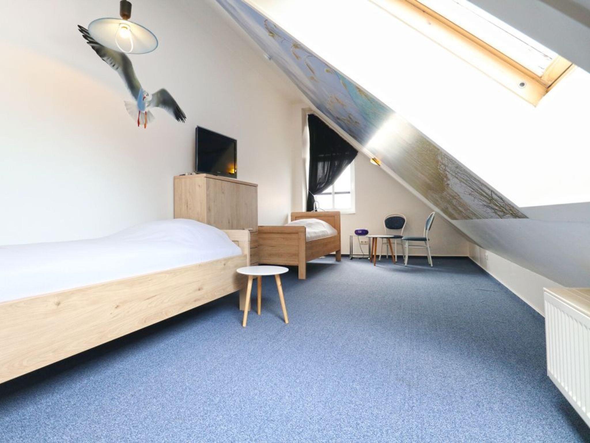 Zudem bietet die untere Wohnetage ein separates Schlafzimmer mit Doppelbett und Kleiderschrank. Auch ein Duschbad mit Waschtisch und WC ist hier vorhanden. Über eine Wendeltreppe erreichen Sie die Maisonetten Etage mit einem weiteren Schlafbereich, welcher mit zwei Einzelbetten, Kommode und Fernseher eingerichtet ist. Hier angrenzend ist ein zweites Duschbad mit Wachstisch, WC.