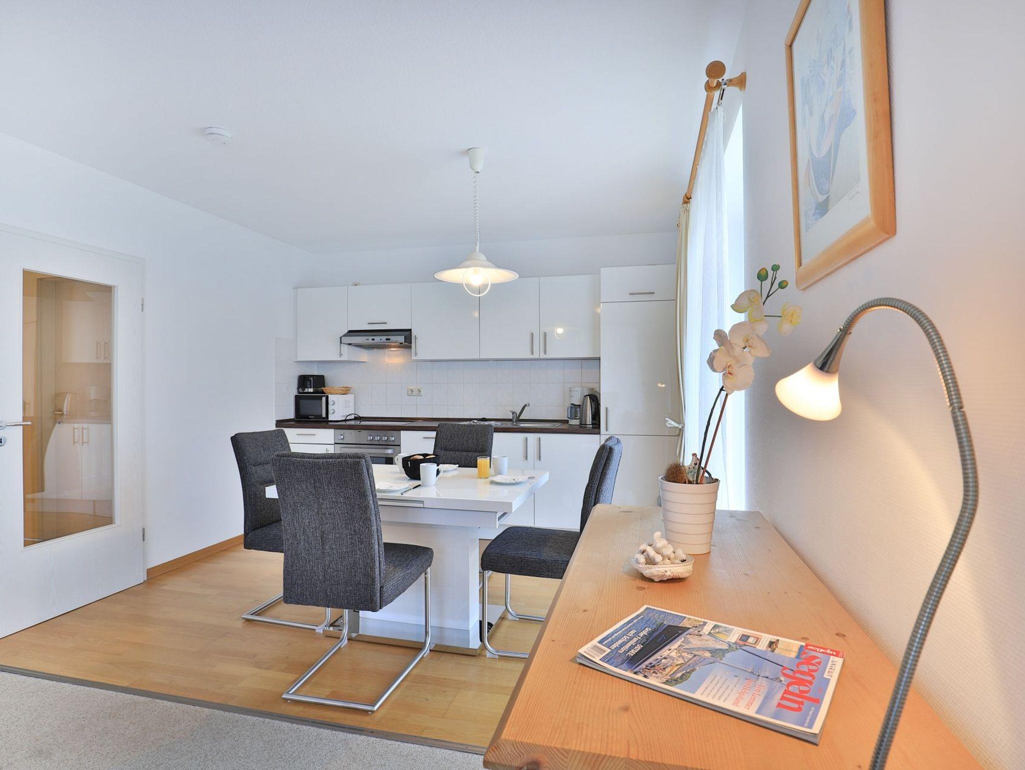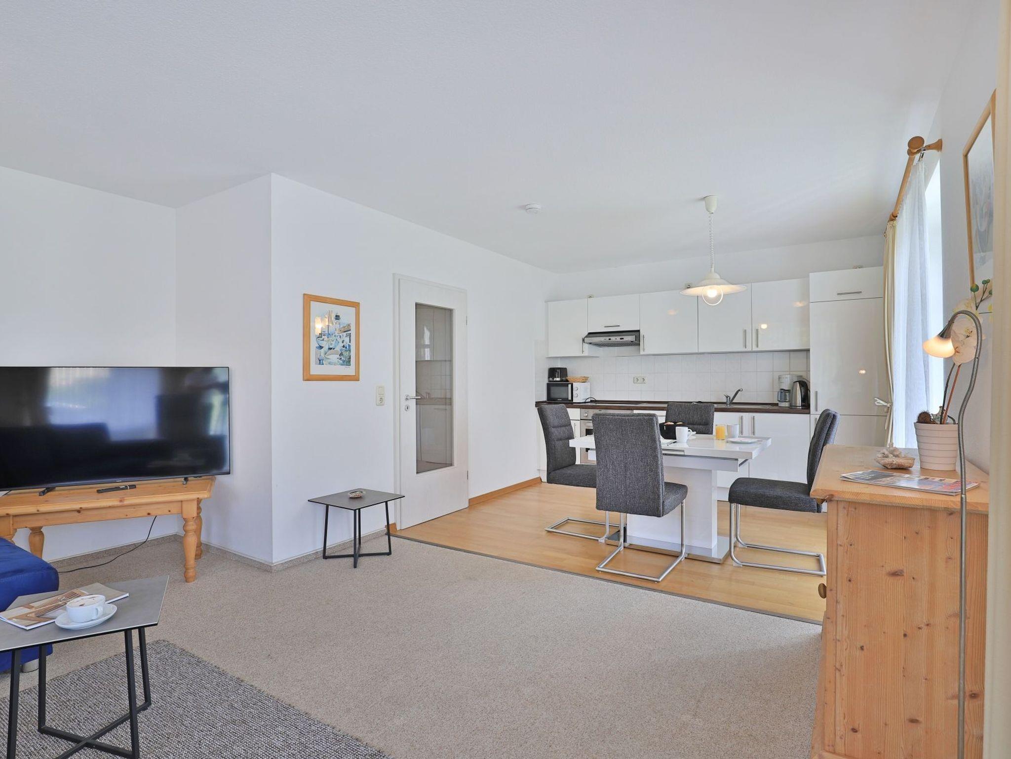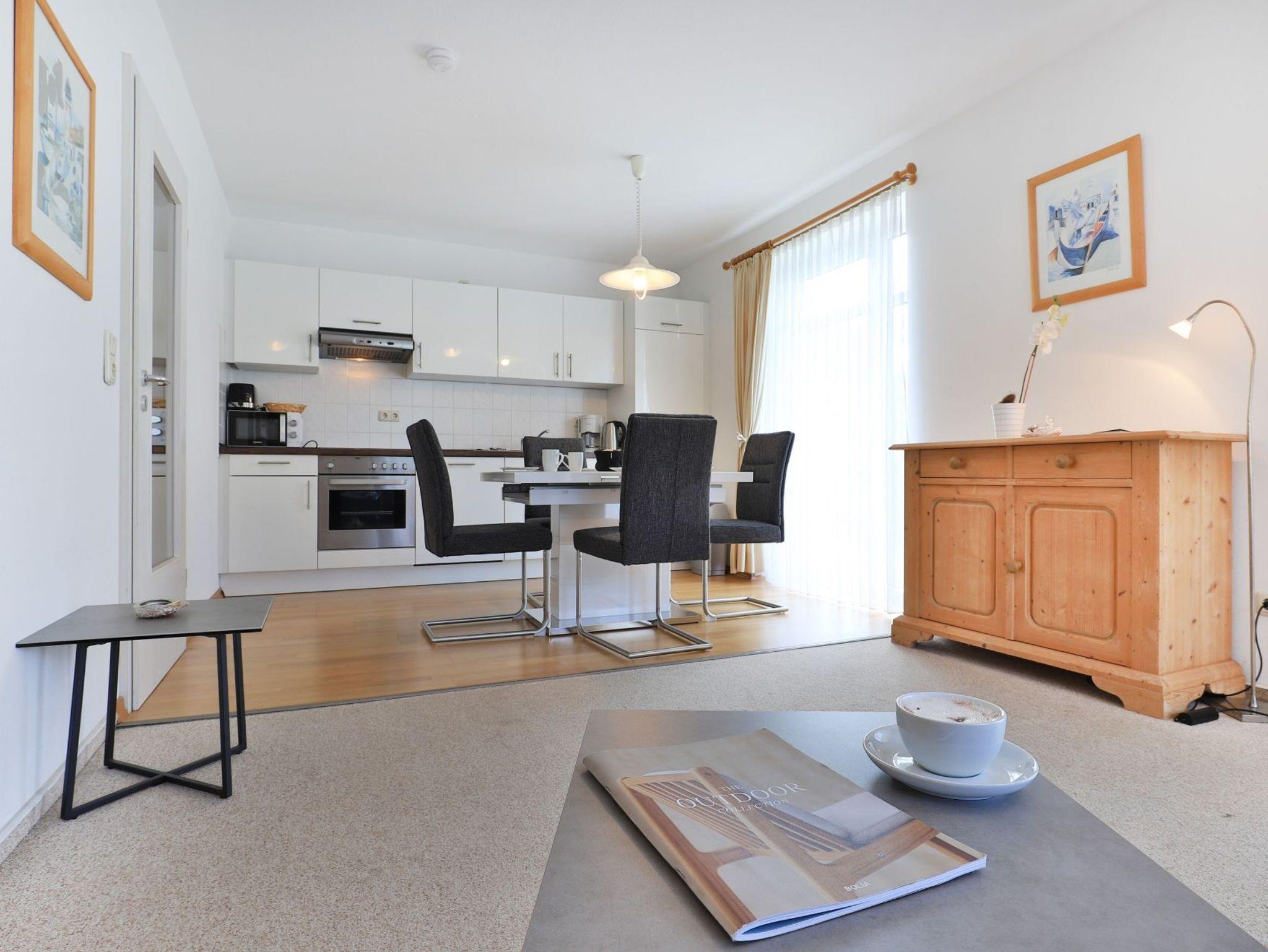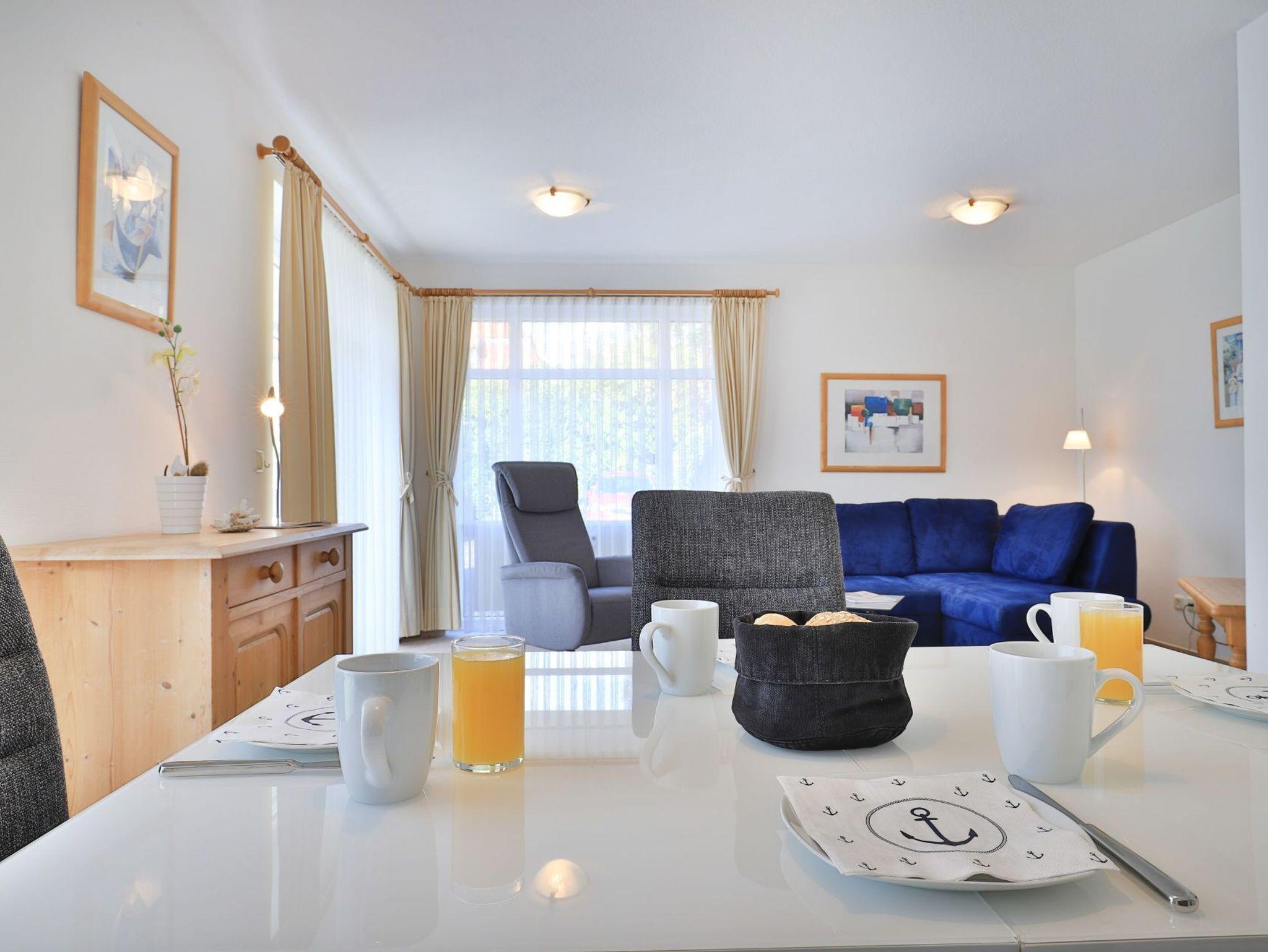 Es empfängt Sie mit einer Wohnfläche von 50qm die gut ausgestattete 2-Zimmer Ferienwohnung mit saisonal möblierter Terrasse. Mit maximal 4 Personen können Sie nur 200 Meter zum Strand einen entspannten Urlaub genießen. Der liebevoll möblierte Wohnbereich ist mit Fernseher Sky Empfang, Musikanlage, Esstisch sowie einem Schlafsofa eingerichtet, welches zwei zusätzliche Schlafgelegenheiten ermöglicht. Die offene Wohnküche ist ideal ausgestattet, um sich auch während der Ferien bei Bedarf selbst mit Mahlzeiten versorgen zu können. Herd, Backofen, Dunstabzugshaube, Kühlschrank, Kaffeemaschine, Toaster sowie Geschirrspüler sind in der Küchenzeile vorhanden. Für unsere kleinsten Gäste steht ein Kinderhochstuhl bereit. Erholsame Nächte verbringen Sie in einem separaten Im Schlafzimmer mit Doppelbett und einem Kleiderschrank für Ihrer Urlaubsgarderobe. Die Wohnung verfügt über ein innenliegendes Duschbad mit Waschtisch und WC. Nah am Haus ist ein kostenfreier Außenstellplatz für Ihren PKW reserviert. Gegen Gebühr können von allen Hausgästen Waschmaschine und Wäschetrockner benutzt werden. Fahrradunterstellmöglichkeiten sind ebenso vorhanden. Bitte beachten Sie, dass es sich um eine Nichtraucherwohnung handelt, in der Haustiere nicht erlaubt sind.