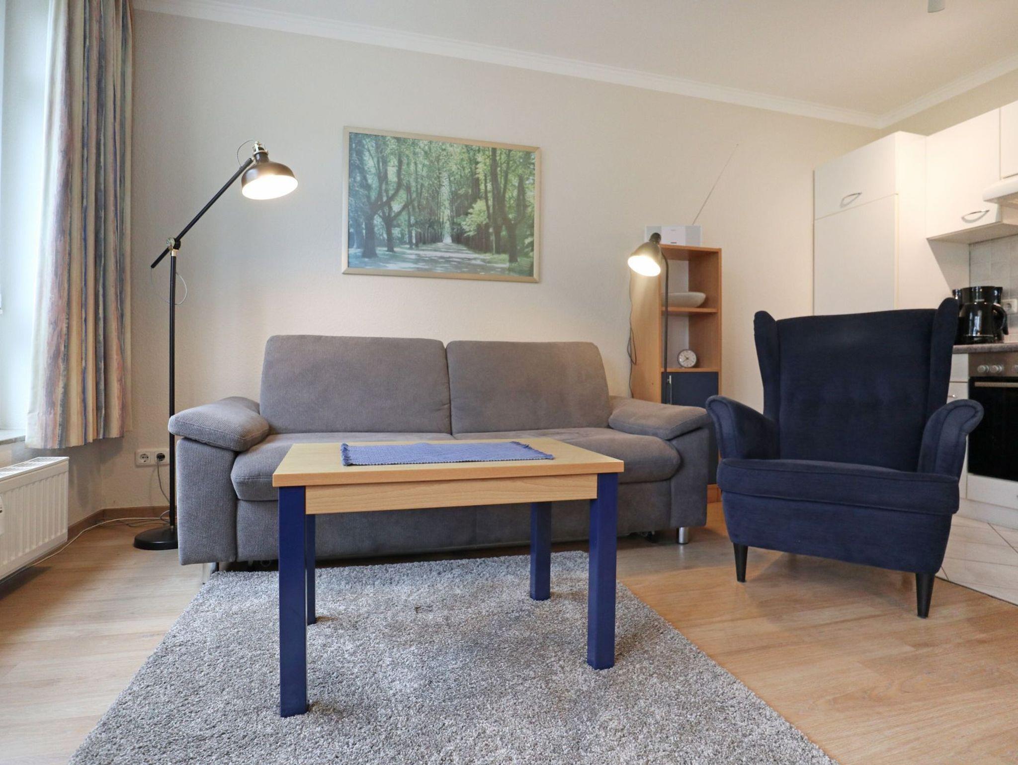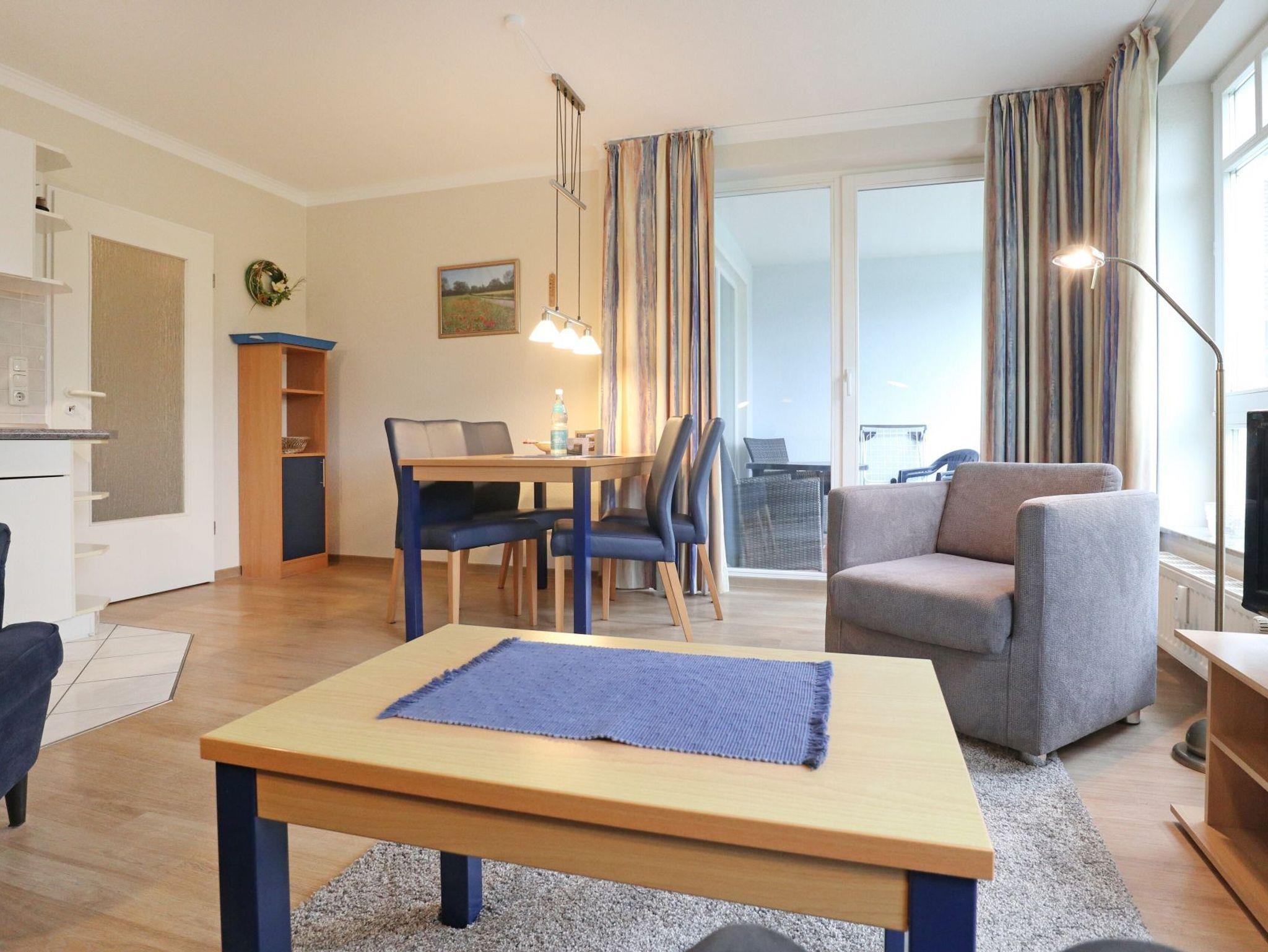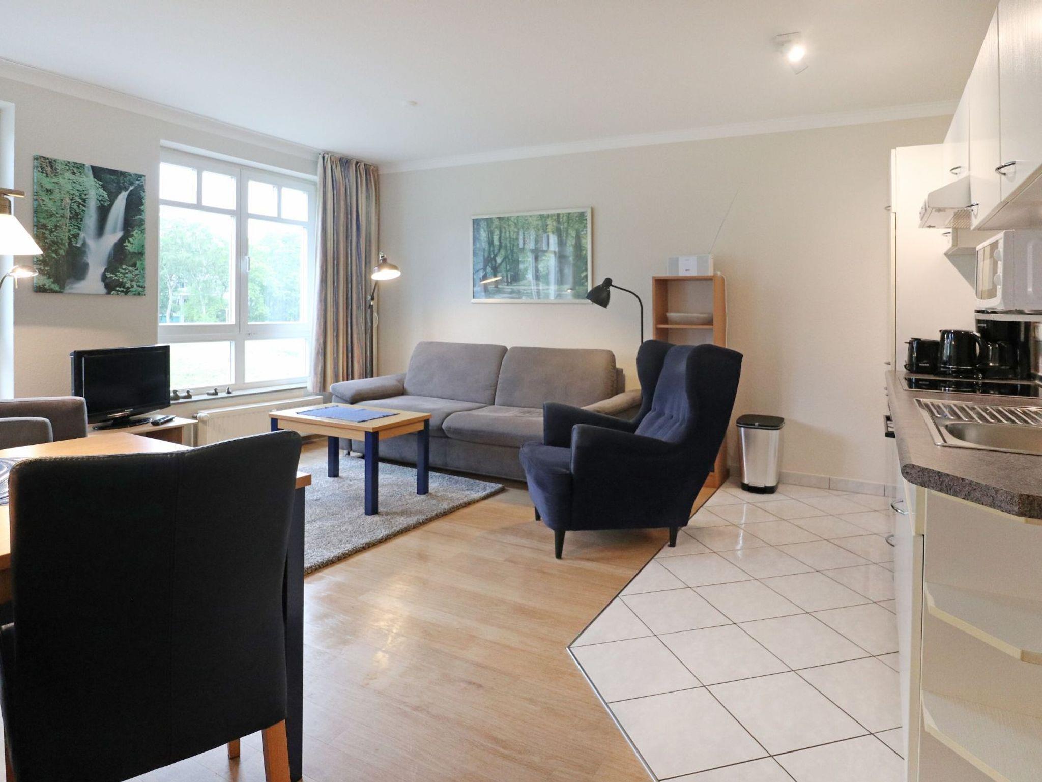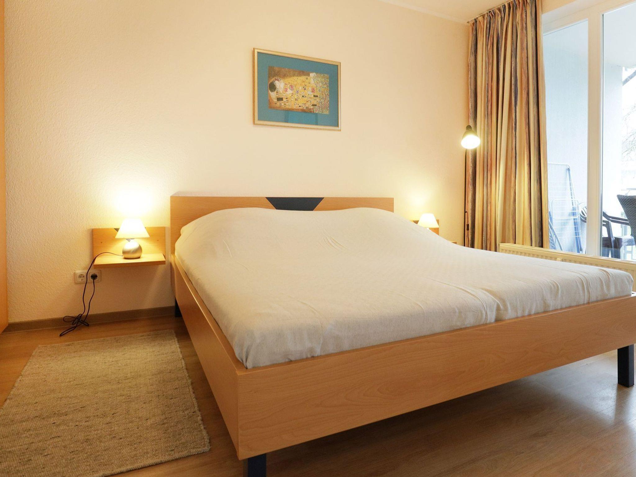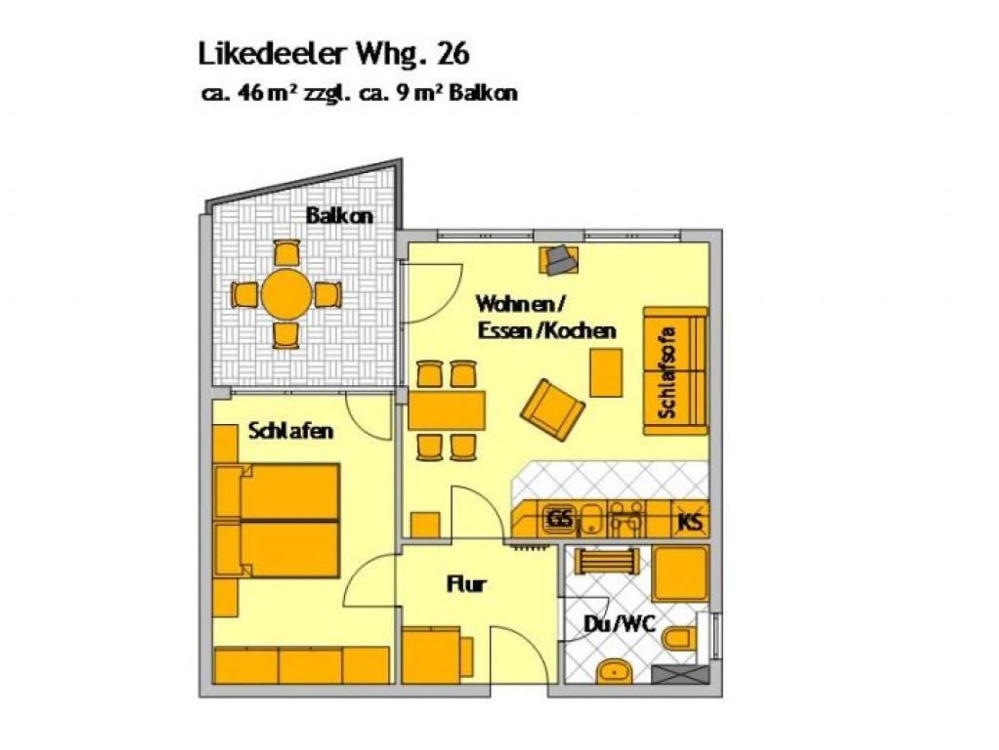 Die 2-Zimmer Ferienwohnung ?Likedeeler 26 ? mit Balkon, befindet sich im 1. Obergeschoss und besitzt eine Wohnfläche von 49qm. Mit bis zu 4 Personen können Sie die Allergiker geeignete Wohnung bewohnen. Das Appartement ist komfortabel möbliert. Der Wohn-/Essbereich empfängt Sie mit einem Sofa, welches als ausziehbare Couch zwei zusätzlichen Schlafplätze ermöglicht. Ein Lehnsessel sowie ein Esstisch mit vier Sitzplätzen sind ebenfalls vorhanden. Für technische Unterhaltung befinden sich ein Fernseher, DVD-Player sowie Musikanlage in der Wohnung. Den Internetzugang über WLAN nutzen Sie kostenfrei. Dür Selbstversorger befindet sich im Wohnbereich eine integrierte und voll ausgestattete Wohnküche mit: Ceranherd, Backofen, Mikrowelle, Dunstabzug, Kühlschrank mit integr. Gefrierfach, Geschirrspüler, Kaffeemaschine, Wasserkocher, Toaster usw. Ihre Speisen nehmen Sie am Esstisch zu sich, oder während der wärmeren Jahreszeit auf dem saisonal möblierten Balkon in Nord- Ausrichtung. Sie schlafen in einem separaten Schlafzimmer mit Doppelbett, Kleiderschrank. Diese Schlafbereich bietet einen weiteren Zugang auf den Balkon. Das hell geflieste Tageslicht Duschbad ist mit Waschtisch, Föhn, WC ausgestattet. Ein Bügeleisen und Bügelbrett stehen zur Verfügung. Allen Hausgästen stehen eine Waschmaschine und Wäschetrockner gegen Gebühr im Untergeschoss der Ferienanlage zur Verfügung. Ihr Fahrzeug parken Sie in der hauseigenen Tiefgarage auf einem fest zugeordneten Stellplatz. Mit dem Fahrstuhl gelangen Sie zu den Wohnungsetagen.