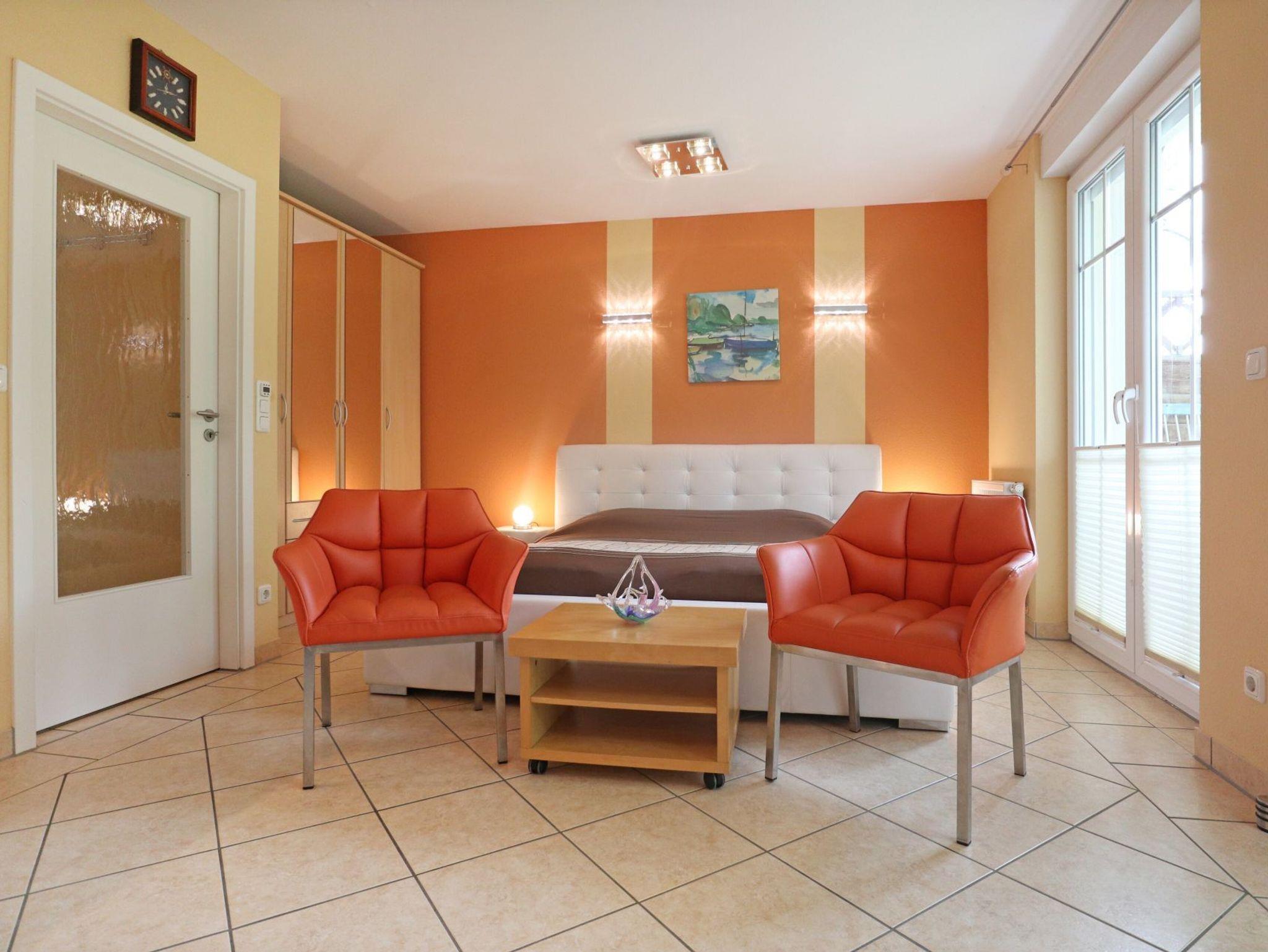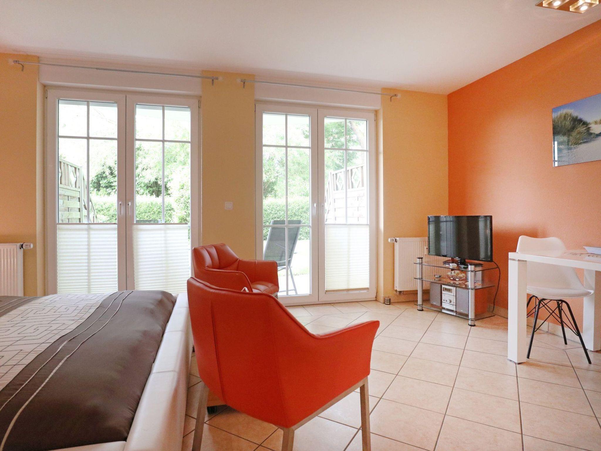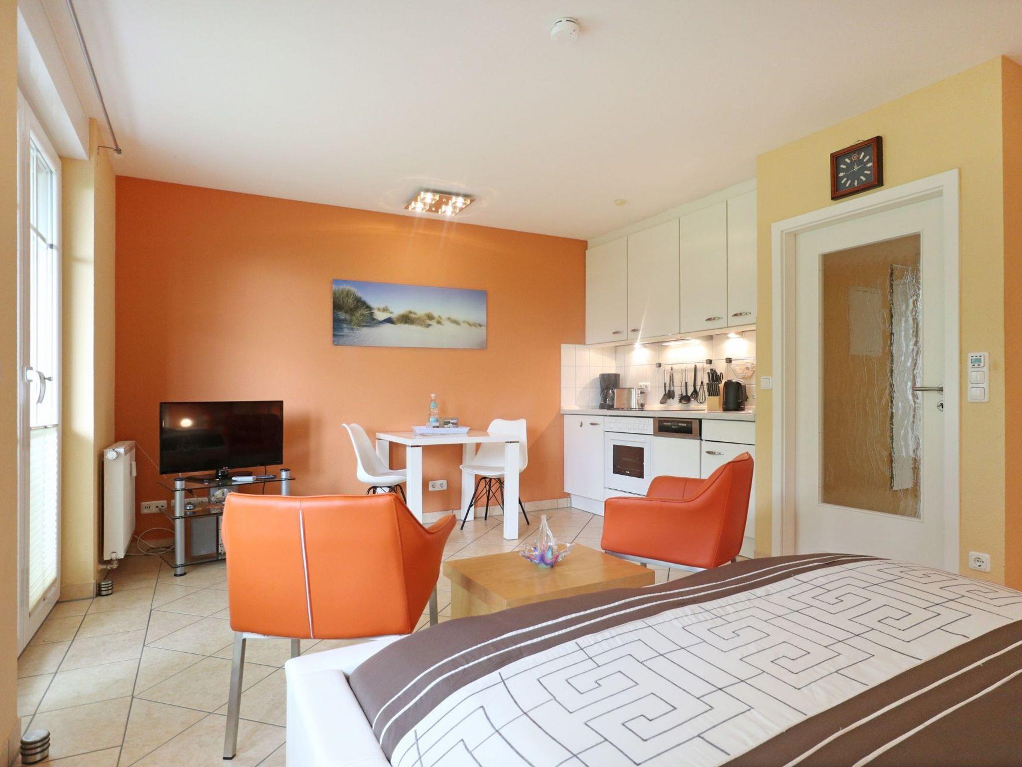 Das gemütliche 1-Zimmer-Erdgeschoss Appartement bietet auf 34?qm Platz für einen erholsamen Urlaub mit zwei Personen. Auf der saisonal möblierten Süd-West Terrasse mit Gartennutzung genießen Sie entspannte Stunden an der frischen Luft. Der offene Wohn- Ess- und Schlafbereich heißt Sie mit einer freundlichen Möblierung willkommen. Hier stehen Ihnen ein zwei Sessel, Doppelbett sowie ein Esstisch, Fernseher zur Verfügung. Die integrierte Küchenzeile ist ideal für Selbstversorger und verfügt über Cerankochfeld, Backofen, Kühlschrank mit integriertem Gefrierfach, Geschirrspüler, Wasserkocher, Kaffeemaschine, Toaster und weitere Küchenutensilien. Für Ihre Urlaubsgarderobe befindet sich ein geräumiger Kleiderschrank in der Wohnung. Das innenliegende Duschbad ist mit Waschtisch, Fön und WC ausgestattet. Ein Pkw Stellplatz ist in der hauseigenen Tiefgarage reserviert. Fahrräder können je nach Verfügbarkeit in einem abschließbaren Fahrradraum innerhalb der Tiefgarage untergestellt werden. Hunde sind gegen Gebühr herzlich willkommen. Die Wohneinheit ist eine Nichtraucherunterkunft. Bitte beachten Sie, dass kein WLAN vorhanden ist. Die Ferienwohnung befindet sich in einem ruhigen Appartementhaus, nur etwa 250 Meter vom naturbelassenen Strand entfernt und in unmittelbarer Nähe zu schönen Wanderwegen ? ideal für alle, die Erholung in naturnaher Umgebung suchen.