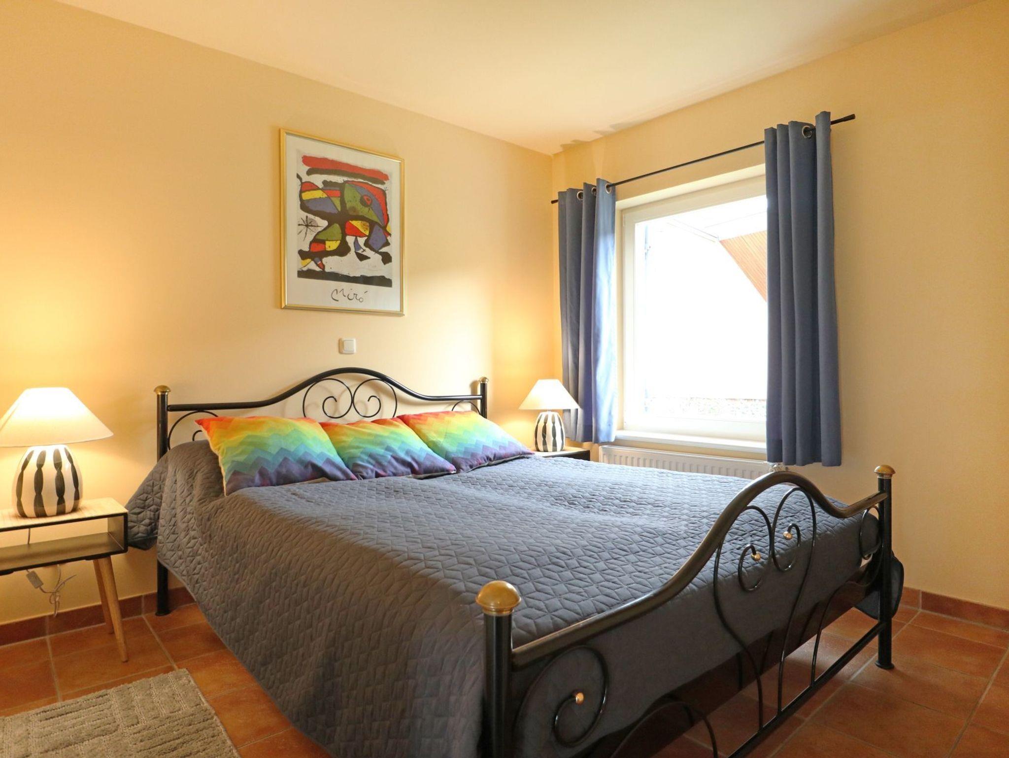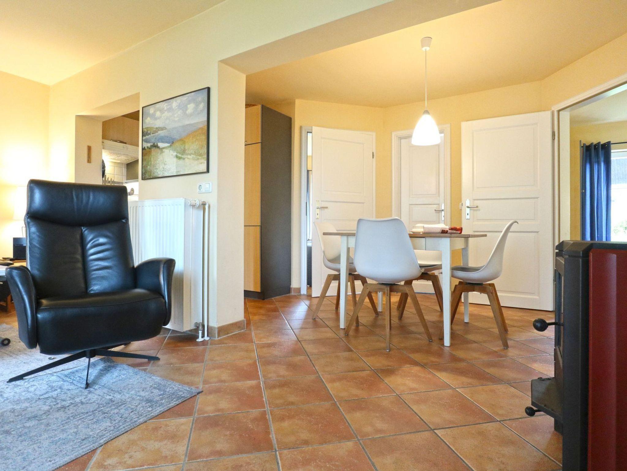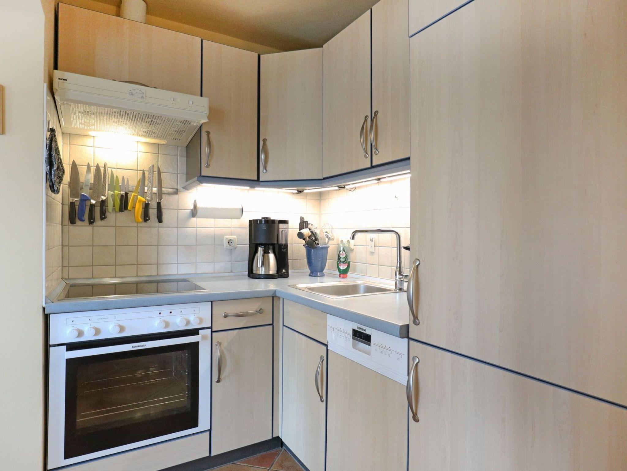 Die integrierte Küchenzeile ist ausgestattet mit Ceranfeldherd, Backofen, Dunstabzugshaube, Kühlschrank mit Gefrierfach, Spülmaschine sowie Kaffeemaschine, Toaster, Wasserkocher usw. Für gemeinsame Mahlzeiten befindet sich ein großer Esstisch im Wohnbereich. Entspannte Nächte ermöglichen Ihnen zwei separate Schlafzimmer 1x mit Doppelbett und Kleiderschrank, 1x mit zwei Einzelbetten und Kleiderschrank für die Urlaubsgarderobe. Zugehörig ist ein Duschbad mit Fenster, Waschtisch, WC sowie einer Waschmaschine zur gebührenfreien Nutzung.