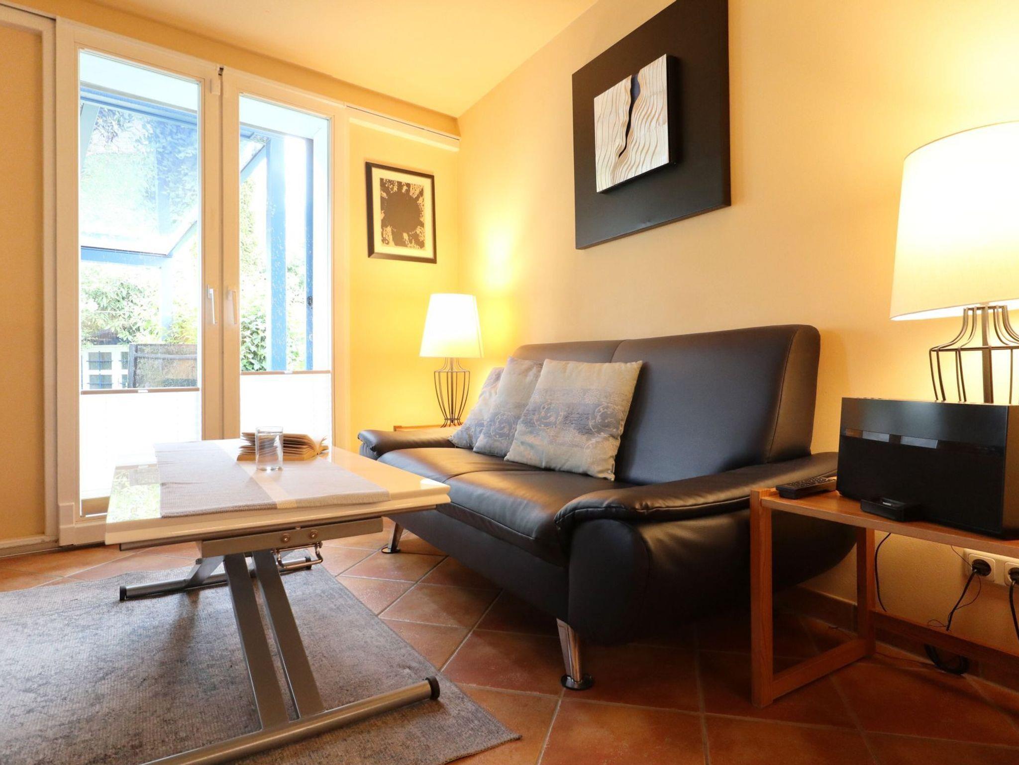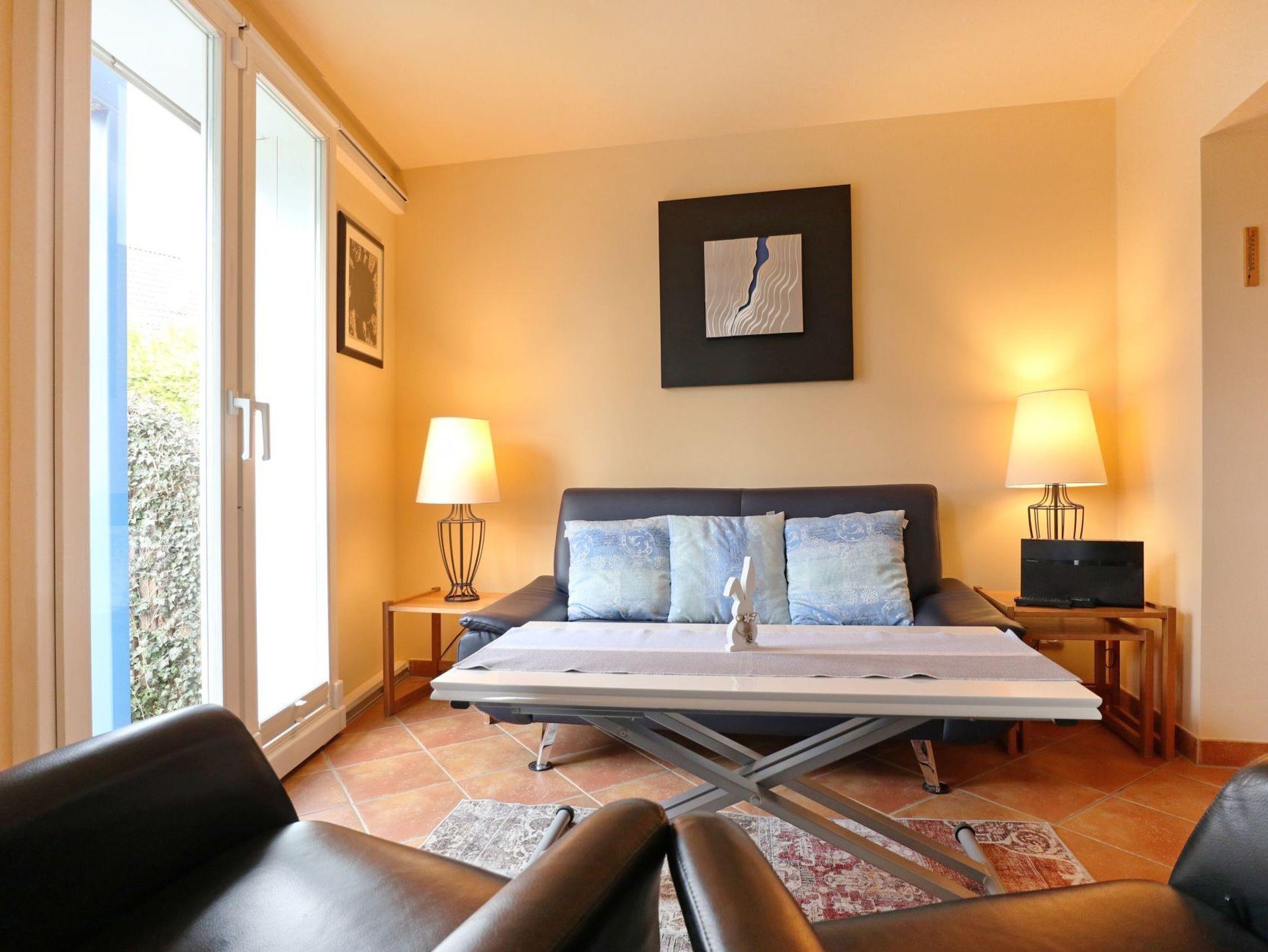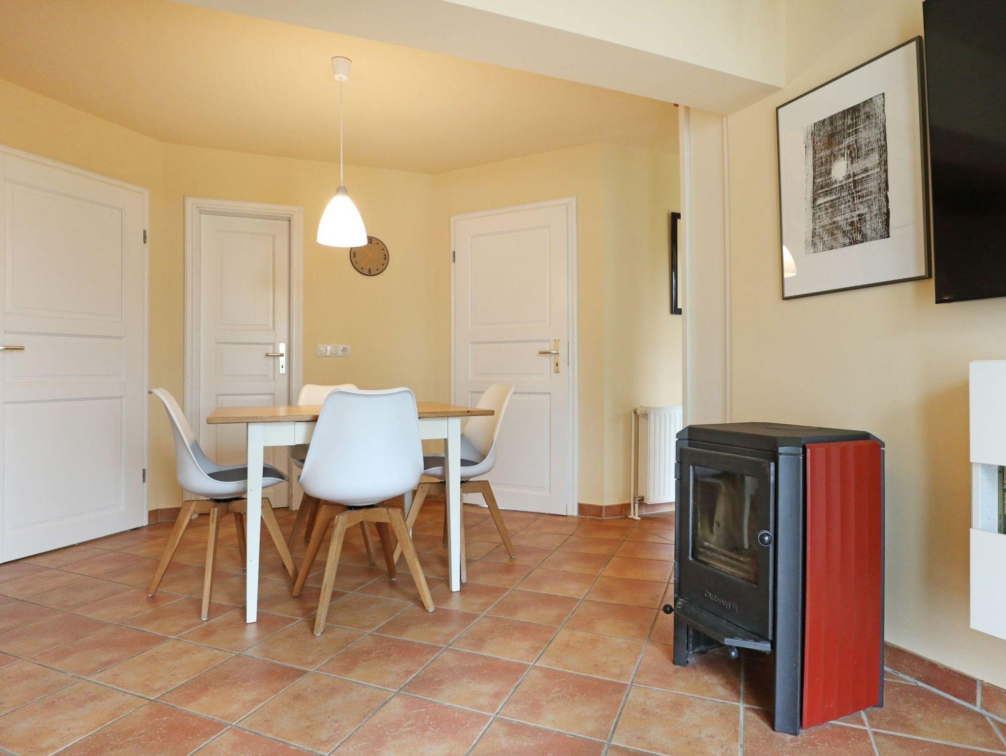 Die integrierte Küchenzeile ist ausgestattet mit Ceranfeldherd, Backofen, Dunstabzugshaube, Kühlschrank mit Gefrierfach, Spülmaschine sowie Kaffeemaschine, Toaster, Wasserkocher usw. Für gemeinsame Mahlzeiten befindet sich ein großer Esstisch im Wohnbereich. Entspannte Nächte ermöglichen Ihnen zwei separate Schlafzimmer 1x mit Doppelbett und Kleiderschrank, 1x mit zwei Einzelbetten und Kleiderschrank für die Urlaubsgarderobe. Zugehörig ist ein Duschbad mit Fenster, Waschtisch, WC sowie einer Waschmaschine zur gebührenfreien Nutzung.