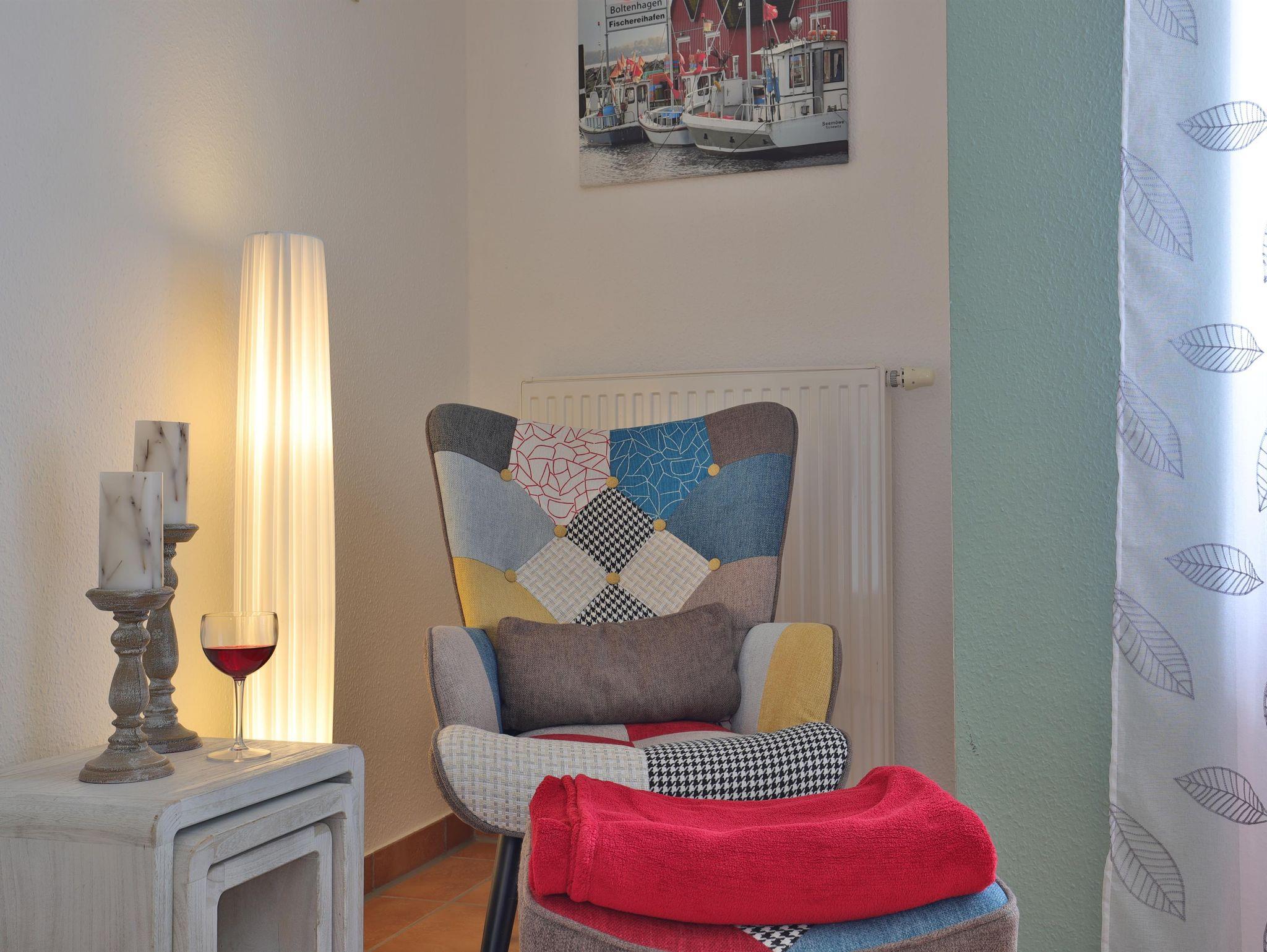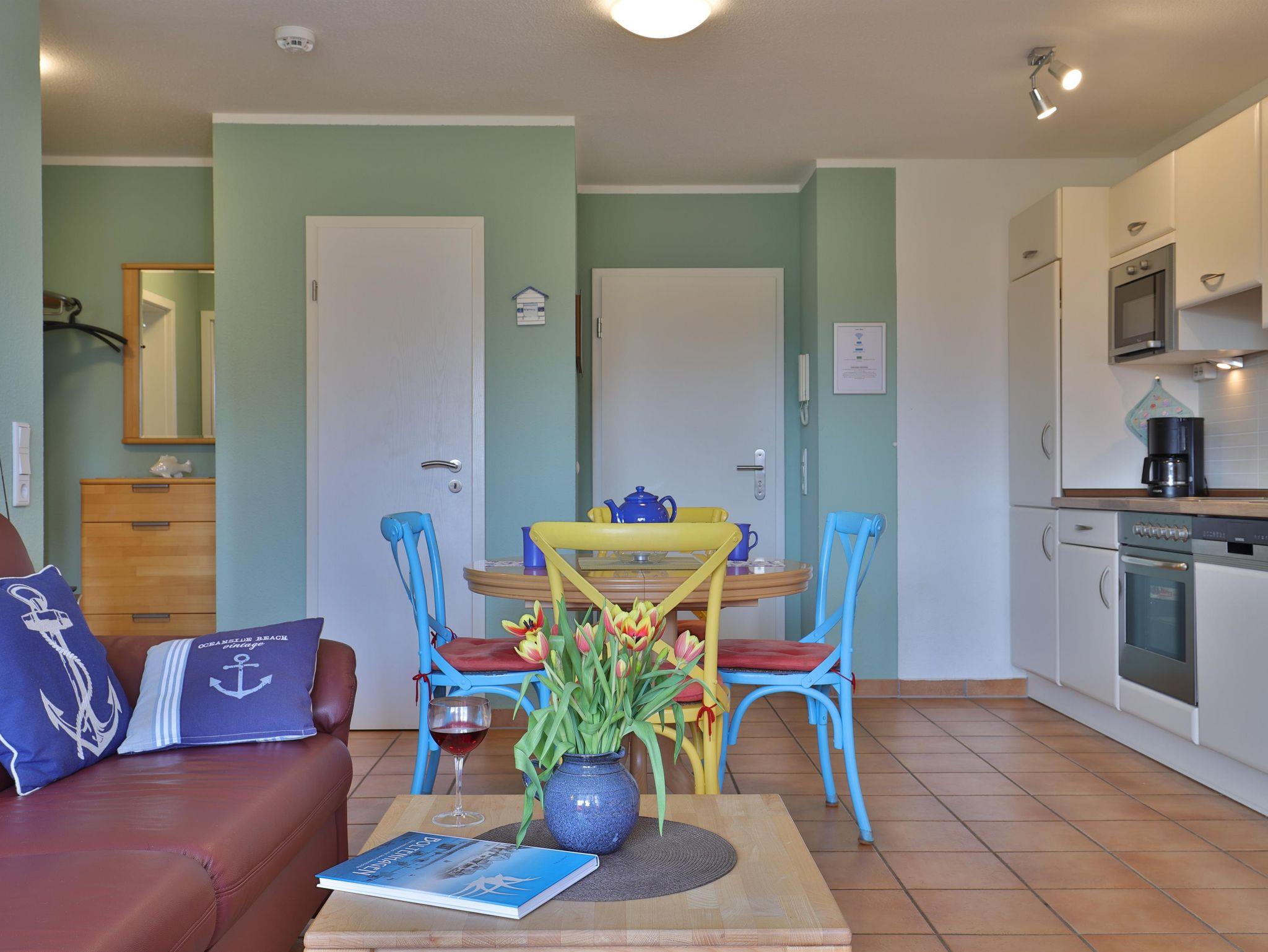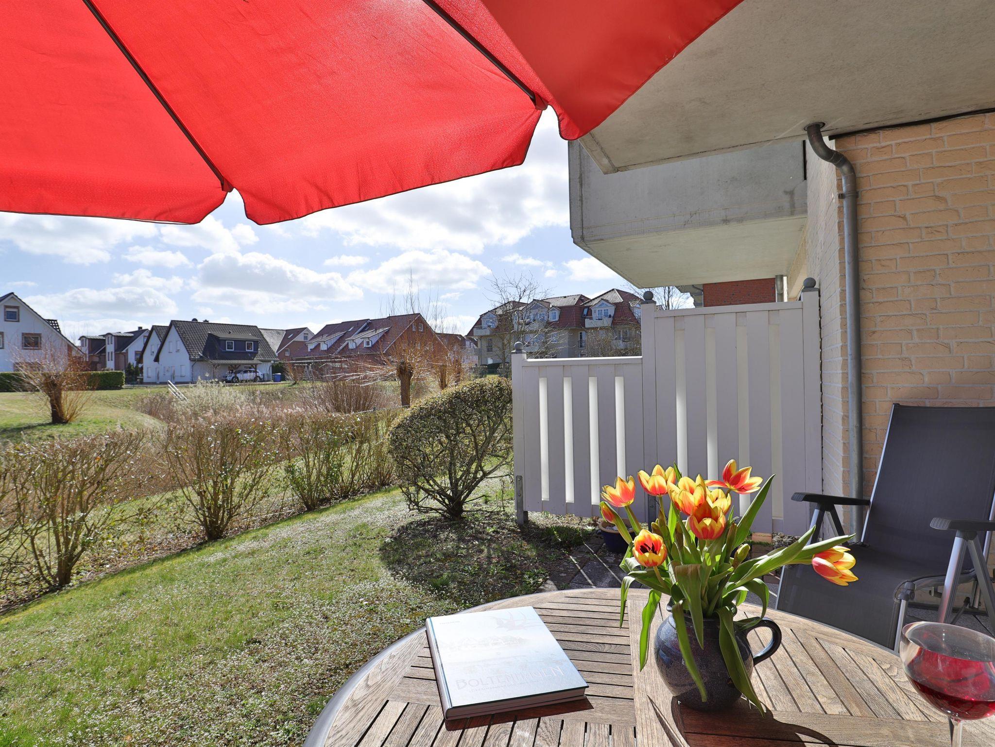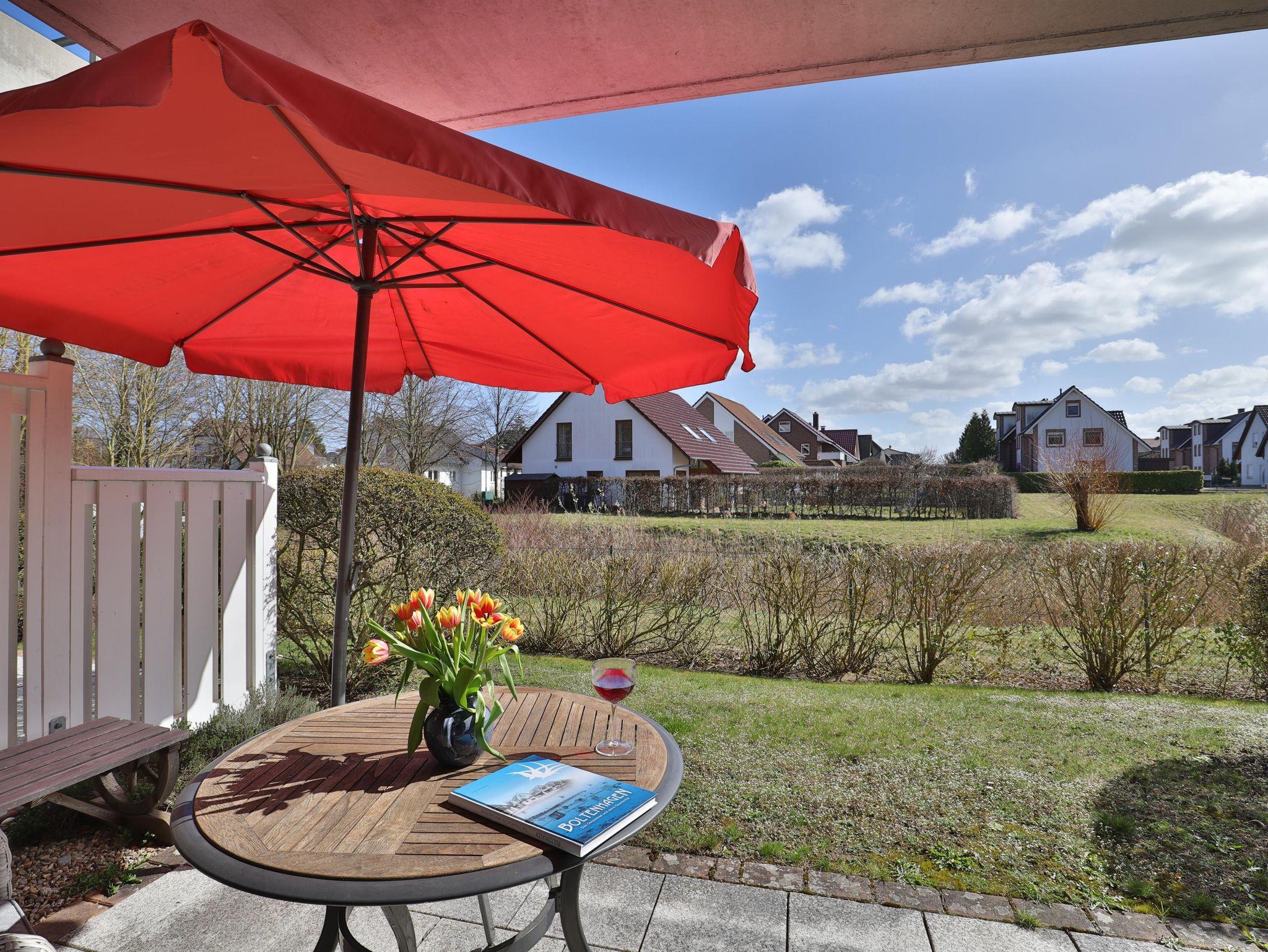Unsere 2-Zimmer Erdgeschoss-Ferienwohnung ist ideal für Ihren Urlaub an der Ostsee. Auf der großen Sonnenterrasse mit Blick ins Grüne können Sie bequem entspannen.