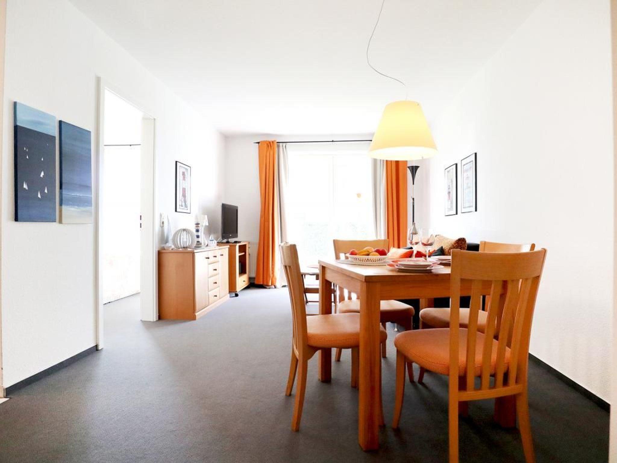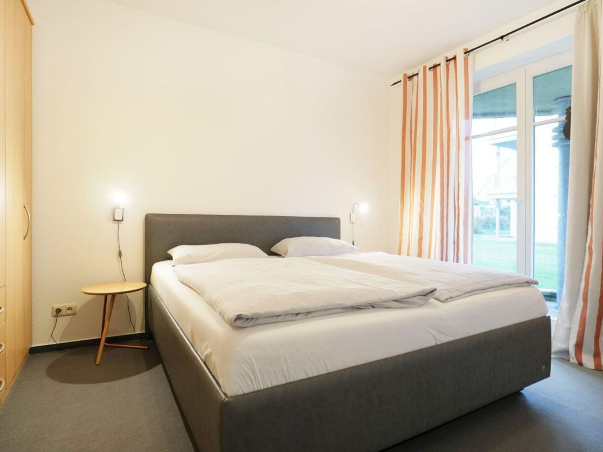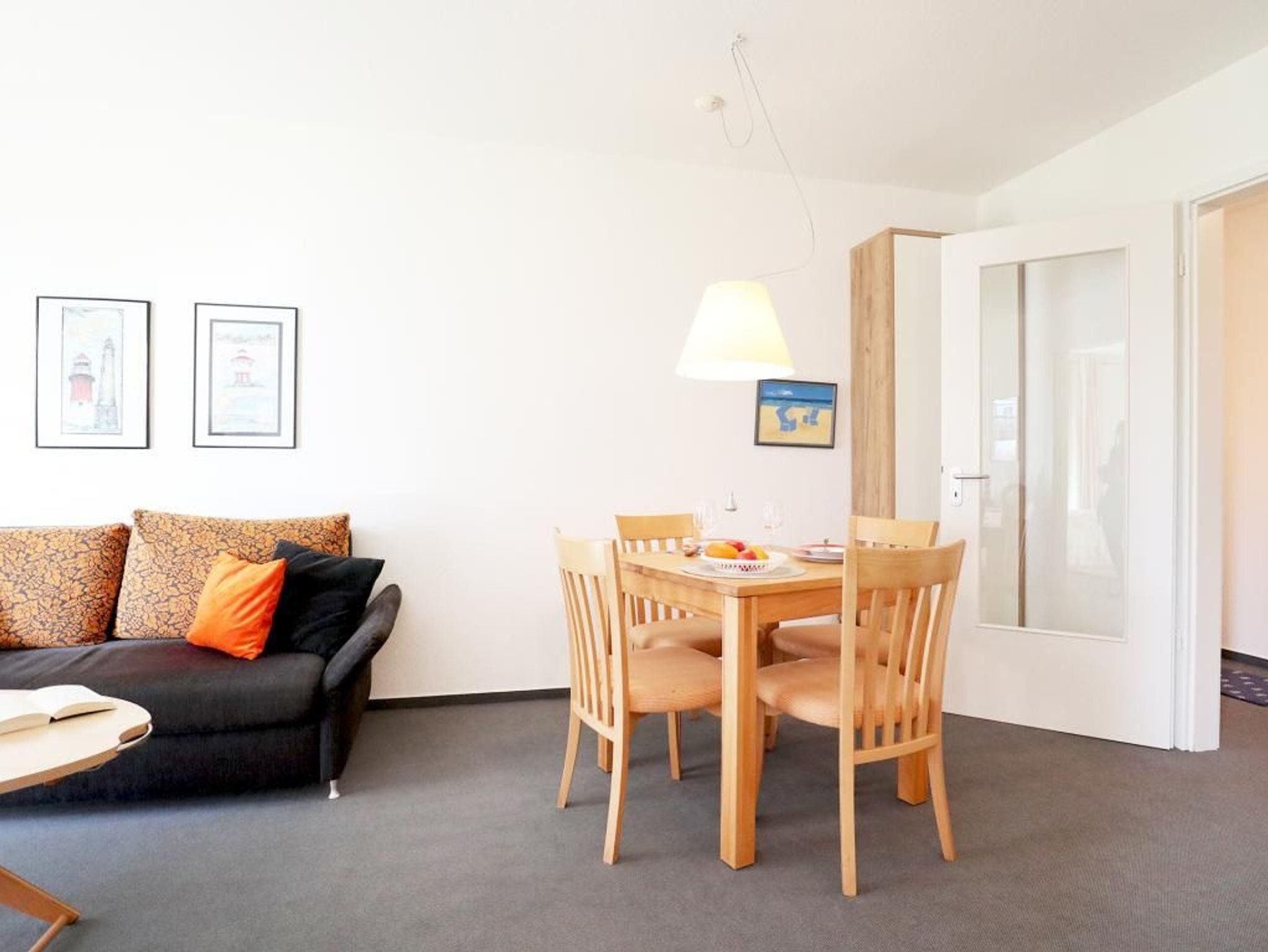 Die behaglich möblierte 2-Zimmerwohnung mit Terrasse, ist für eine Belegung mit bis zu 4 Personen geeignet. Sie bewohnen ein 50qm im Erdgeschoss des Hauses. Im Wohn-Essbereich empfängt Sie ein Komfortsofa, das sich mit wenigen Handgriffen in ein Schlafsofa ? 1,60m x 2,00m- umwandeln lässt. Ein Fernseher sowie gebührenfreies WLAN sind ebenfalls vorhanden. Die Wohnküche ist offen gestaltet und ermöglicht die eigenständige Versorgung mit Urlaubsmahlzeiten: Herd, Backofen, Dunstabzug, Kühlschrank mit sep. Gefrierfach, Kaffeemaschine, Toaster, Geschirrspüler usw. unterstützen Sie beim Kochen. Ihre Mahlzeiten nehmen Sie am Esstisch zu sich, oder Sie genießen die Vorzüge der saisonal möblierten Terrasse in Süd-West Ausrichtung. Die Wohnung verfügt über ein separates Schlafzimmer mit einem bequemen Doppelbett und einem großen Kleiderschrank. Zugehörig ist ein modernisiertes Duschbad mit Waschtisch, Föhn, WC. Waschmaschine und Wäschetrockner stehen allen Gästen gegen Gebühr zur Verfügung. Mitgebrachte Fahrräder können auf dem hauseigenen Grundstück an Fahrradständern, oder nach Verfügbarkeit im Untergeschoss des Hauses untergebracht werden. Ihren PKW parken Sie in der Tiefgarage. Keine Haustiere. Nichtraucherwohnung.