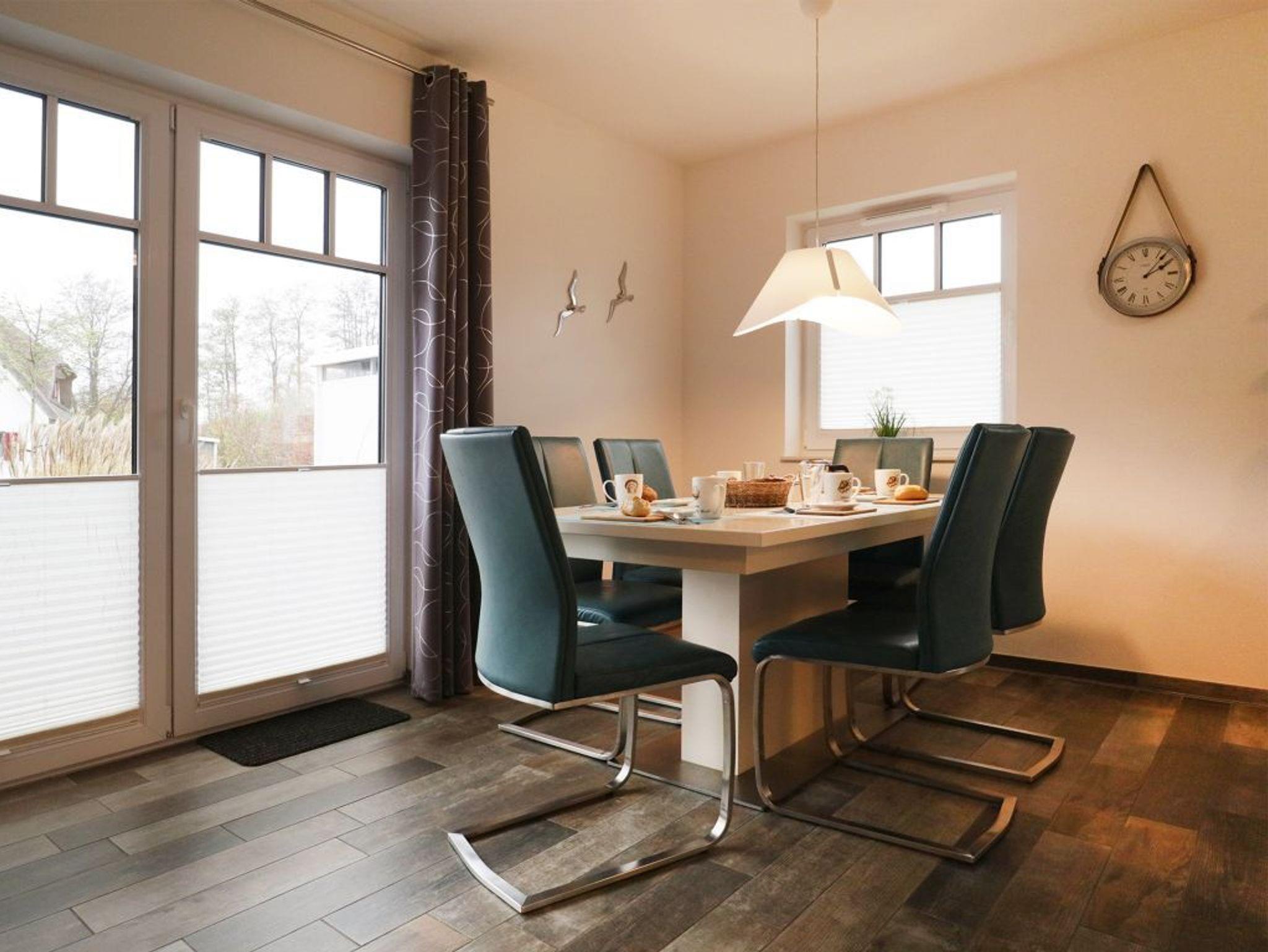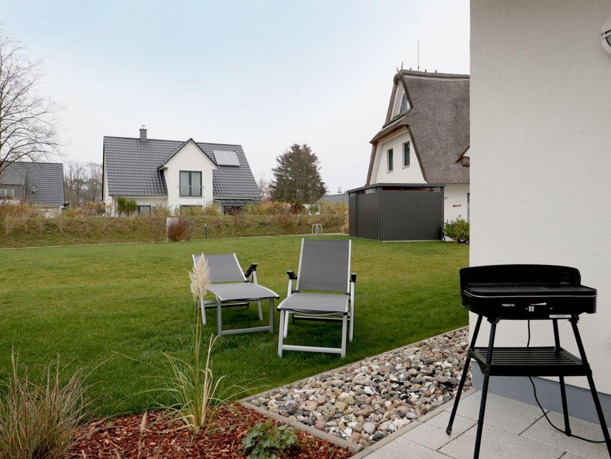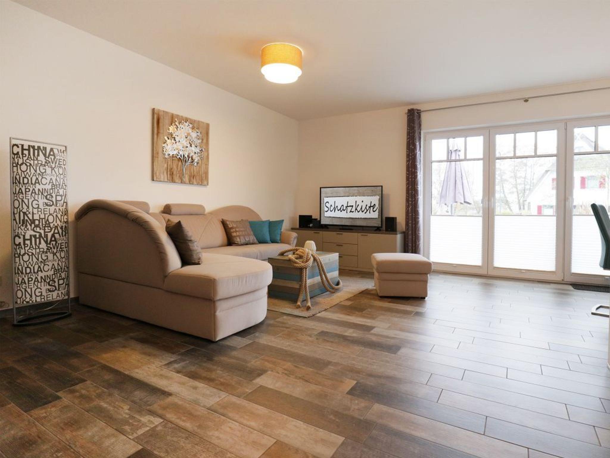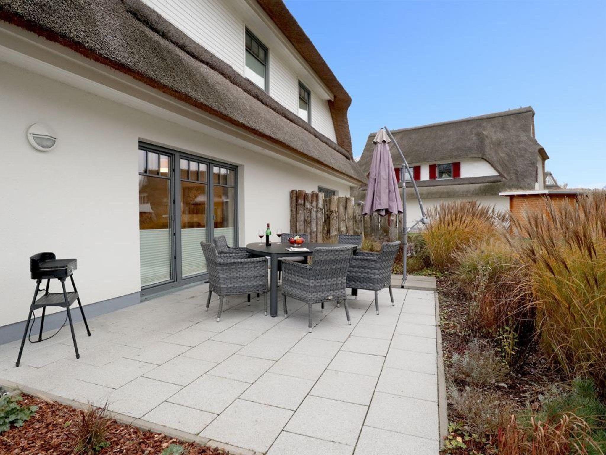 Es empfängt Sie das 4-Zimmer Reetdach Doppelhaus ?Schatzkiste? mit einer Wohnfläche von 103qm, welche sich über drei Etagen verteilt. Die durchdachte Raumaufteilung ermöglicht eine Belegung mit bis zu sechs Personen. Modern möbliert empfängt Sie der schicke Wohn-Essbereich mit einer komfortablen Sofalandschaft, einem Esstisch sowie einer voll ausgestatteten Wohnküchenzeile mit Ceranfeldherd, Backofen, Dunstabzugshaube, Mikrowelle, Geschirrspüler sowie Kaffeemaschine, Toaster und Wasserkocher usw. Im Wohnbereich befinden sich zudem ein Fernseher, Musikanlage und auch die kostenfreie WLAN- Nutzung ist gegeben. Vom Wohnzimmer gelangen Sie auf eine mit Büschen umpflanzte, saisonal möblierte Terrasse in süd-/westliche Richtung. Im zugehörigen Gartenhäuschen steht auch ein Elektrogrill bereit. Des Weiteren befinden sich ein Komfort Tageslicht Duschbad im Erdgeschoss des Hauses. Über eine Treppe gelangen Sie in das 1. Obergeschoss, wo sich zwei separate Schlafzimmer jeweils mit Doppelbett, Kleiderschrank und TV befinden. Der Höhepunkt auf dieser Ebene ist das sehr geräumige Wannenbad mit Infrarotkabine und Waschmaschinen Nutzung. Das 2. Obergeschoss bietet Ihnen ein weiteres Schlafzimmer mit zwei Einzelbetten, Kleiderschrank und TV. Eine weitere Rückzugsmöglichkeit finden Sie im Flurbereich mit einer behaglichen Sitzmöglichkeit.