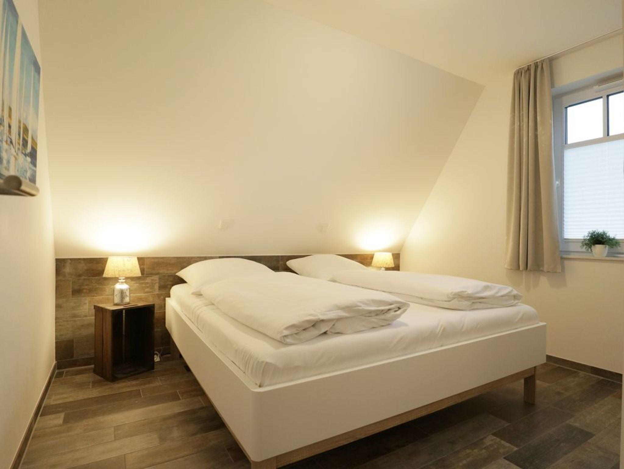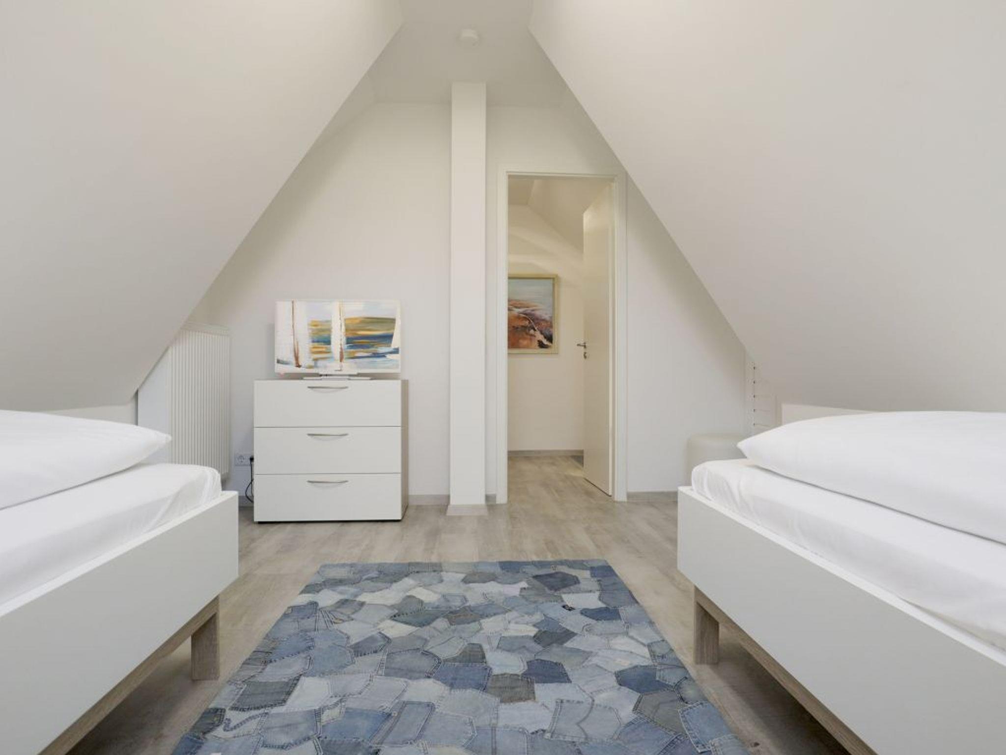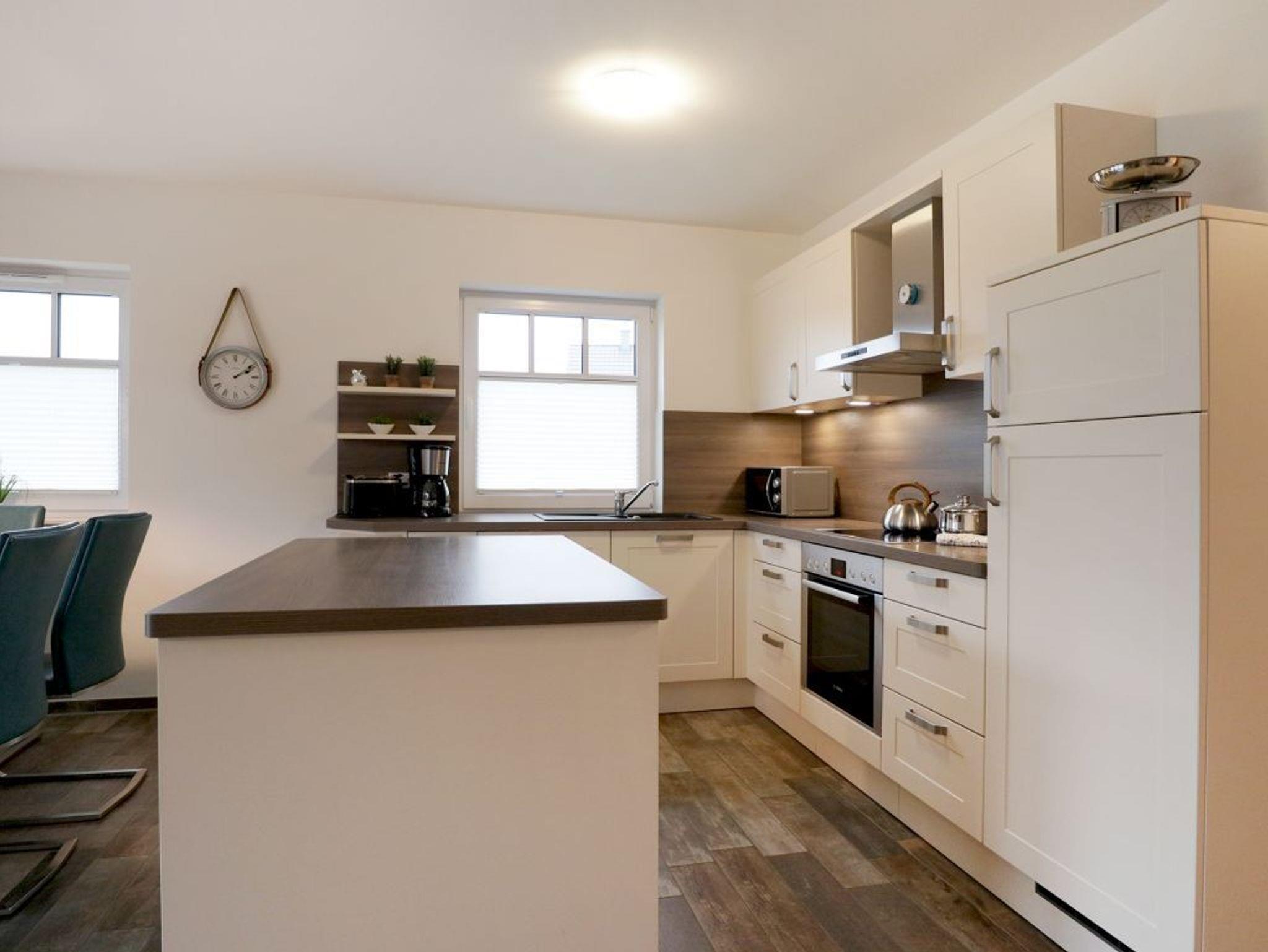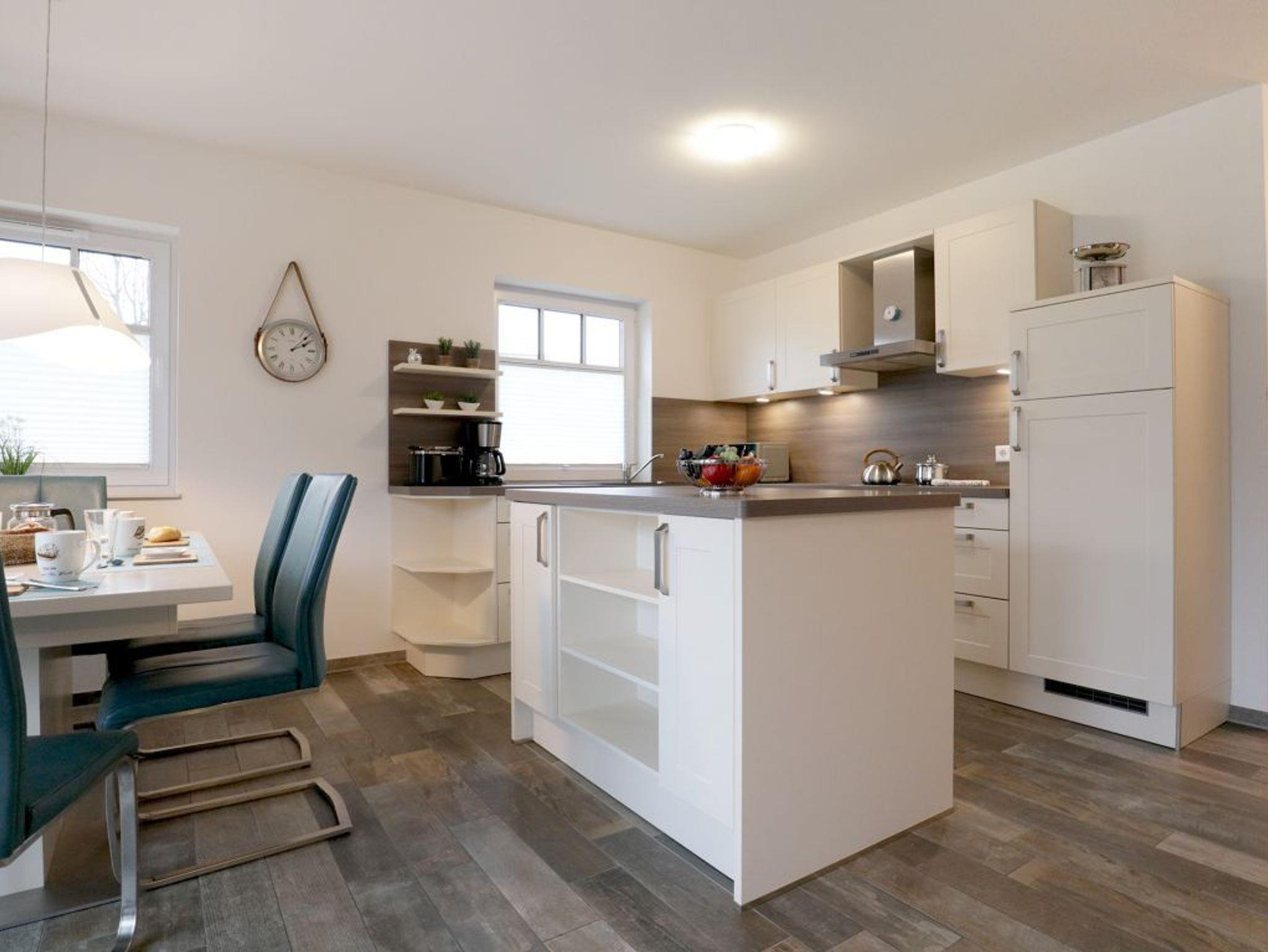 Es empfängt Sie das 4-Zimmer Reetdach Doppelhaus ?Schatzkiste? mit einer Wohnfläche von 103qm, welche sich über drei Etagen verteilt. Die durchdachte Raumaufteilung ermöglicht eine Belegung mit bis zu sechs Personen. Modern möbliert empfängt Sie der schicke Wohn-Essbereich mit einer komfortablen Sofalandschaft, einem Esstisch sowie einer voll ausgestatteten Wohnküchenzeile mit Ceranfeldherd, Backofen, Dunstabzugshaube, Mikrowelle, Geschirrspüler sowie Kaffeemaschine, Toaster und Wasserkocher usw. Im Wohnbereich befinden sich zudem ein Fernseher, Musikanlage und auch die kostenfreie WLAN- Nutzung ist gegeben. Vom Wohnzimmer gelangen Sie auf eine mit Büschen umpflanzte, saisonal möblierte Terrasse in süd-/westliche Richtung. Im zugehörigen Gartenhäuschen steht auch ein Elektrogrill bereit. Des Weiteren befinden sich ein Komfort Tageslicht Duschbad im Erdgeschoss des Hauses. Über eine Treppe gelangen Sie in das 1. Obergeschoss, wo sich zwei separate Schlafzimmer jeweils mit Doppelbett, Kleiderschrank und TV befinden. Der Höhepunkt auf dieser Ebene ist das sehr geräumige Wannenbad mit Infrarotkabine und Waschmaschinen Nutzung. Das 2. Obergeschoss bietet Ihnen ein weiteres Schlafzimmer mit zwei Einzelbetten, Kleiderschrank und TV. Eine weitere Rückzugsmöglichkeit finden Sie im Flurbereich mit einer behaglichen Sitzmöglichkeit.