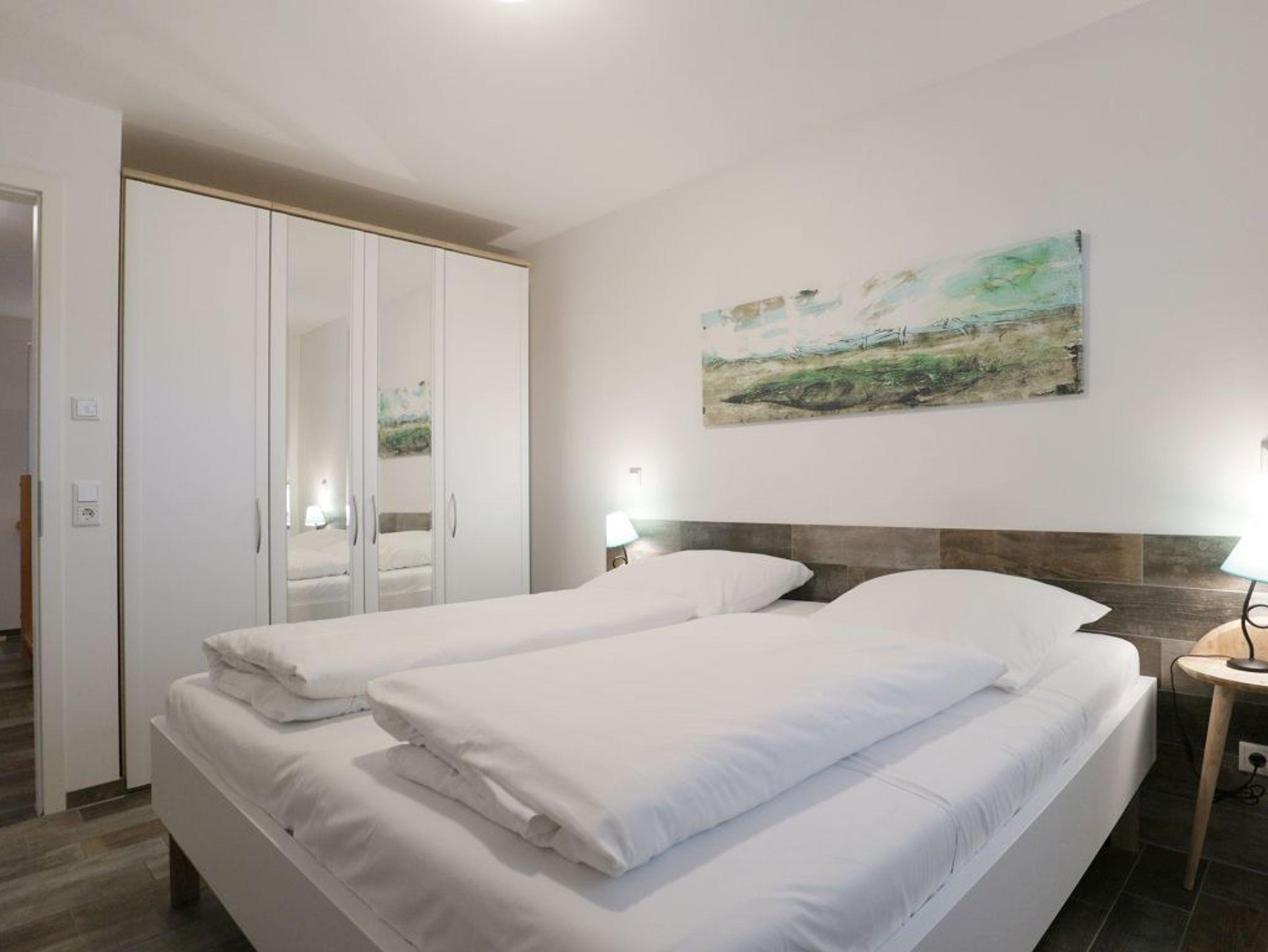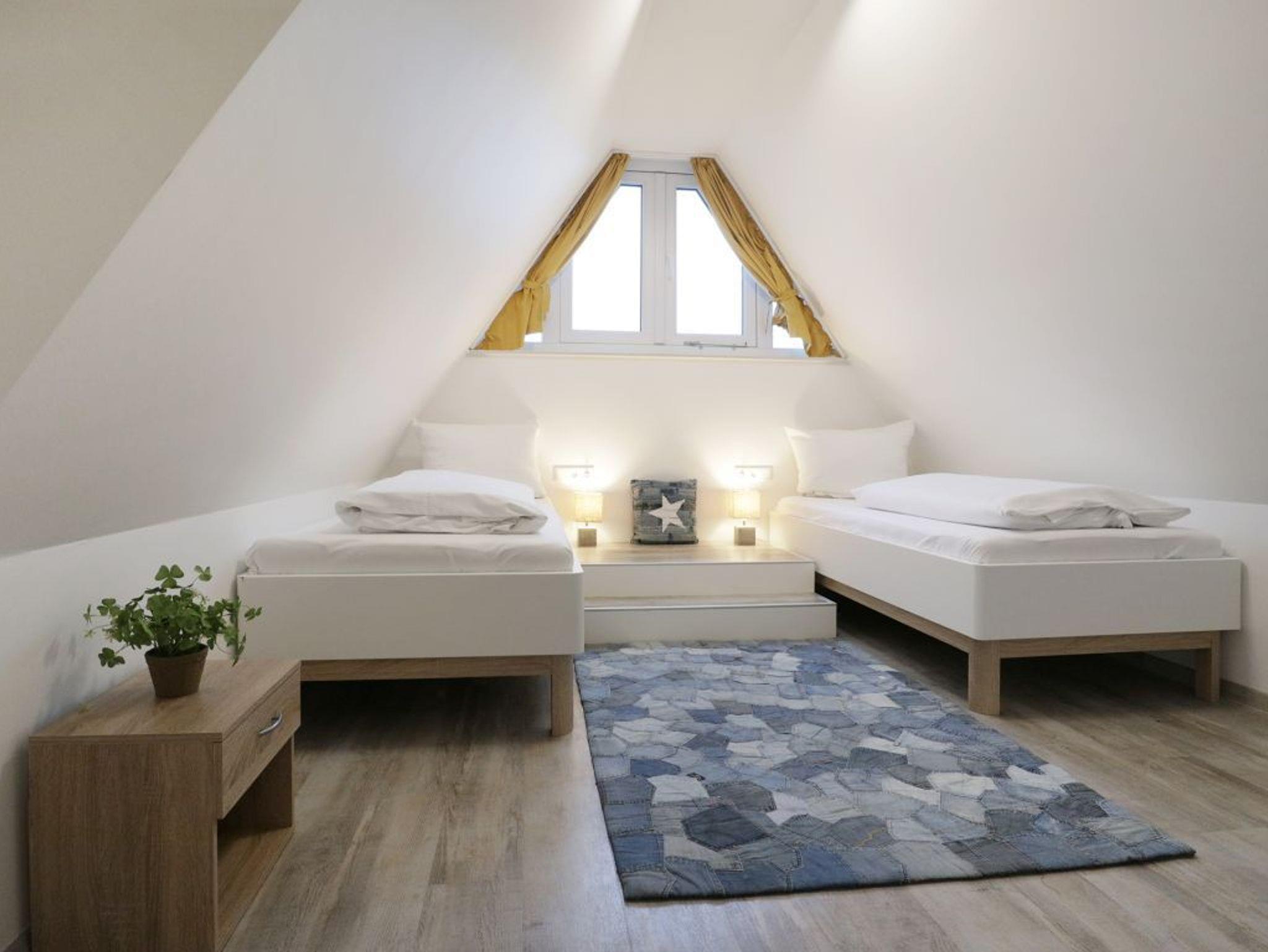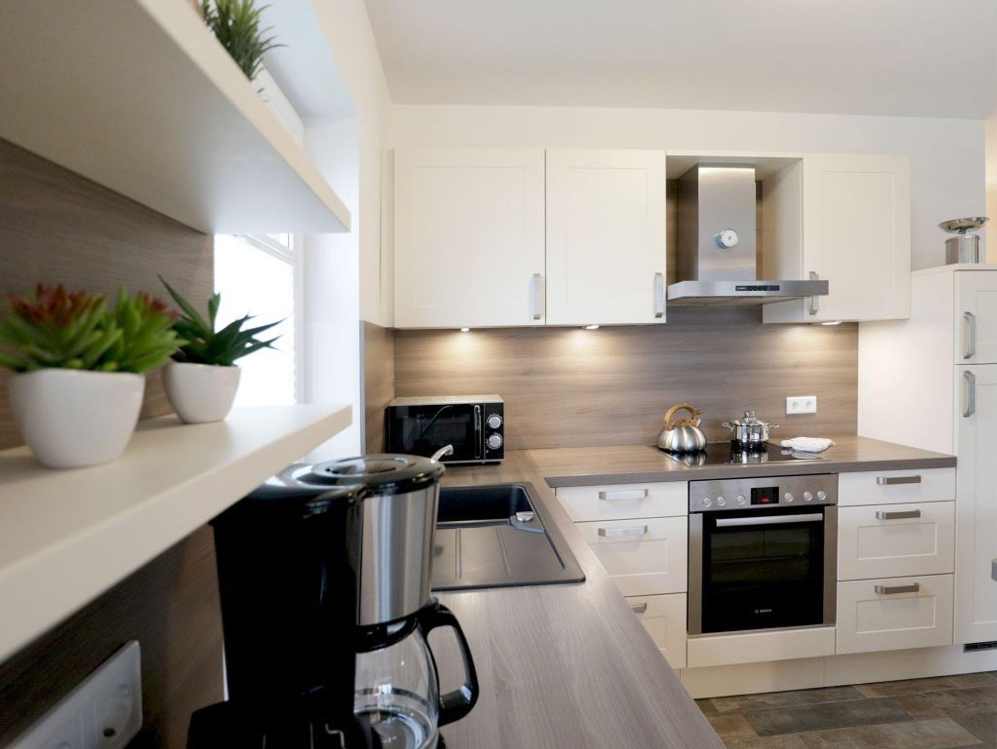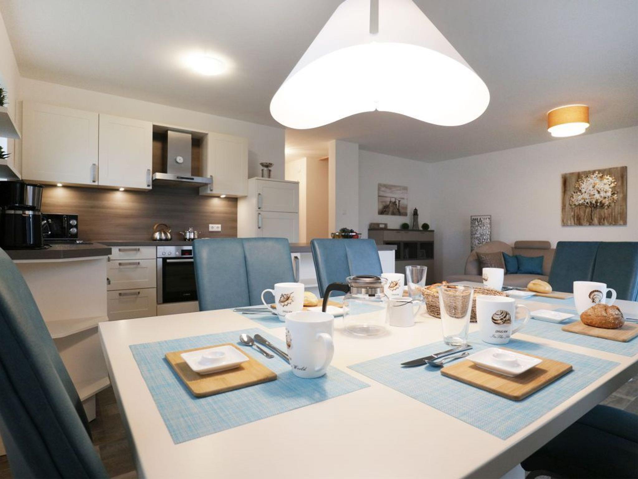 Es empfängt Sie das 4-Zimmer Reetdach Doppelhaus ?Schatzkiste? mit einer Wohnfläche von 103qm, welche sich über drei Etagen verteilt. Die durchdachte Raumaufteilung ermöglicht eine Belegung mit bis zu sechs Personen. Modern möbliert empfängt Sie der schicke Wohn-Essbereich mit einer komfortablen Sofalandschaft, einem Esstisch sowie einer voll ausgestatteten Wohnküchenzeile mit Ceranfeldherd, Backofen, Dunstabzugshaube, Mikrowelle, Geschirrspüler sowie Kaffeemaschine, Toaster und Wasserkocher usw. Im Wohnbereich befinden sich zudem ein Fernseher, Musikanlage und auch die kostenfreie WLAN- Nutzung ist gegeben. Vom Wohnzimmer gelangen Sie auf eine mit Büschen umpflanzte, saisonal möblierte Terrasse in süd-/westliche Richtung. Im zugehörigen Gartenhäuschen steht auch ein Elektrogrill bereit. Des Weiteren befinden sich ein Komfort Tageslicht Duschbad im Erdgeschoss des Hauses. Über eine Treppe gelangen Sie in das 1. Obergeschoss, wo sich zwei separate Schlafzimmer jeweils mit Doppelbett, Kleiderschrank und TV befinden. Der Höhepunkt auf dieser Ebene ist das sehr geräumige Wannenbad mit Infrarotkabine und Waschmaschinen Nutzung. Das 2. Obergeschoss bietet Ihnen ein weiteres Schlafzimmer mit zwei Einzelbetten, Kleiderschrank und TV. Eine weitere Rückzugsmöglichkeit finden Sie im Flurbereich mit einer behaglichen Sitzmöglichkeit.