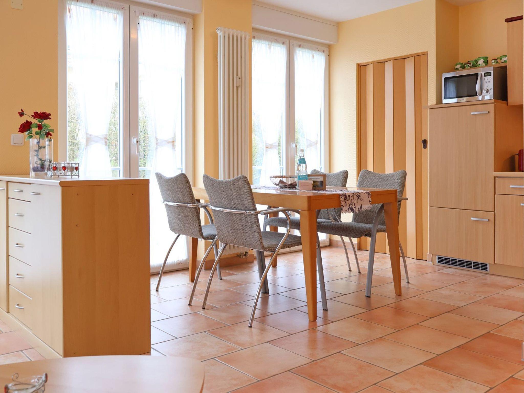 Die 2-Zimmer Erdgeschosswohnung Achtern Diek 3, besitzt eine Wohnfläche von 53qm und kann mit max. 2 Personen belegt werden. Auf der zugehörigen, saisonal möblierten Terrasse, können Sie sich wunderbar erholen. Duch die bodentiefen Fenster gleitet angenehmes Tageslicht in den gemütlichen Wohn und Essbereich, der Sie mit einem Sofa, Lesesessel sowie einem Esstisch empfängt. Fernseher, Radio - CD, sind ebenso vorhanden. Die in den Wohnbereich integrierte Küchenzeile ist gut ausgestattet und ermöglicht mit Ceranherd, Backofen, Mikrowelle, Kühlschrank mit Frostfach, Geschirrspüler, Kaffeemaschine, Toaster usw. die Selbstversorgung. Sie schlafen in einem separaten Schlafzimmer mit Doppelbett, Kleiderschrank und auch ein zweiter Fernseher ist im Schlafbereich vorhanden. Ein innenliegendes Duschbad mit Waschtisch, Handtuchheizung, Föhn und WC ist zugehörig.