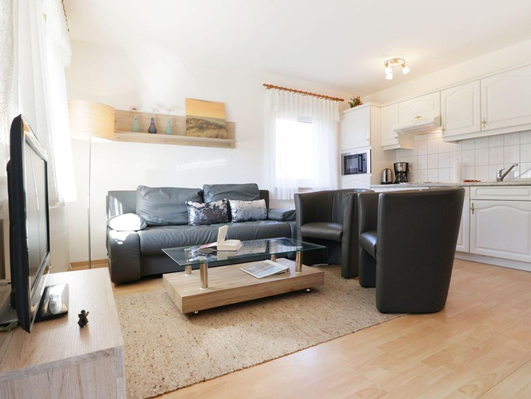Die integrierte Küchenzeile ist voll ausgestattet mit Herd, Backofen, Mikrowelle, Geschirrspüler, Kaffeemaschine und Toaster. Erholung finden Sie auf der saisonal möblierten Süd-West-Terrasse.