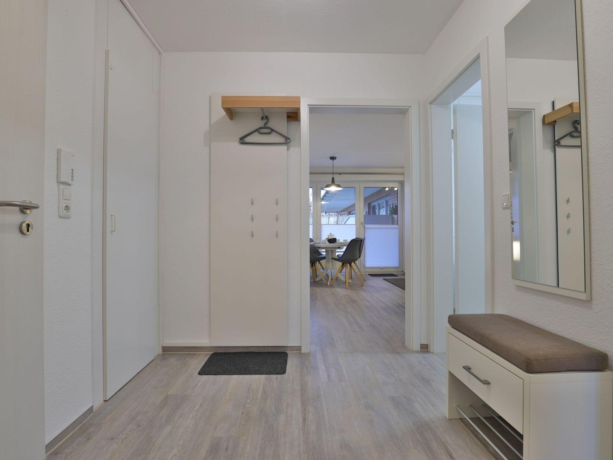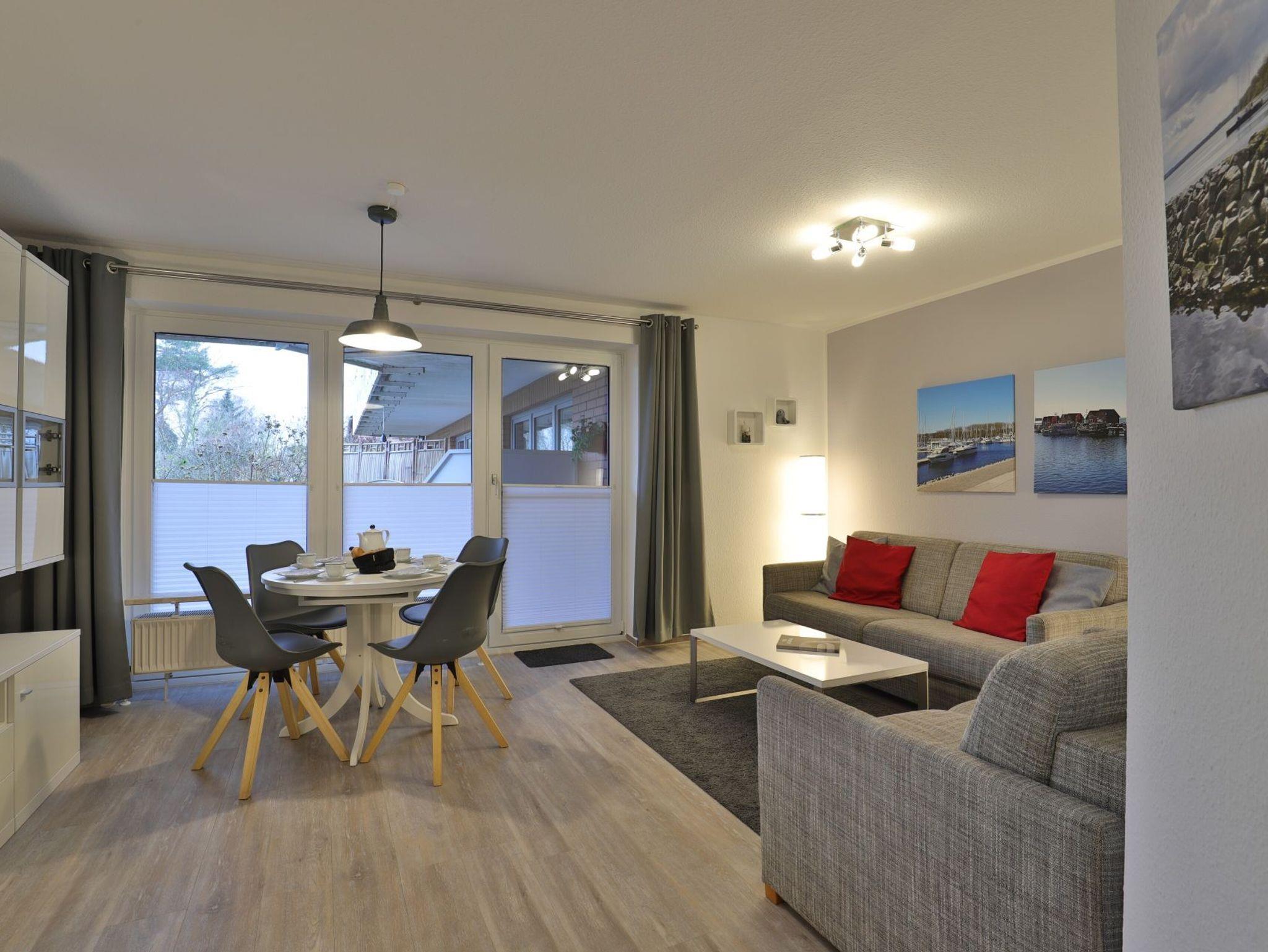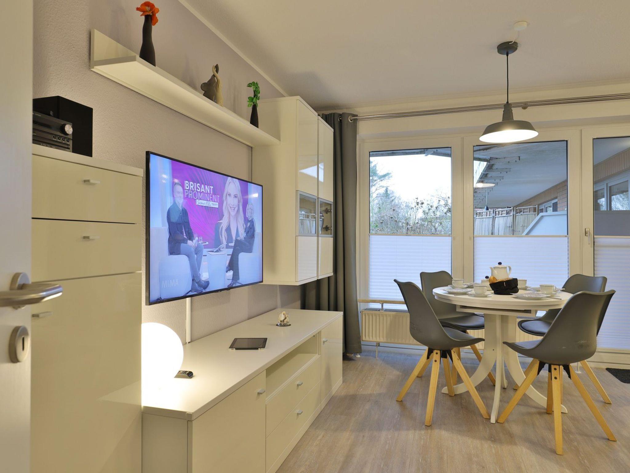 Im Hochparterre des Hauses empfängt Sie dieses modern eingerichtete 2- Zimmer Appartement mit einer Wohnfläche von 50qm sowie Terrasse. Mit bis zu 4 Personen können Sie in der hellen Ferienwohnung einen schönen Urlaub verbringen. Im Wohn-Essbereich steht ein bequemes Sofa, das als ausziehbare Schlafgelegenheit zwei zusätzliche Schlafmöglichkeiten bietet. Zudem befindet sich im Wohnzimmer ein Esstisch mit 4 Stühlen sowie Fernseher und Musikanlage. WLAN nutzen Sie kostenfrei. Vom Wohnbereich betreten sie die saisonal möblierte Terrasse. Die Küche ist separat und bestens ausgestattet mit Ceranfeldherd, Backofen, Dunstabzug, Kühlschrank mit Frostfach, Spülmaschine, Kaffeemaschine, Wasserkocher, Toaster usw. Erholsame Nächte verbringen Sie im komfortabel möblierten Schlafzimmer mit Doppelbett und Kleiderschrank. Familien mit Kleinkind freuen sich über einen bereitstehenden Kinderhochstuhl und Kinderbett sowie Waschmaschine und Bügeleisen.