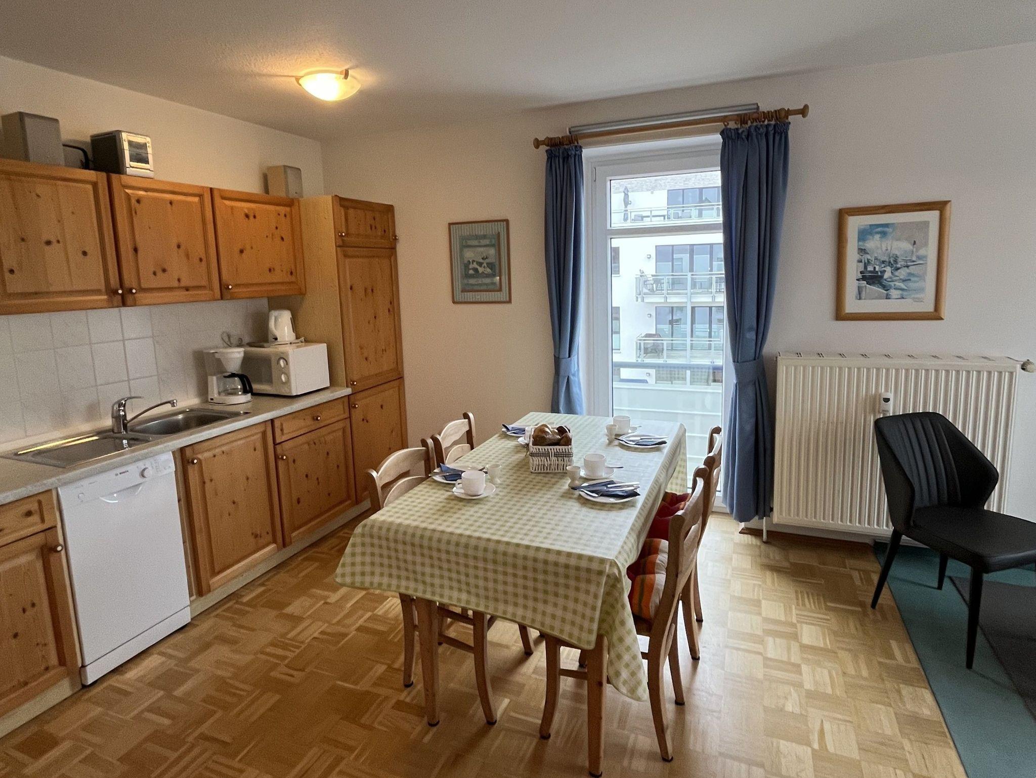 bequemer Doppelbettcouch, separater Essplatz, voll ausgestatteter Küchenbereich, Dusche/WC, Balkon,
