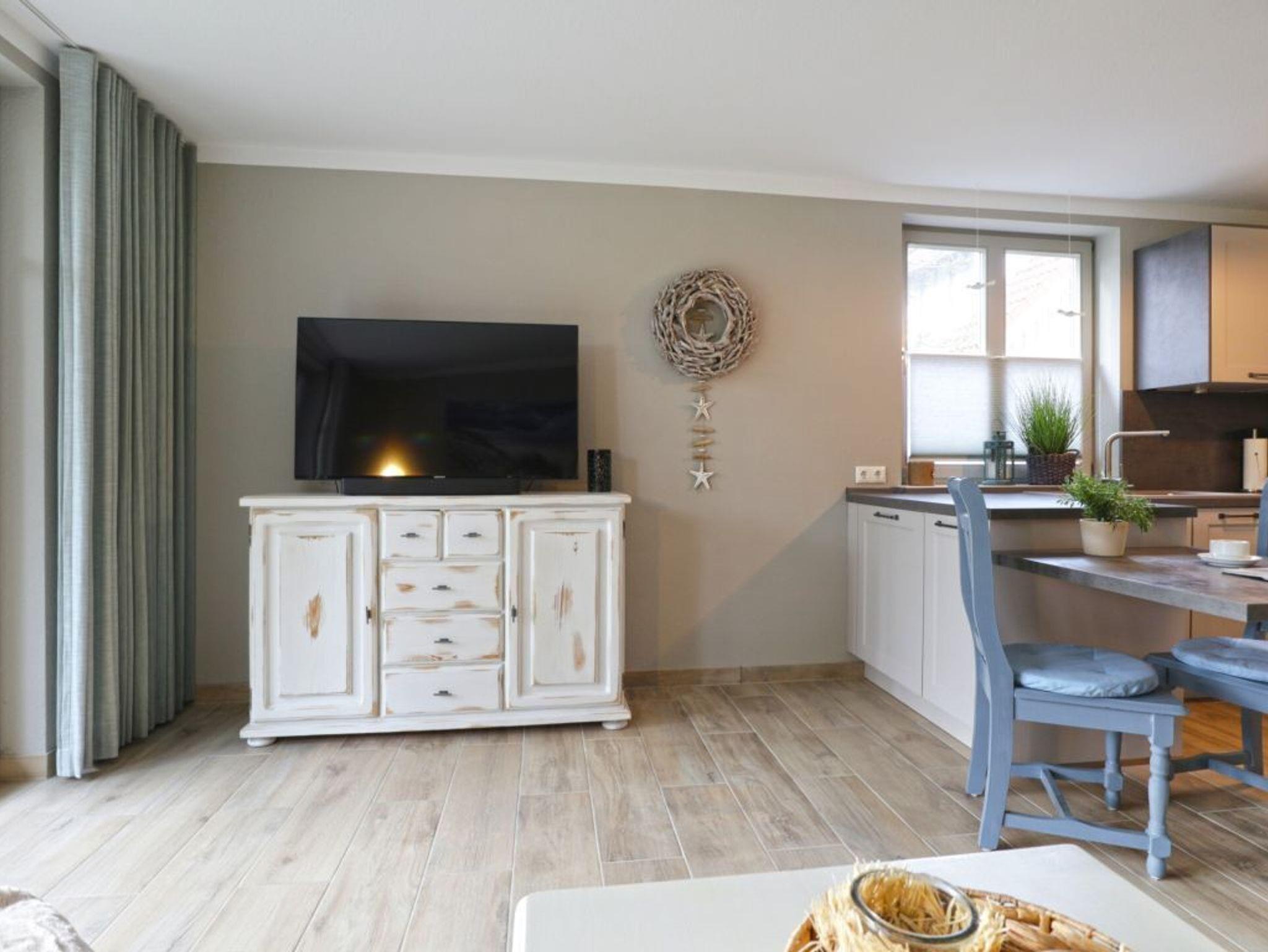 Die vollständig modernisierte 2-Zimmer Ferienwohnung Papillon 17-4, bietet eine geräumige Wohnfläche von 55qm und kann mit bis zu 3 Personen belegt werden.Die hochwertig möblierte Wohnung befindet sich im Erdgeschoss und bietet eine Terrasse mit Elektrogrillmöglichkeit. Der im offenen Stil gestaltete Wohn-/Essbereich ist mit einer gemütlichen Couch ausgestattet, welche sich leicht zu einem Schlafplatz mit den Maßen 180 x 200cm umwandeln lässt. Moderne Unterhaltungselektronik bieten Smart - TV mit Soundbase sowie Musikanlage und kostenfreies WLAN. Vollständig ausgestattet ist die offene Komfortküchenzeile, so dass Sie sich bei Bedarf selbständig mit Urlaubsmahlzeiten versorgen können. Ihre gemeinsamen Mahlzeiten nehmen Sie an einem Esstisch zu sich. Während der wärmeren Jahreszeit können Sie Ihre Mahlzeiten auch auf der saisonal möblierten Terrasse mit Blick ins Grüne genießen und wenn Sie mögen, gerne den hochwertigen Elektrogrill nutzen.