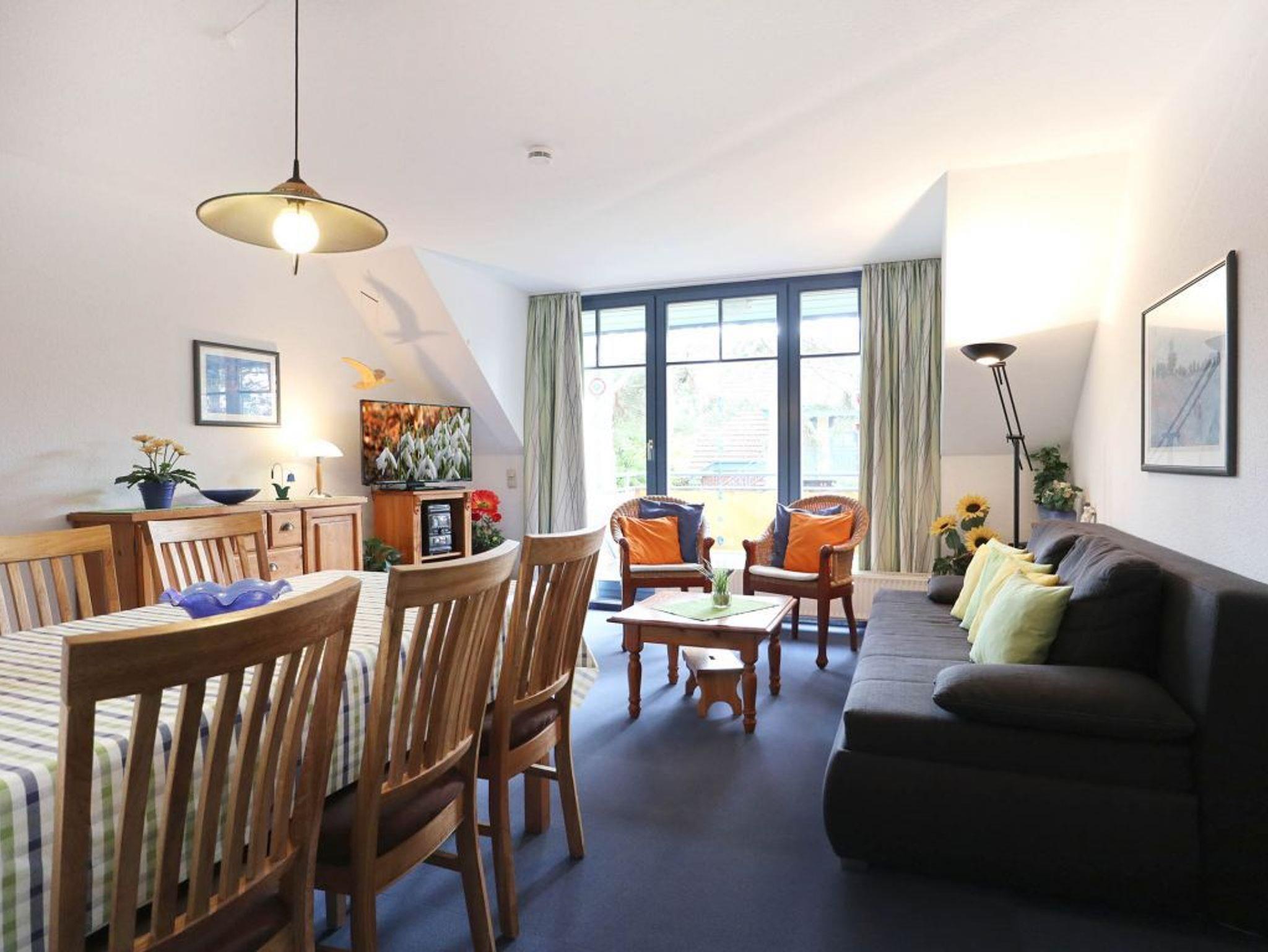 Die 4- Zimmer Maisonetten Ferienwohnung Papillon 11-7 ist ein familienfreundliches Appartement mit einer Wohnfläche von 65qm. Mit bis zu 8 Personen können Sie hier einen günstigen Urlaub verbringen. Wir empfehlen eine max. Belegung mit bis zu 6 Gästen. Der großzügige Wohn-/Essbereich ist mit einem Sofa, ausziehbar als Schlafsofa mit zwei weiteren Schlafgelegenheiten sowie weiteren Sitzmöglichkeiten und einem großen Esstisch möbliert. Ein Fernsehgerät, DVD-Player, Musikanlage und kostenfreie WLAN- Nutzung bieten Abwechslung. Vom Wohnbereich betritt man den saisonal möblierten Süd-Balkon. In der Wohnküche stehen Herd, Backofen, Geschirrspüler sowie Kühlschrank mit integr. Gefrierfach, Kaffeemaschine, Toaster und Wasserkocher bereit. Auch eine Mikrowelle ist vorhanden. Ebenso befinden sich auf dieser Wohnebene ein separates Schlafzimmer mit zwei Einzelbetten, und Kleiderschrank. Das Duschbad ist mit zwei Waschtischen und WC ausgestattet. Über eine Treppe im Wohnbereich gelangen Sie in die obere Ebene mit zwei weiteren Schlafzimmern. Eines mit Doppelbett 1,60m mal 2,00m und Kleiderschrank. Das dritte Schlafzimmer mit Doppelbett 1,80m mal 2,00m, Kleiderschrank und Fernseher. Gegen Gebühr können Sie im Untergeschoß des Hauses Waschmaschine und Wäschetrockner nutzen. Ein Kinderhochstuhl sowie ein Kinderreisebett stehen ohne zusätzliche Gebühr bereit. Ihren PKW parken Sie kostenfrei auf dem wohnungseigenen Außenstellplatz. Bitte beachten Sie, dass es sich um eine Nichtraucherwohnung handelt. Haustiere sind nicht gestattet. Zur Ostsee gelangen Sie in nur ca. 250 Meter.