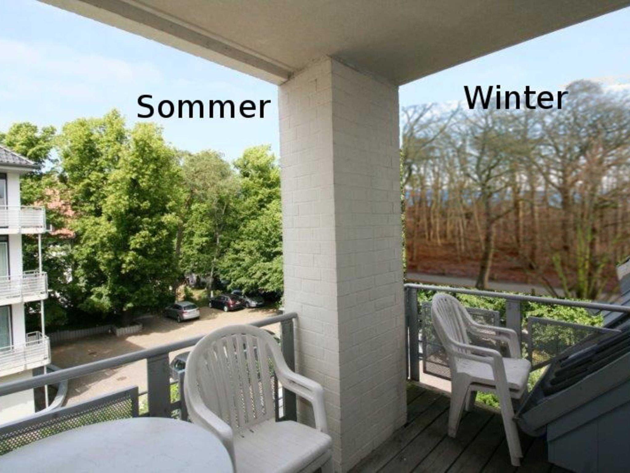 Die Bäume des vorgelagerte Küstenwäldchens beeinträchtigen aber meistens den direkten Blick zum nur etwa 100 m entfernten Meer. Im Sommer schauen Sie auf das satte Grün der Baumkronen und in den Wintermonaten, wenn alles Laub von den Bäumen ist, blinkt blau das Wasser der Ostsee durchs Geäst. Gleiches gilt für die Aussicht vom Schlafzimmerfenster.