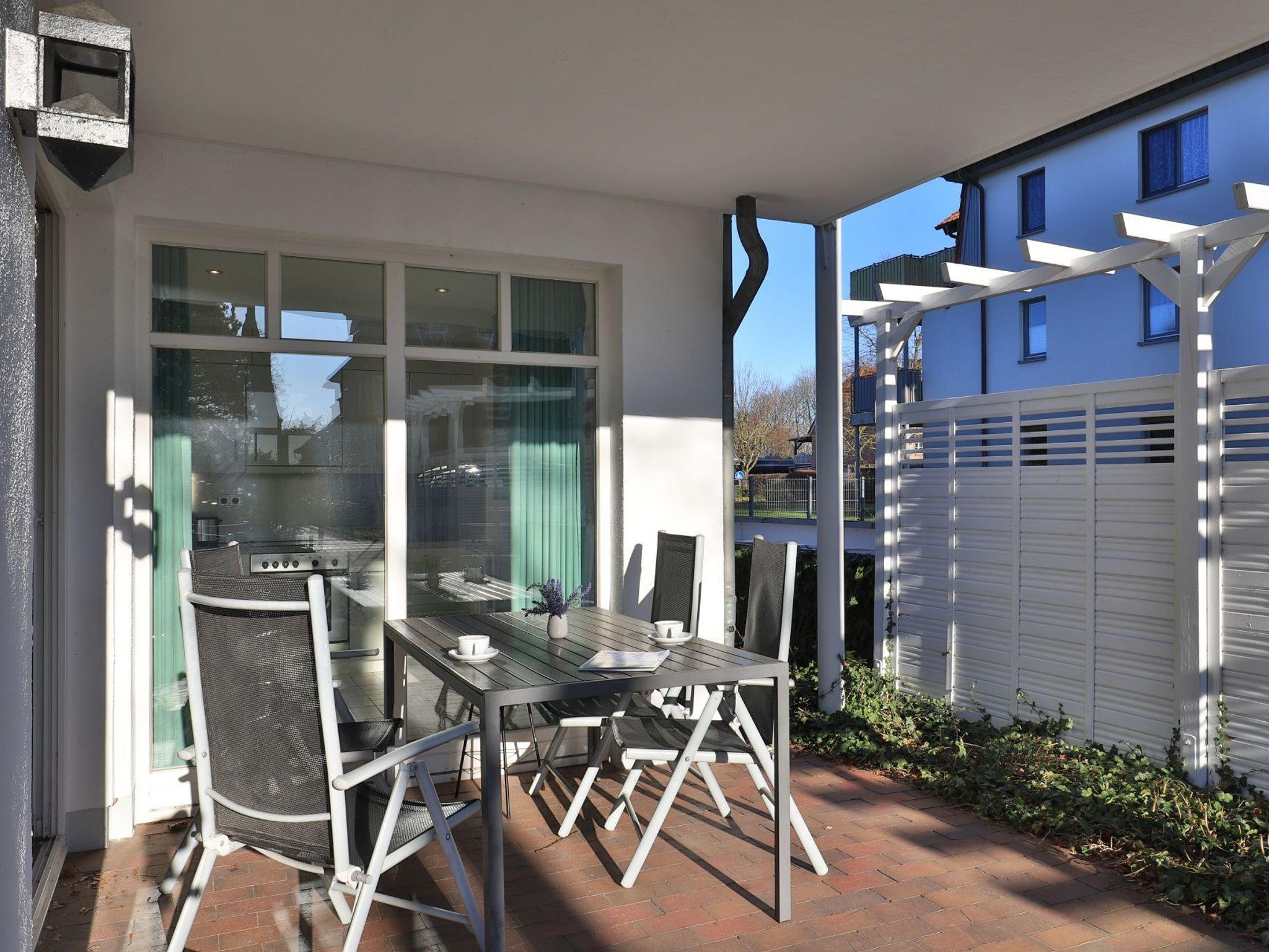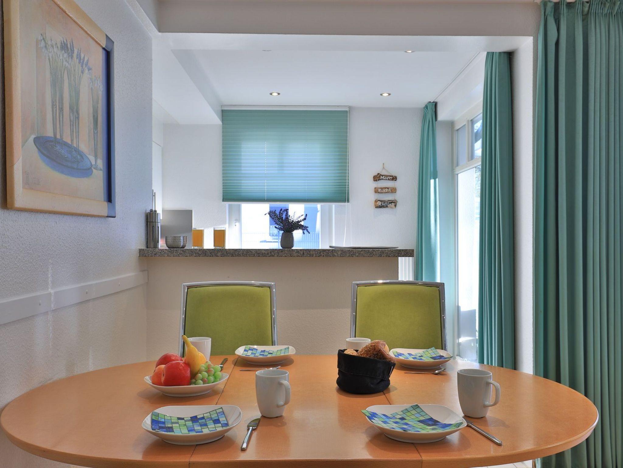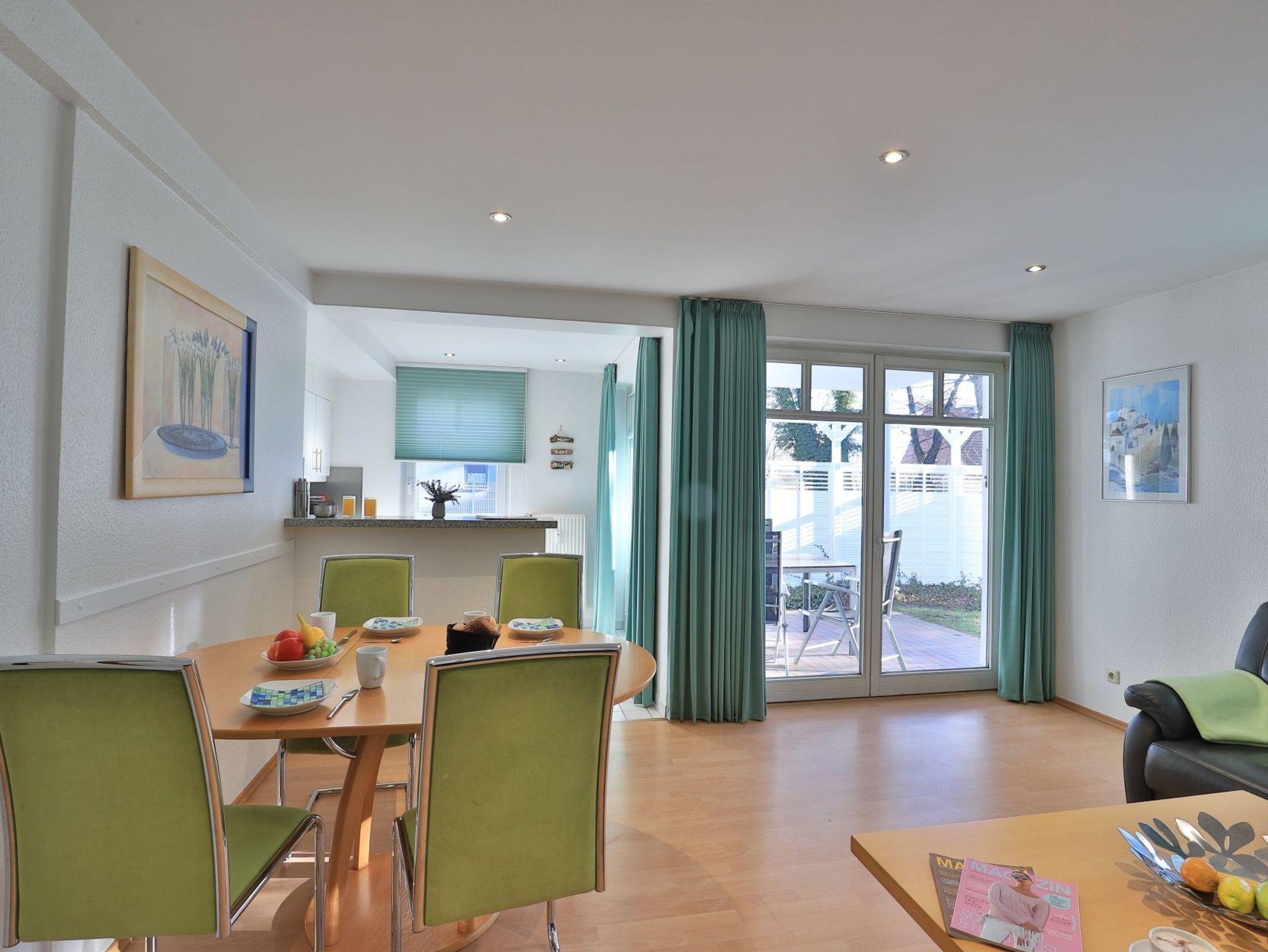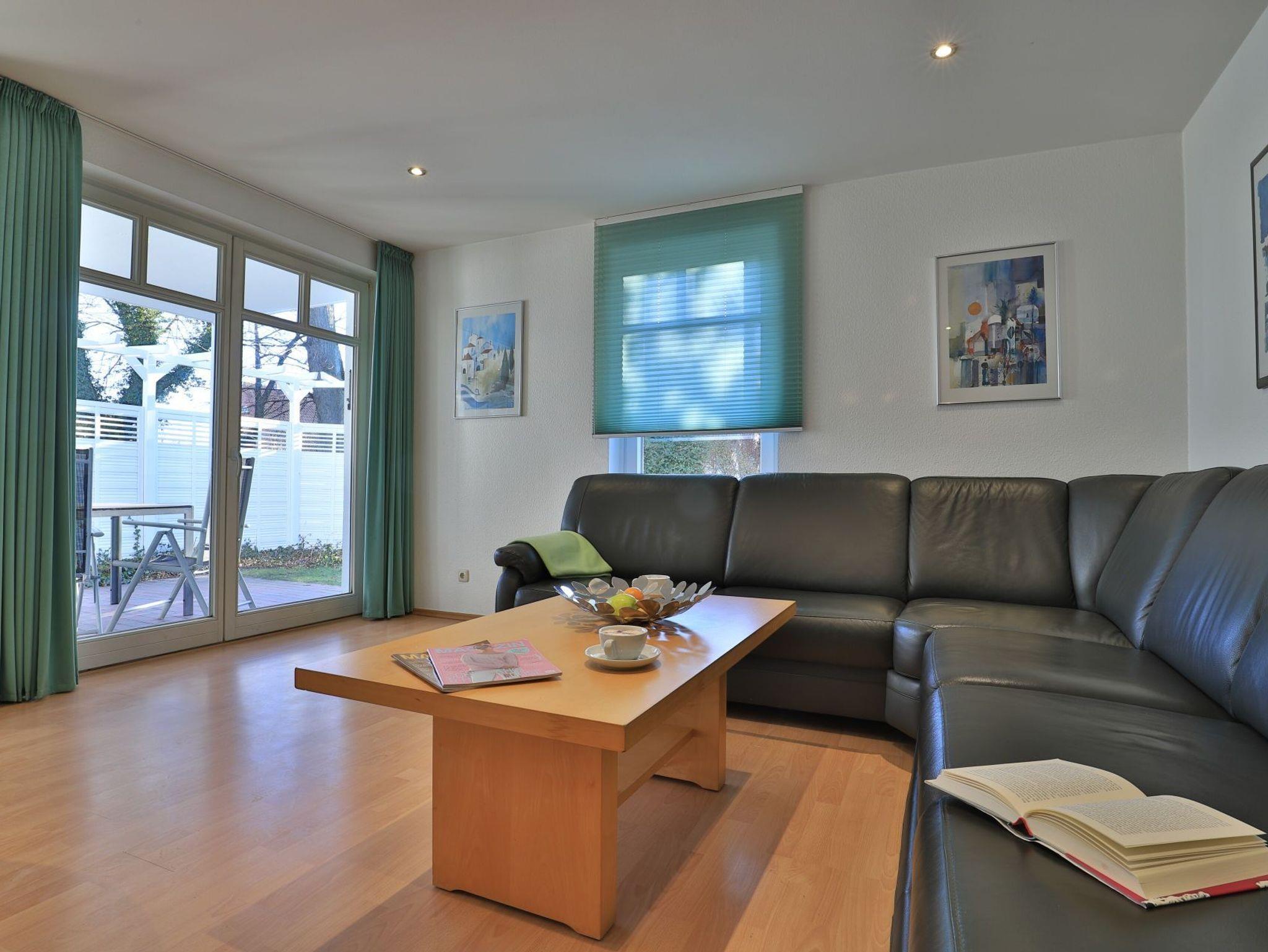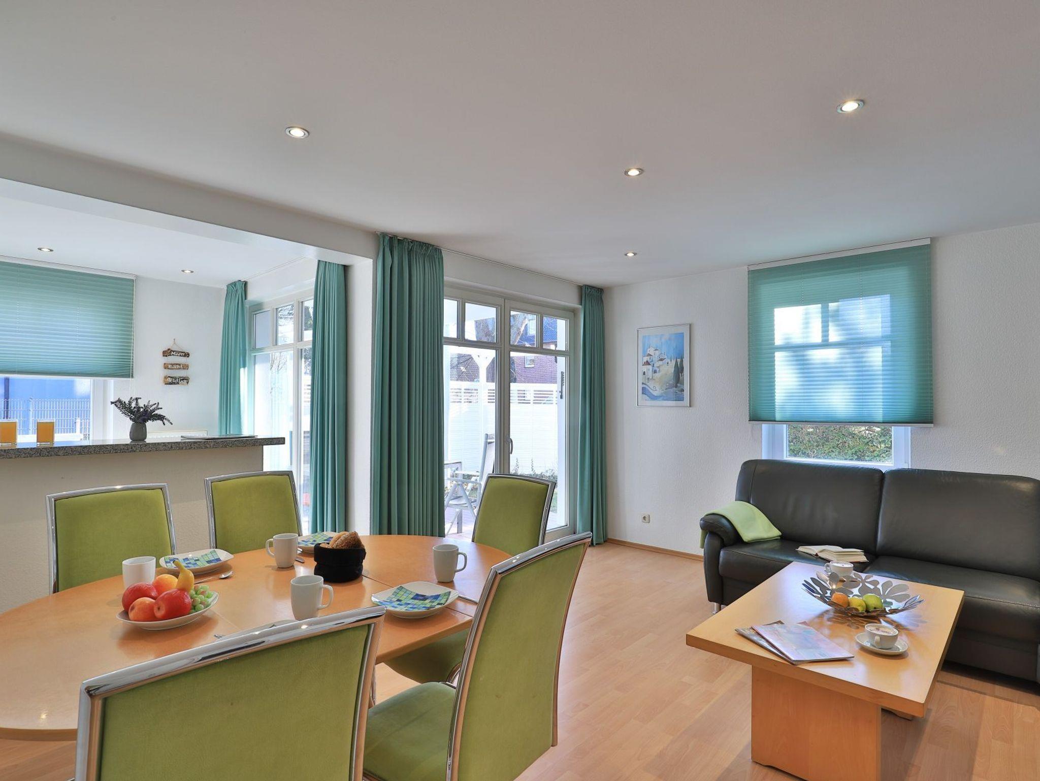 Das familienfreundliche 3-Zimmer-Erdgeschoss-Appartement bietet auf 72qm Platz für bis zu 6 Personen. Es verfügt über eine große Terrasse mit Gartennutzung und liegt in unmittelbarer Nähe zum Strand sowie zum Ortszentrum. Der Wohn-/Essbereich ist komfortabel möbliert und enthält ein großzügiges Ecksofa, das auch als Schlafsofa genutzt werden kann. Zur technischen Ausstattung gehören zwei Fernseher, eine Bose Soundanlage, ein DVD-Player, ein Radio und kostenloses WLAN. Die offene Wohnküche ist komplett ausgestattet mit Ceranfeldherd, Backofen, Mikrowelle, Kühlschrank mit Gefrierfach, Geschirrspüler, Kaffeemaschine, Wasserkocher und Toaster. Für gemeinsame Mahlzeiten steht ein Esstisch bereit. Die saisonal möblierte Terrasse ist überdacht. Es gibt zwei Schlafzimmer, eines mit Doppelbett und Kinderbett sowie das weitere mit Doppelbett und Fernseher. Für die kleinen Gäste sind ein Kinderhochstuhl und ein Kinderbett vorhanden. Außerdem stehen zwei modernisierte Duschbäder zur Verfügung. Bügeleisen, Bügelbrett, Fön befinden sich in der Wohnung. Ihr Auto parken Sie bequem auf einem reservierten Stellplatz in der Tiefgarage. Hunde sind gegen Gebühr herzlich willkommen. Beachten Sie bitte, dass in der Hauptsaison und über den Jahreswechsel eine Mindestmietdauer von einer Woche gilt.