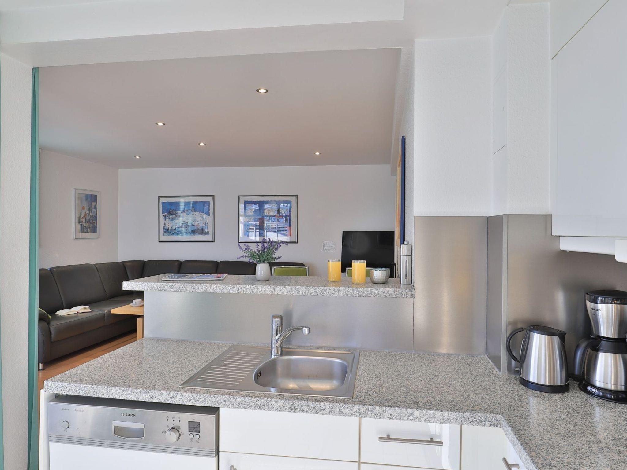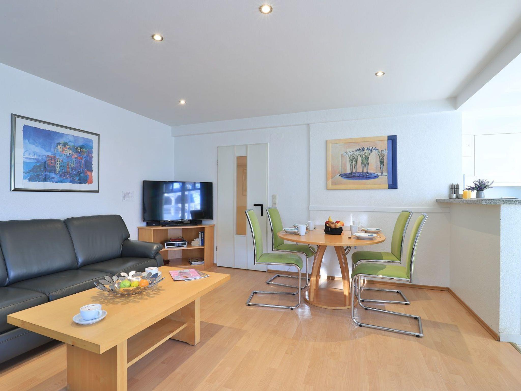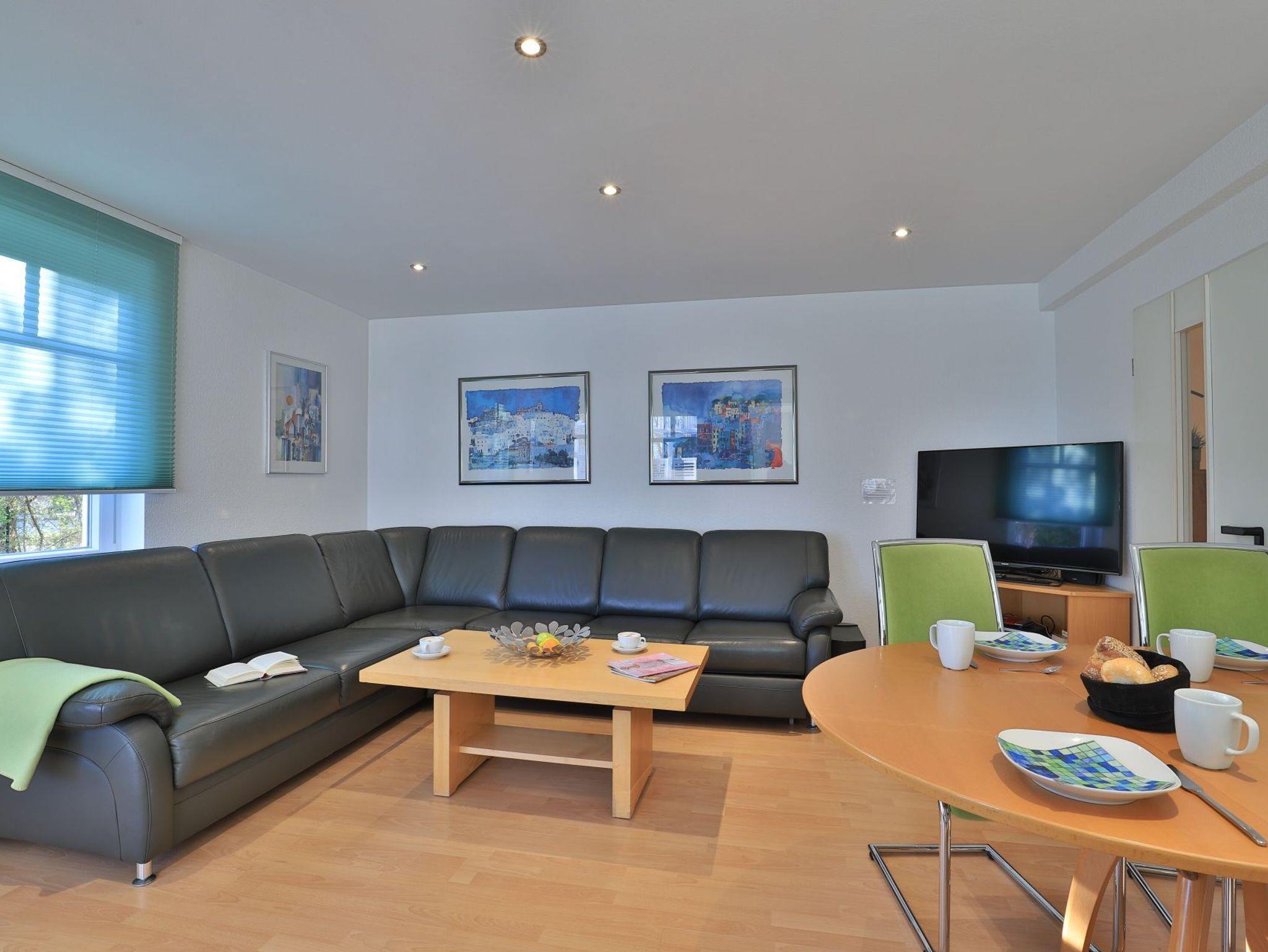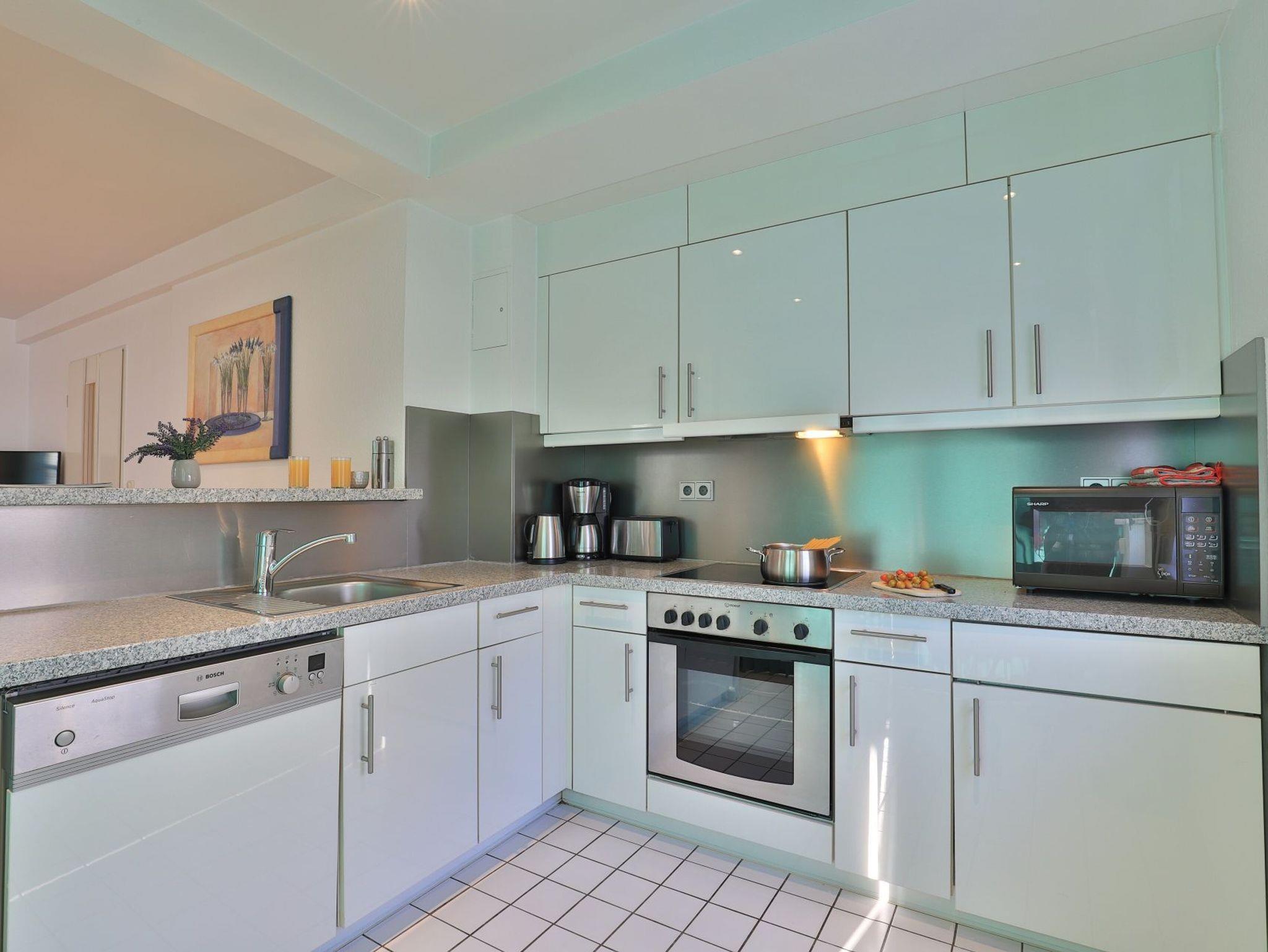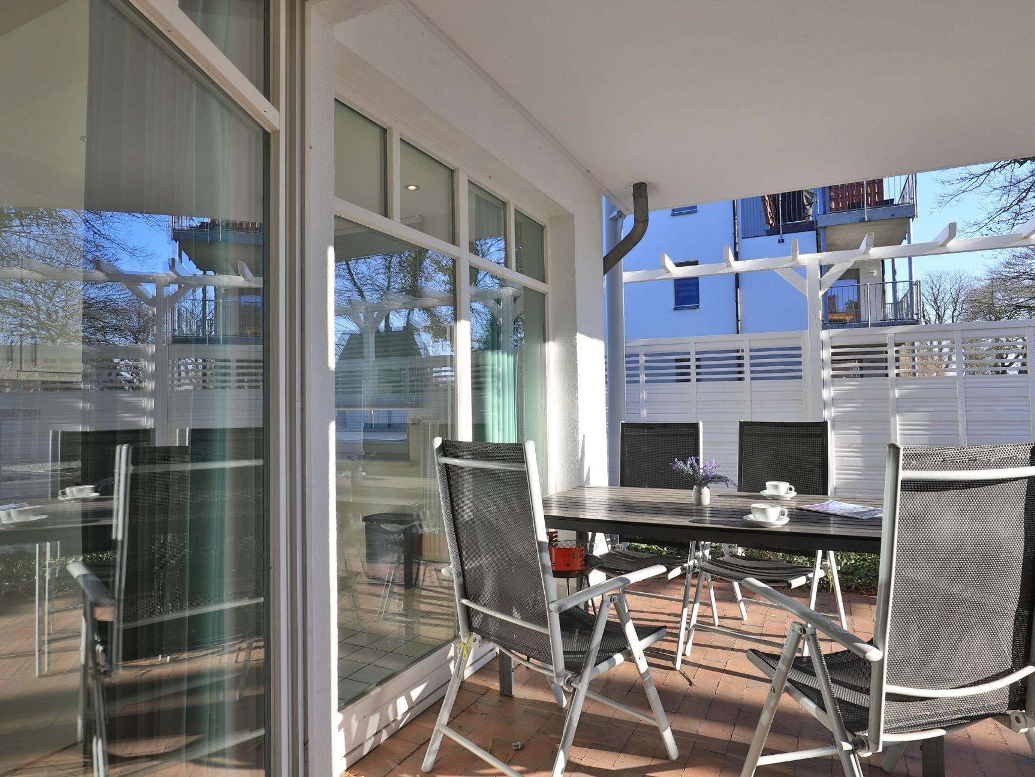Das familienfreundliche 3-Zimmer-Erdgeschoss-Appartement bietet auf 72qm Platz für bis zu 6 Personen. Es verfügt über eine große Terrasse mit Gartennutzung und liegt in unmittelbarer Nähe zum Strand sowie zum Ortszentrum. Der Wohn-/Essbereich ist komfortabel möbliert und enthält ein großzügiges Ecksofa, das auch als Schlafsofa genutzt werden kann. Zur technischen Ausstattung gehören zwei Fernseher, eine Bose Soundanlage, ein DVD-Player, ein Radio und kostenloses WLAN. Die offene Wohnküche ist komplett ausgestattet mit Ceranfeldherd, Backofen, Mikrowelle, Kühlschrank mit Gefrierfach, Geschirrspüler, Kaffeemaschine, Wasserkocher und Toaster. Für gemeinsame Mahlzeiten steht ein Esstisch bereit. Die saisonal möblierte Terrasse ist überdacht. Es gibt zwei Schlafzimmer, eines mit Doppelbett und Kinderbett sowie das weitere mit Doppelbett und Fernseher. Für die kleinen Gäste sind ein Kinderhochstuhl und ein Kinderbett vorhanden. Außerdem stehen zwei modernisierte Duschbäder zur Verfügung. Bügeleisen, Bügelbrett, Fön befinden sich in der Wohnung. Ihr Auto parken Sie bequem auf einem reservierten Stellplatz in der Tiefgarage. Hunde sind gegen Gebühr herzlich willkommen. Beachten Sie bitte, dass in der Hauptsaison und über den Jahreswechsel eine Mindestmietdauer von einer Woche gilt.
