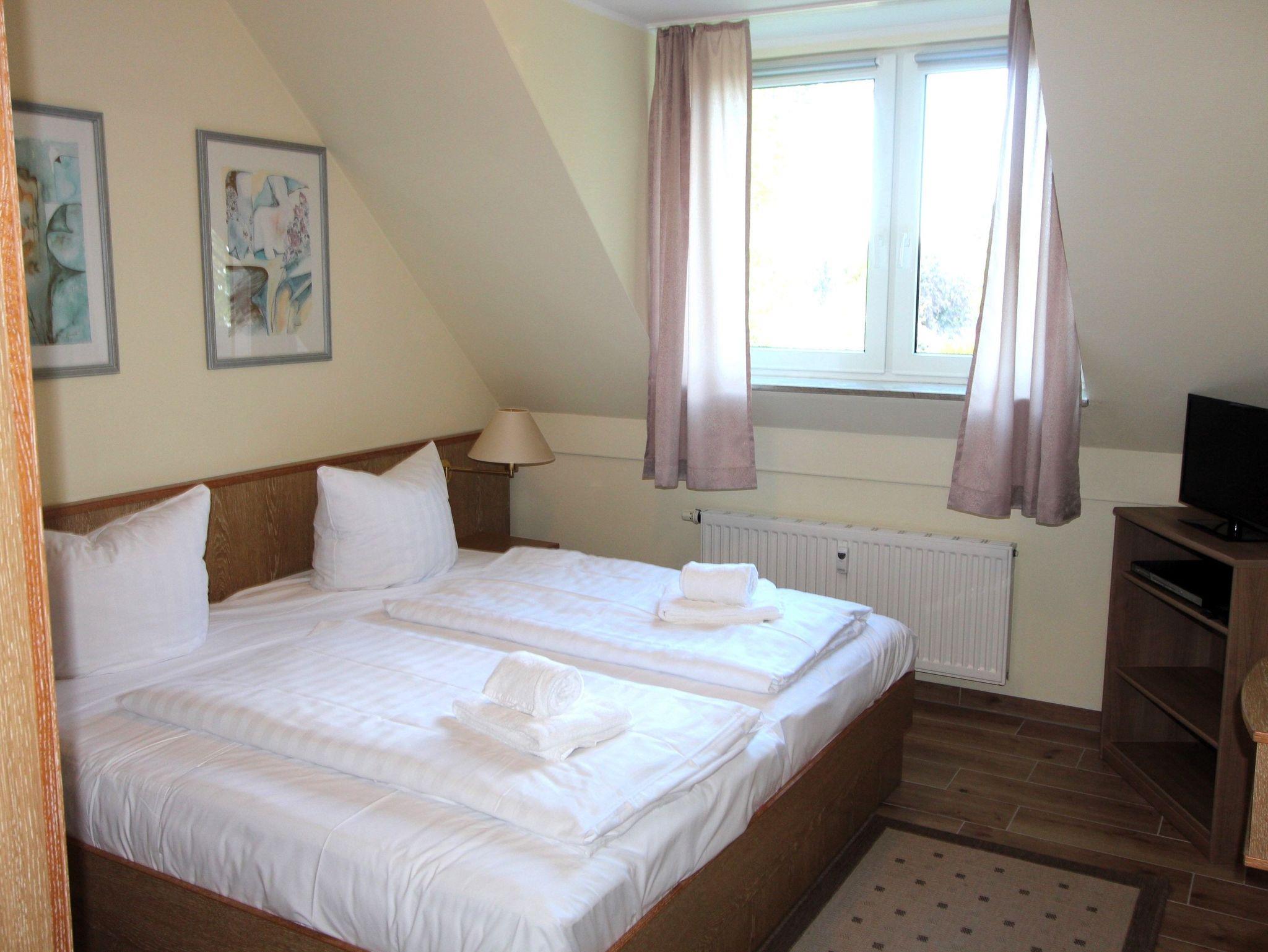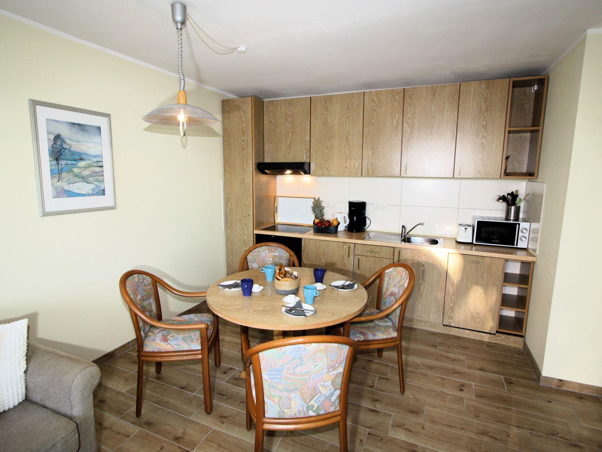 Sie wohnen in einem 2-Zimmer-Appartement für bis zu 4 Personen, ca. 46m², ein Schlafzimmer mit Doppelbett, Wohn-/Schlafraum mit bequemer Doppelbettcouch, separater Essplatz, voll ausgestatteter Küchenbereich, Dusche/WC, Balkon, SAT-TV mit Empfang sky, Telefon.