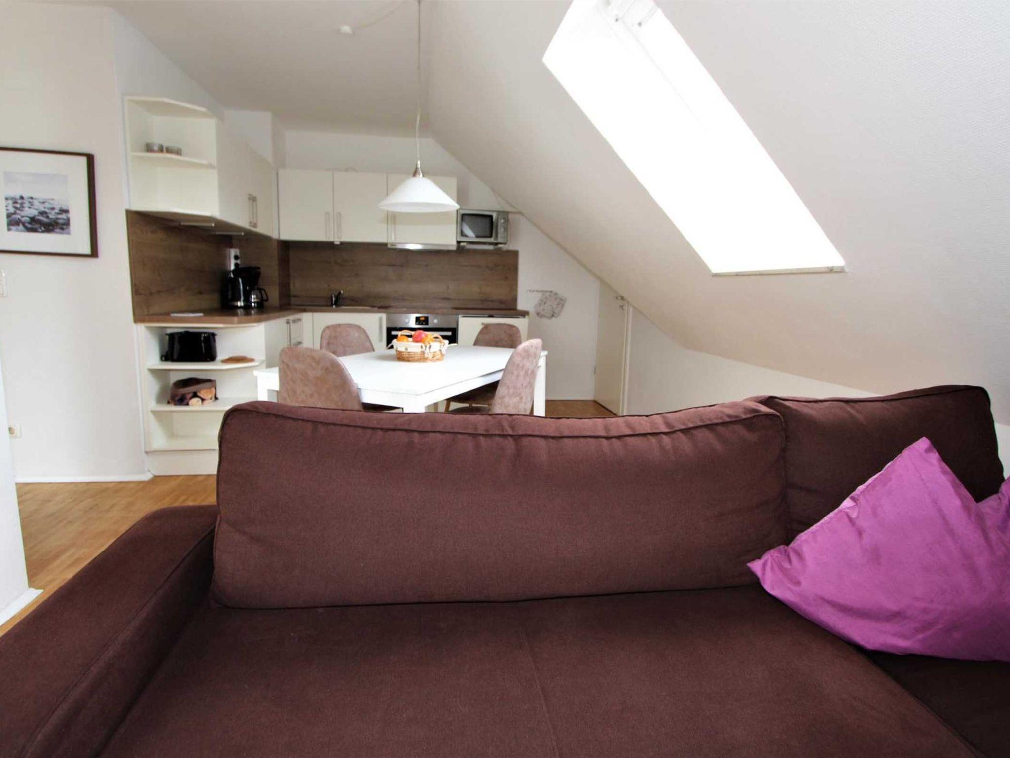 Sehr helles und großzügiges 2-Zimmer-Appartment im Dachgeschoss (Fahrstuhl vorhanden). Das geräumige Schlafzimmer mit Doppelbett und die gemütliche Schlafcouch im Wohnzimmer bieten Platz für bis zu 4 Personen. Im Schlafzimmer kann zusätzlich problemlos ein Kinderbett aufgestellt werden. Die große Dachterrasse lädt zu gemütlichen Stunden im Freien ein. Die Wohnung bietet Ihnen mit 2 x Flat TV, DVD Player, sky-Empfang, Playstation II, Stereoanlage und Telefon viel Komfort. Die Küche ist komplett ausgestattet mit Ceranfeld, Backofen, Geschirrspüler, Mikrowelle und seperatem Essplatz.