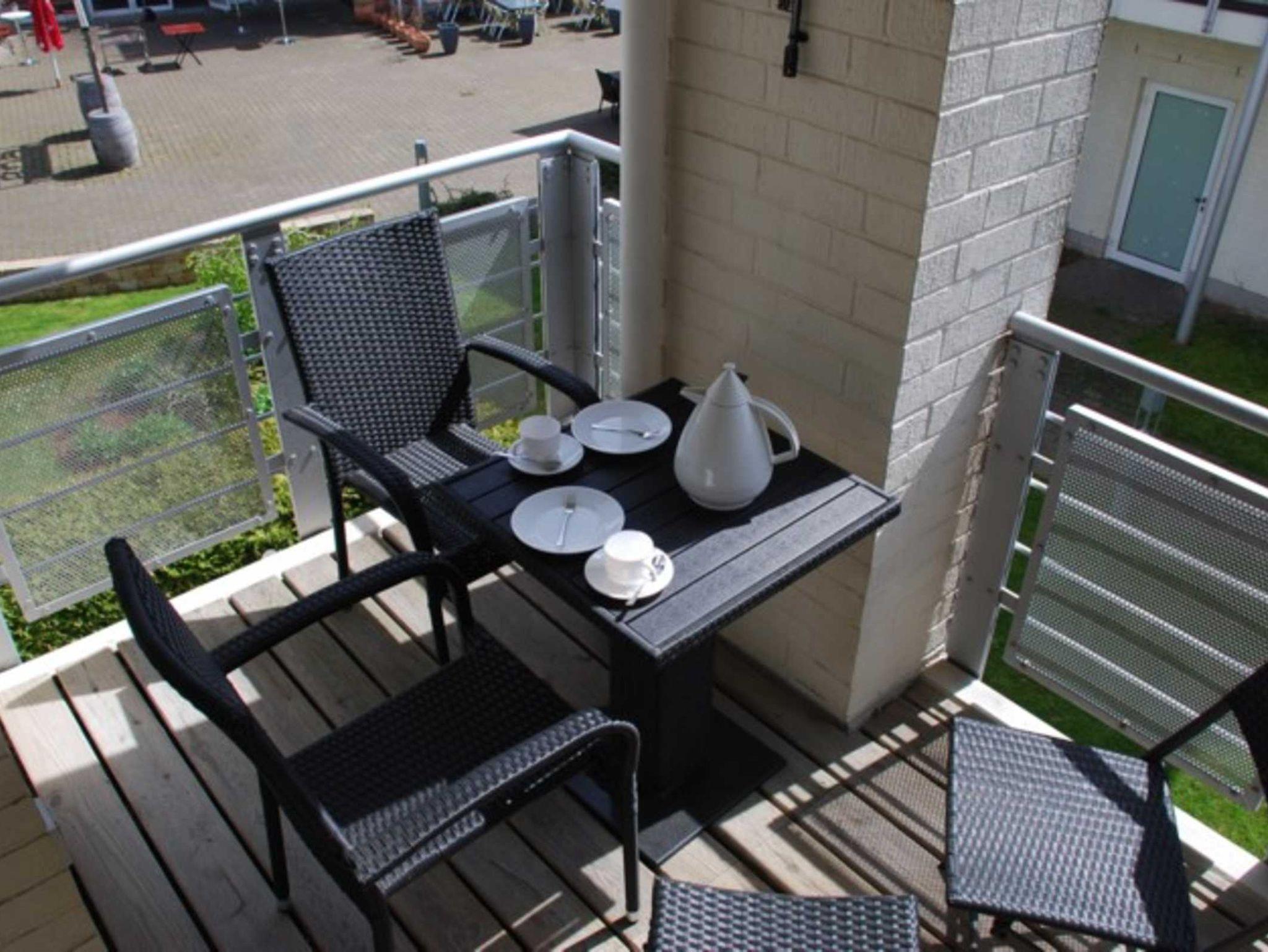 Sie wohnen im 1. OG einer 48 m² großen 2-Raum-Ferienwohnung für bis zu 4 Personen. Die Wohnung ist zum ruhigen Innenhof der Anlage ausgerichtet und verfügt über einen Balkon mit Morgensonne.
