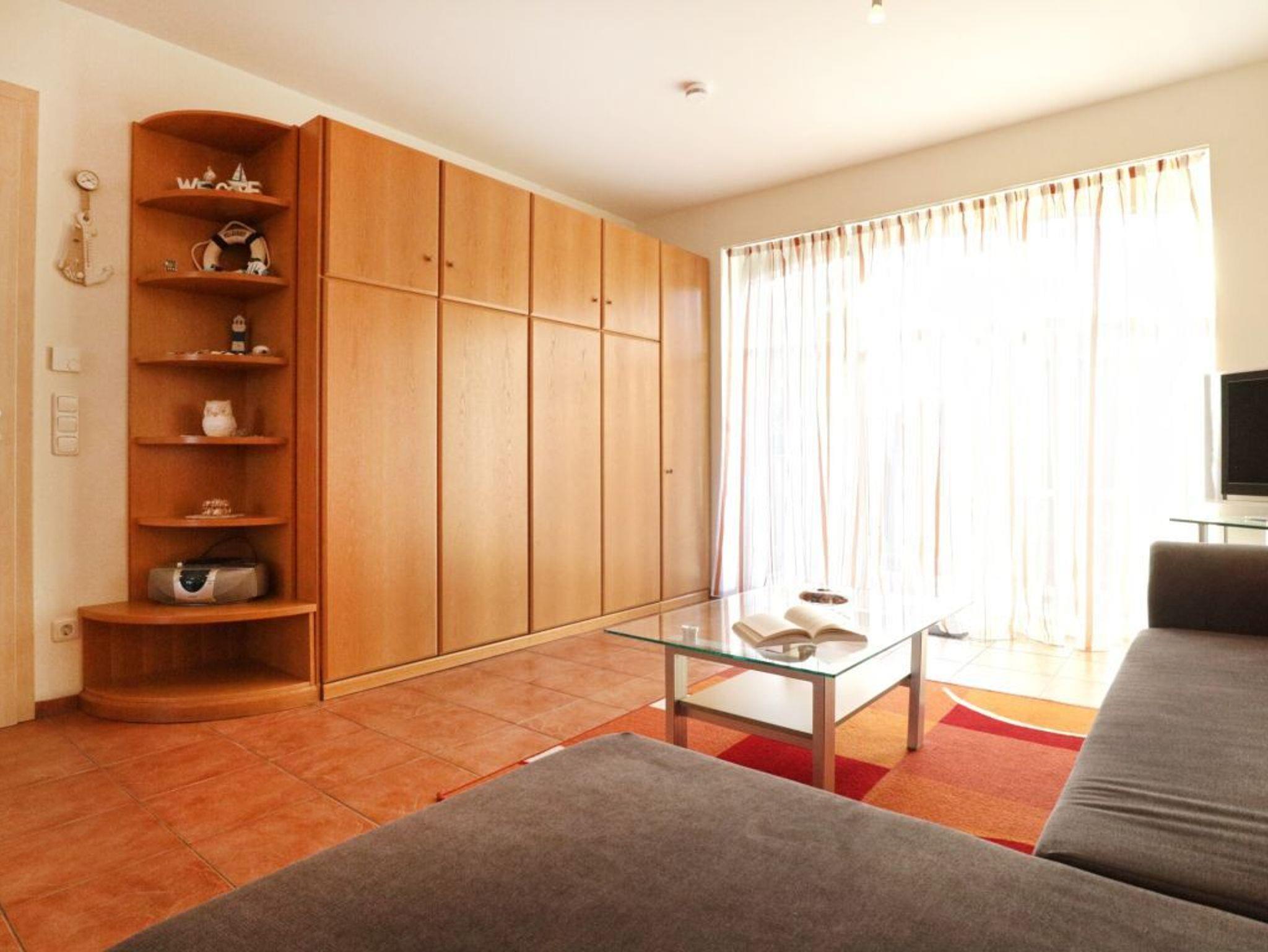 Nur 30m zur Ostsee verwöhnt das hochwertig eingerichtete 2-Zimmer Appartement mit einer großzügigen Wohnfläche von 61qm zudem Balkon und Terrasse sowie Gartennutzung. Eine Belegung dieser Ferienwohnung ist mit max. 4 Personen möglich. Im hellen Wohn-Essbereich mit teilweise bodentiefen Fenstern, befindet sich ein bequemes Sofa, wie auch zwei einzelne Schrankbetten als zusätzliche Schlafgelegenheiten für zwei Personen. Ebenso sind Fernseher und Musikanlage vorhanden. Ideal für Selbstversorger bietet die offene Wohnküche sämtliche Vorzüge zur Mahlzeitenzubereitung mit: Ceranherd, Backofen, Mikrowelle, Kühlschrank mit Frostfach, Spülmaschine, Wasserkocher, Kaffeemaschine, Toaster u.v.m. Gemeinsame Mahlzeiten können Sie am Esstisch zu sich nehmen. Auf dem saisonal möblierten Süd-West Balkon können Sie ebenso entspannen, wie auf der nach Norden ausgerichteten Terrasse. Das separate Schlafzimmer ist mit einem Doppelbett mit den Maßen 2,00m mal 2,00m sowie einem Kleiderschrank und einem 2. Fernseher eingerichtet. Die Wohnung besitzt ein geräumiges Tageslicht Duschbad mit Waschtisch, WC.