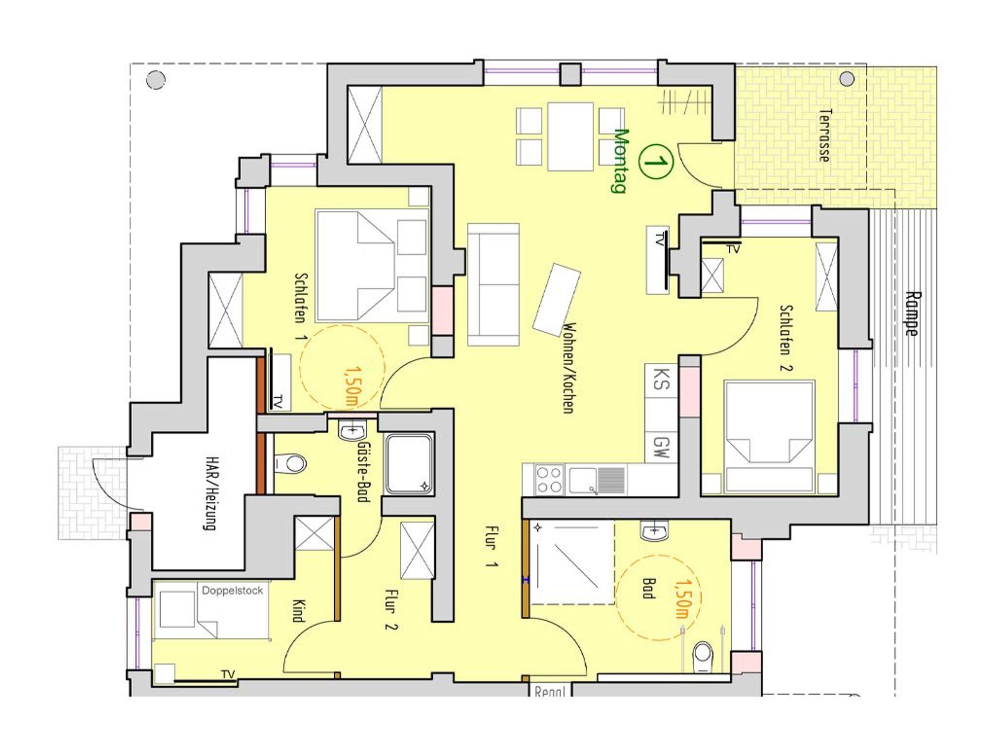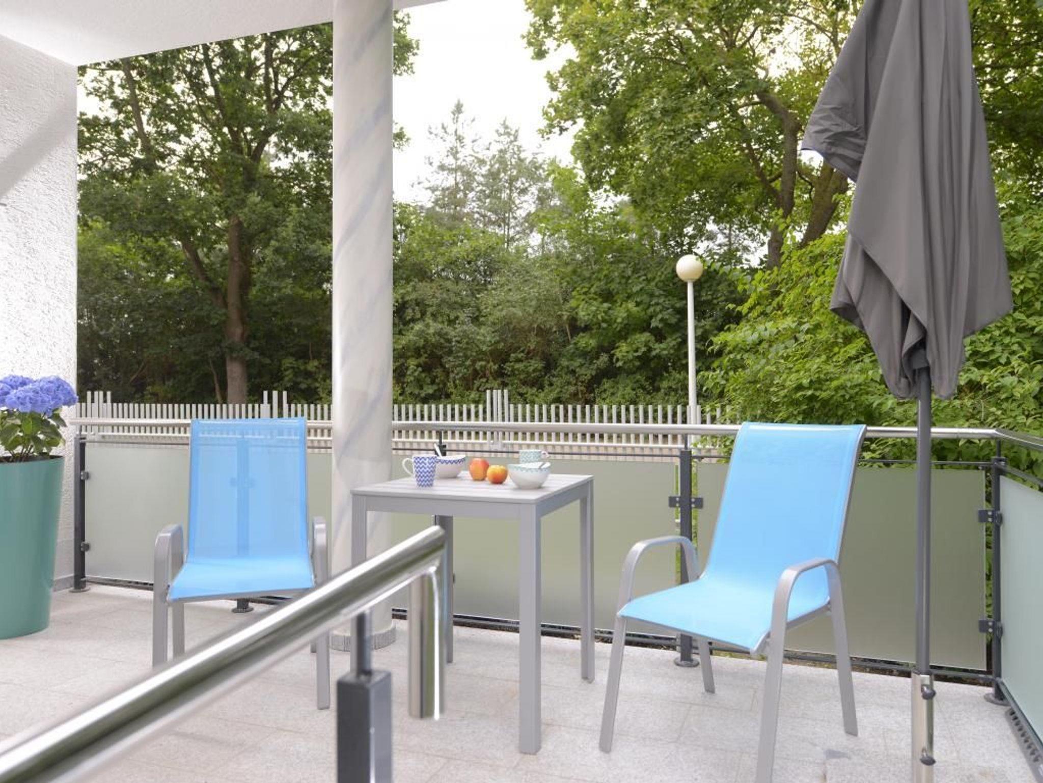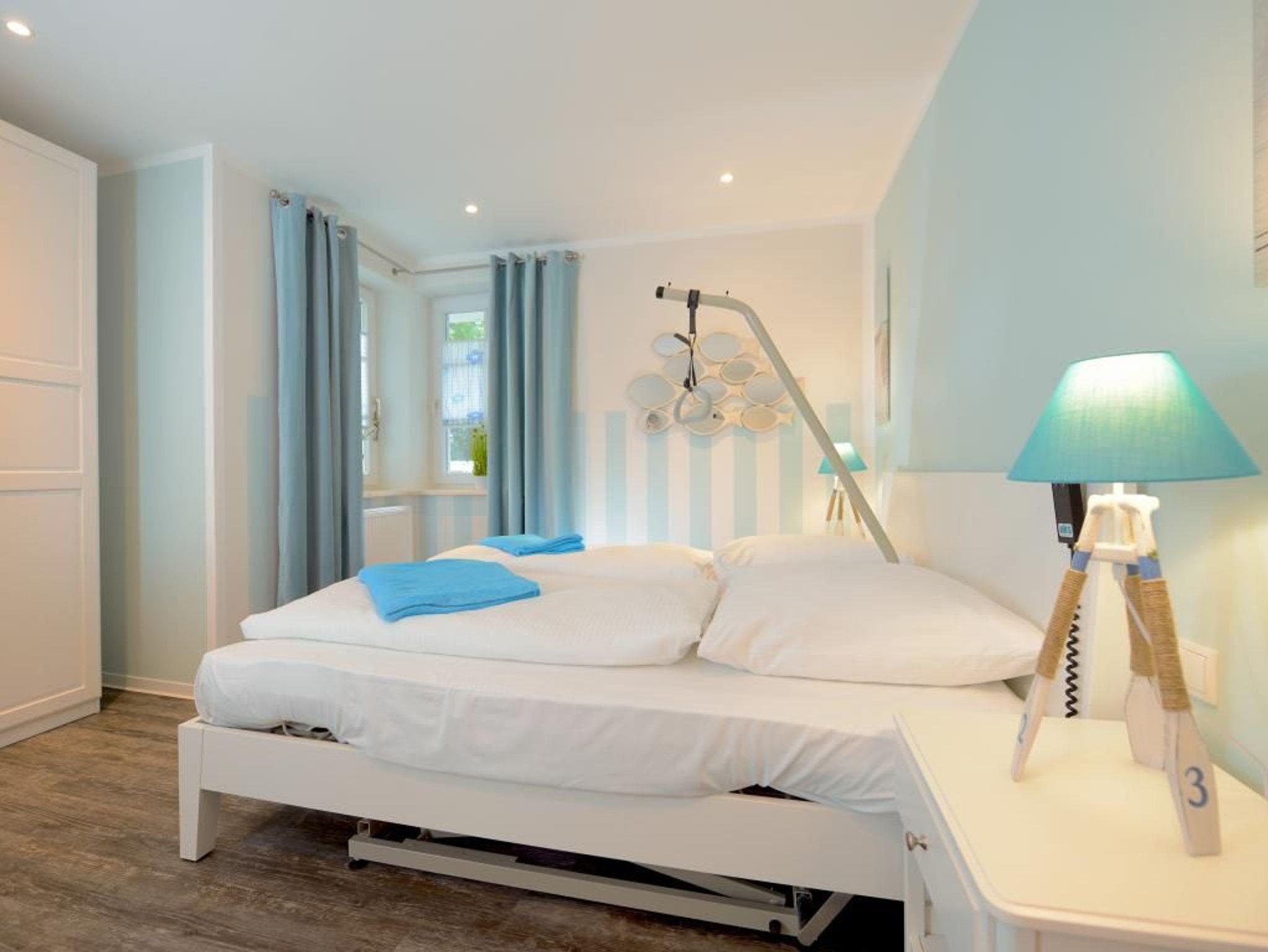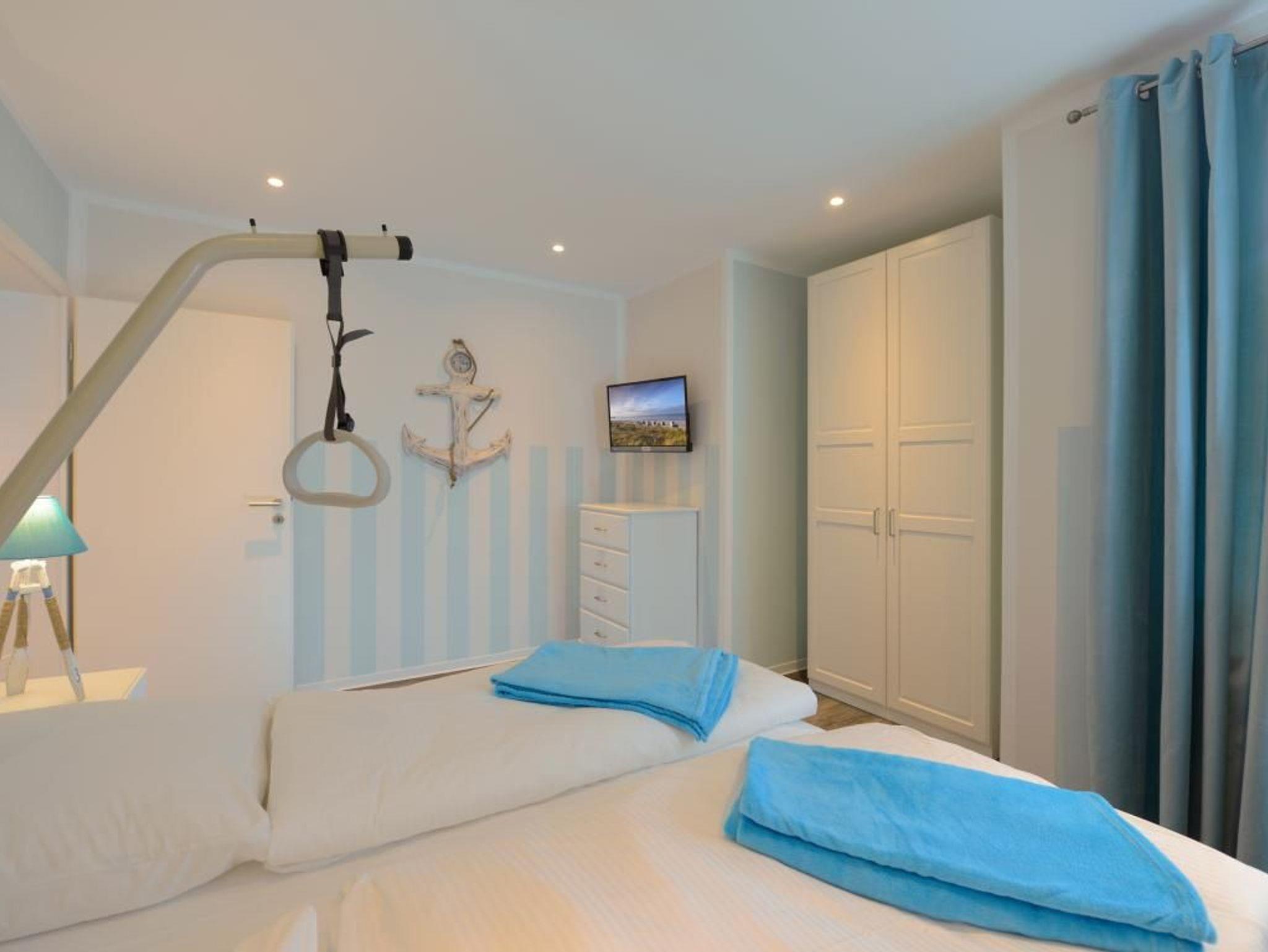 Hervorzuheben ist die, auch für Rollstuhlfahrende nutzbare, Wohnraumküche mit: Herd, Backofen, Dunstabzug, Mikrowelle, Kühlschrank mit integr. Gefrierfach, Geschirrspüler, Kaffeemaschine, Wasserkocher, usw. Während der wärmeren Jahreszeit nutzen Sie die Vorzüge der wohnungseigenen, saisonal möblierten Terrasse in Nord-Ost Ausrichtung, die ebenfalls rollstuhlgerecht mit einer befahrbaren Rampe ausgerüstet ist. Drei separate Schlafzimmer ermöglichen erholsame Nächte -1x mit Doppelbett 1,60m x 2,00m und Kleiderschrank, Fernseher. 1x mit Etagenbett je 0,90m x 2,00m und Fernseher, 1x mit einem hochfahrbaren Pflege-/Doppelbett 1,80m x 2,00m- mit Aufrichthilfe, Kleiderschrank, Fernseher.