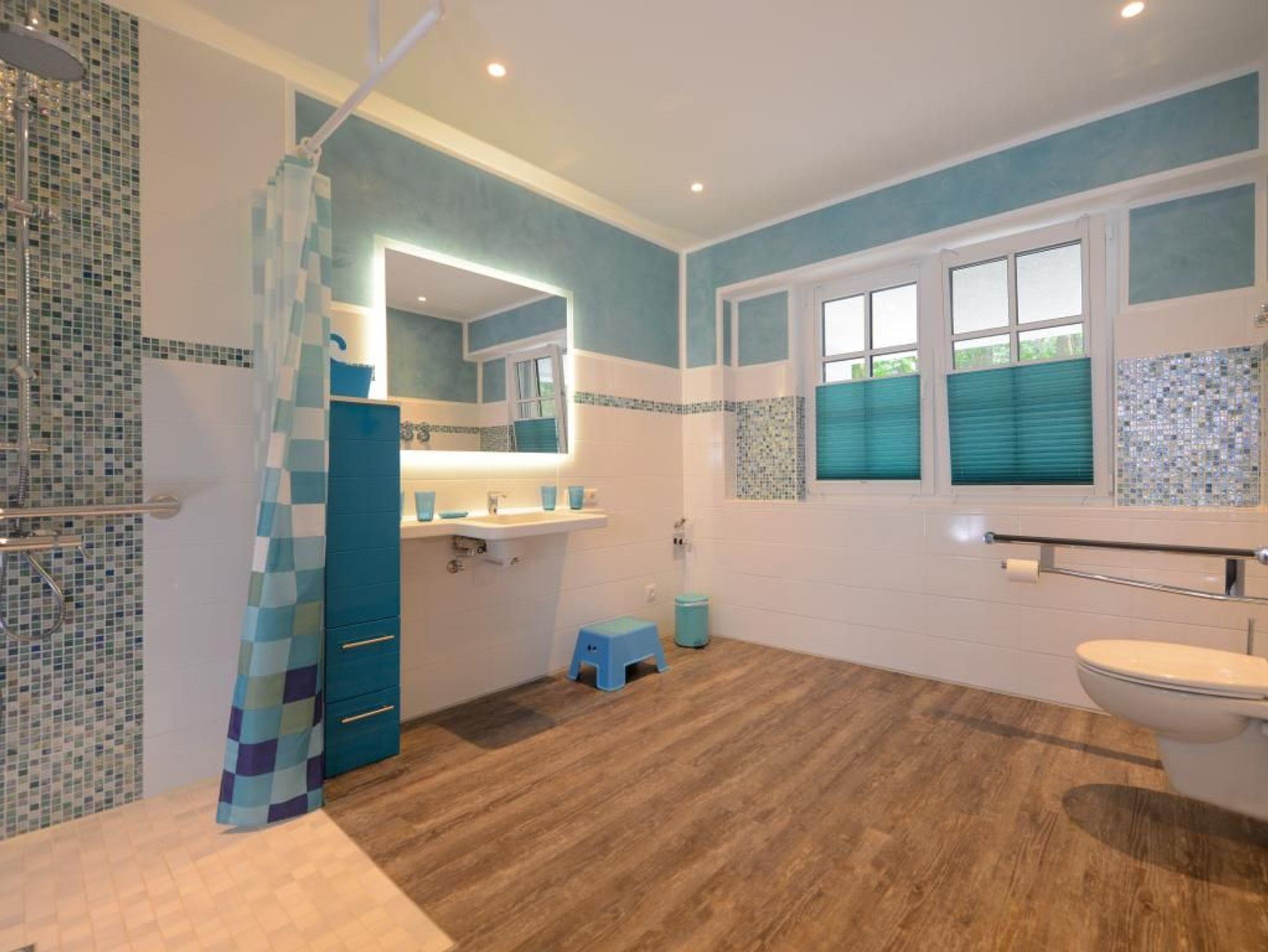 Zwei Komfort Badezimmer runden das Angebot ab. Eines der edlen Bäder ist den Anforderungen von Rollstuhlnutzenden angepasst. Ein weiteres modernes Duschbad mit Waschtisch, WC, ist vorhanden. Bei Anreise sind bezogene Betten für 2 Personen inklusive. Die Nutzung einer Waschmaschine ist möglich. Für Ihren PKW befindet sich ein kostenfreier Außenstellplatz an der Wohnung. Ein Hund ist gegen Gebühr willkommen.