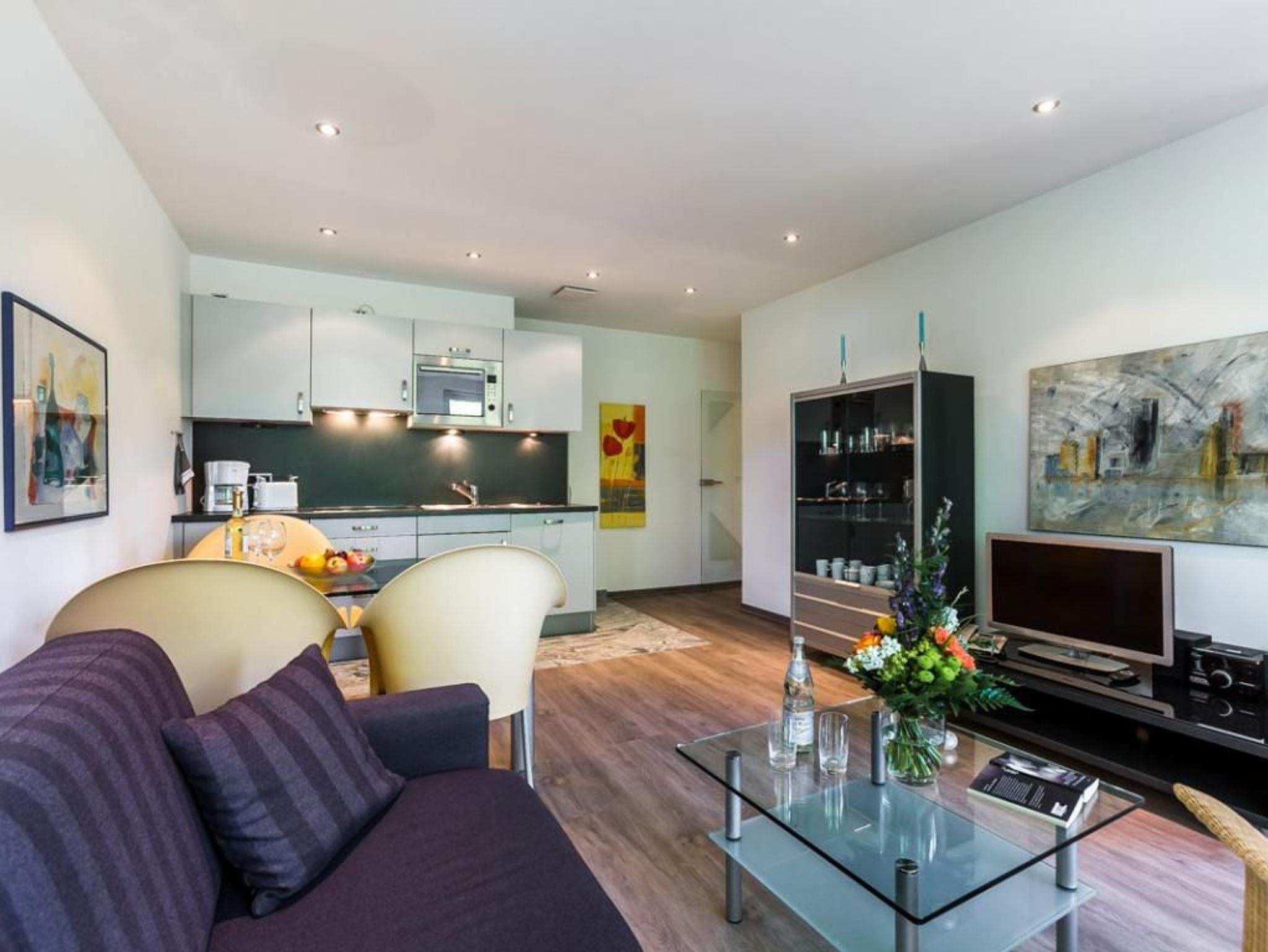 Eine hochwertige Küchenzeile ist in dem Wohnbereich vorhanden und voll ausgestattet mit Ceranfeld Herd, Mikrowelle mit Backfunktion, Geschirrspülmaschine, Wasserkocher, Toaster, Kaffeemaschine sowie ausreichend Kochgeschirr und Essbesteck. Erholsame Nächte verbringen Sie in dem geräumigen Schlafzimmer mit Doppelbett und Kleiderschrank sowie Balkon Zugang.
