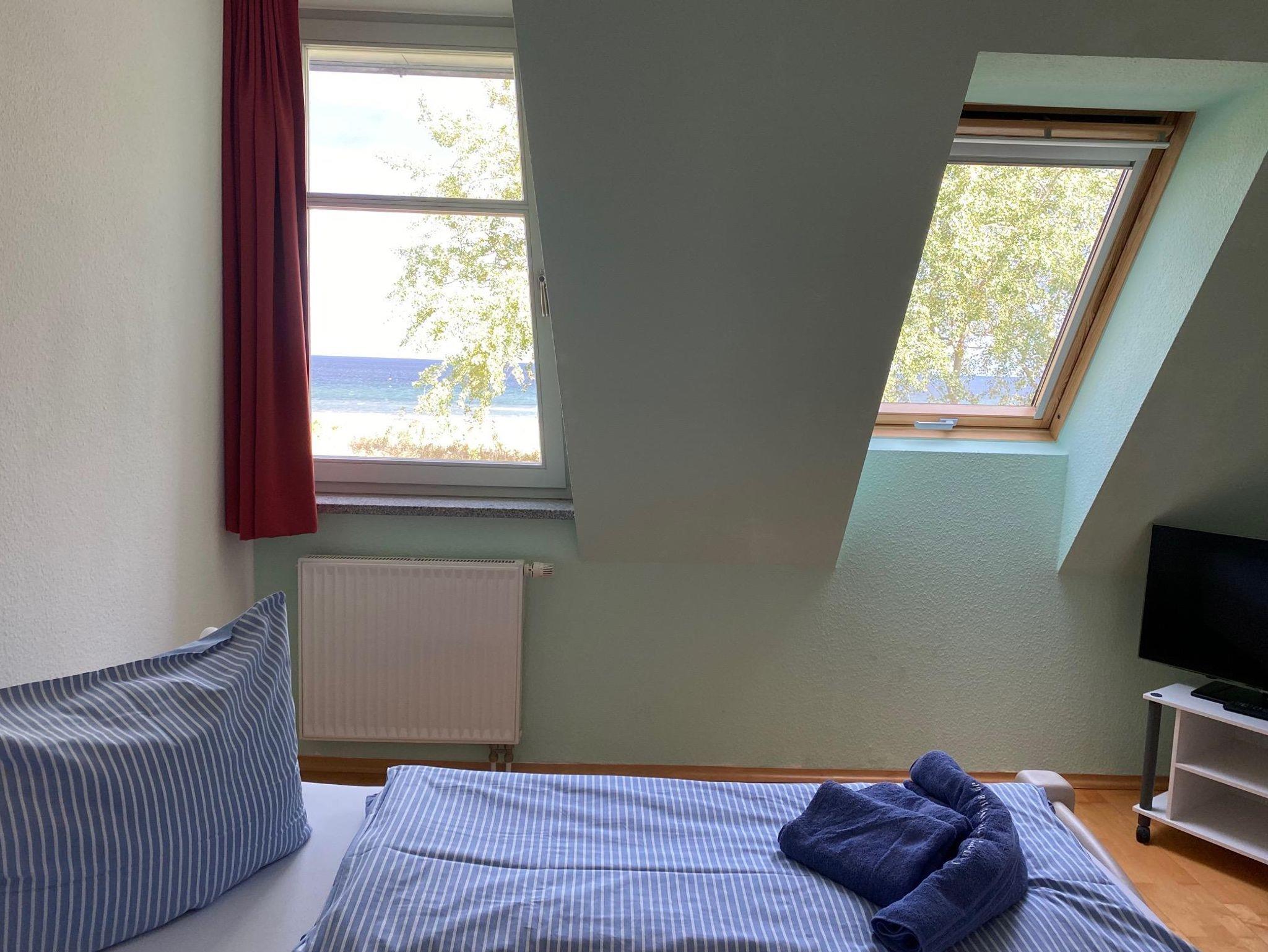 Das Schlafzimmer – ebenfalls mit herrlichem Ostseeblick – ist ausgestattet mit einem Doppelbett (180 x 200 cm) und einem großen Kleiderschrank. Ein weitere Flat Screen TV ist hier ebenfalls vorhanden. Das moderne und zweckmäßig ausgestattetes Tageslichtbad mit Dusche komplettiert die Ausstattung.