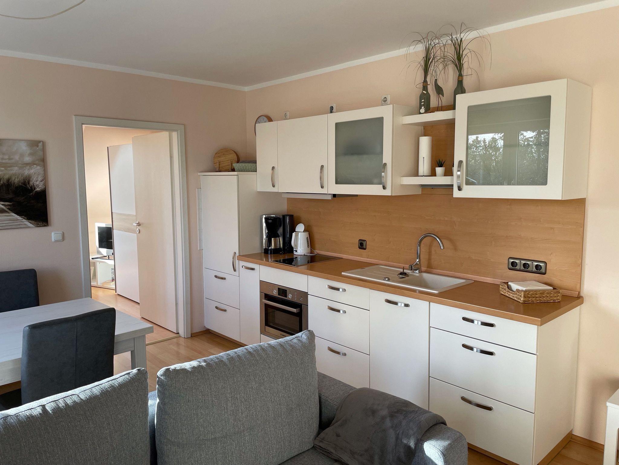 - voll ausgestattete Küche mit kombiniertem Backofen inkl. Mikrowelle