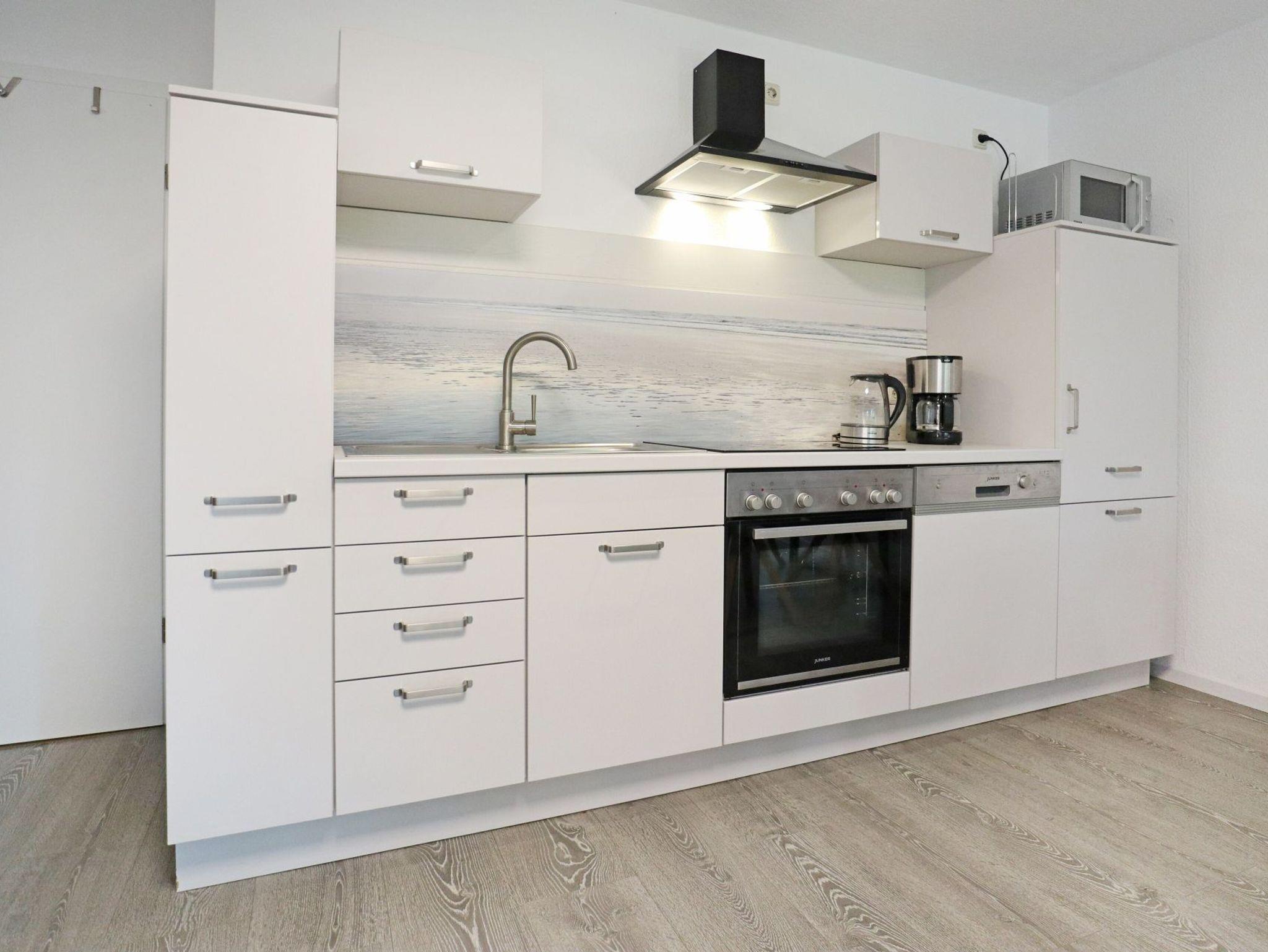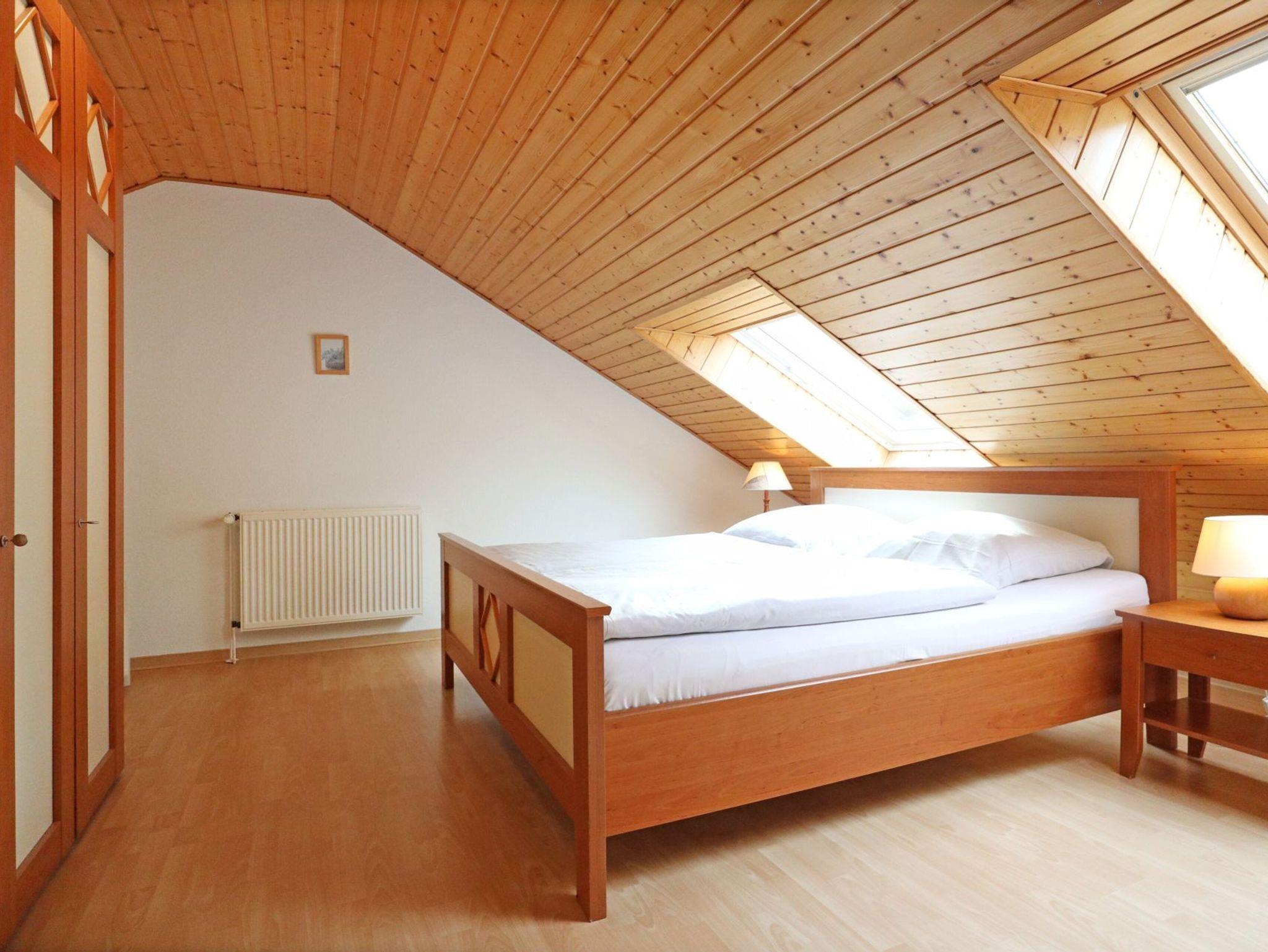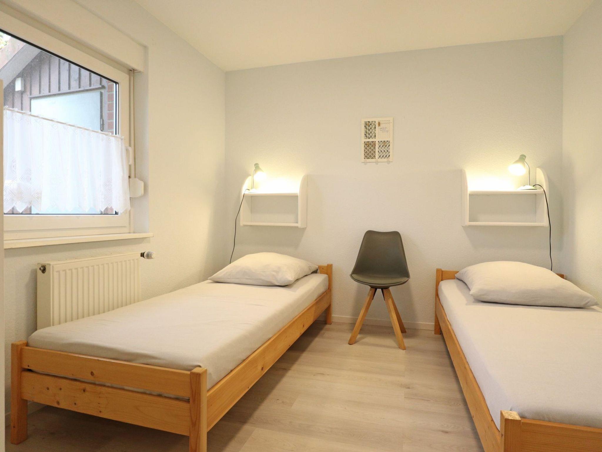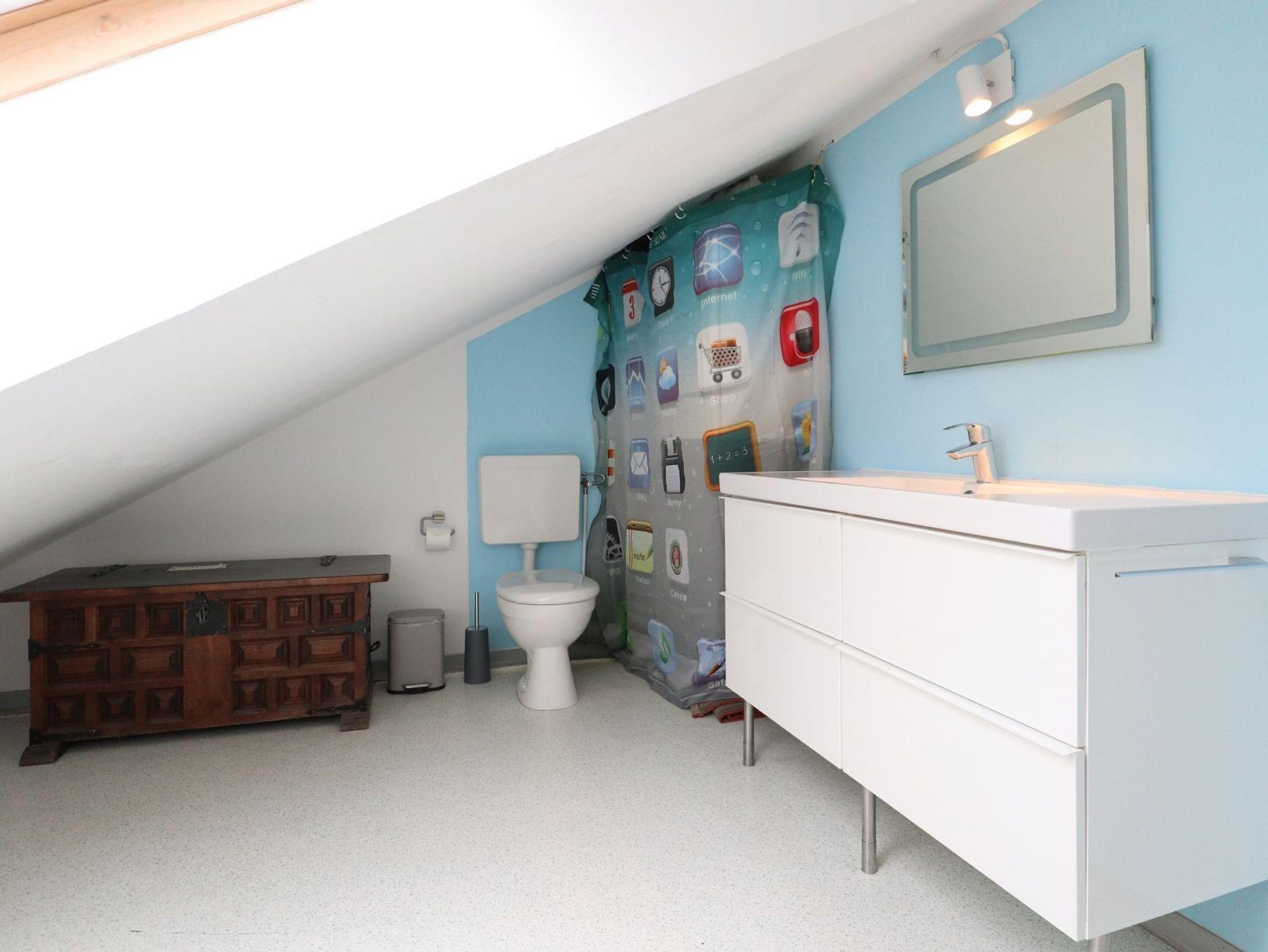 Zudem ist im Wohnbereich eine voll ausgestattete Wohnküche vorhanden, welche mit Herd, Backofen, Mikrowelle, Kühlschrank mit Gefrierfach, Spülmaschine sowie Kaffeemaschine, Wasserkocher und Toaster ausgestattet ist. Zudem befinden sich auf dieser Wohnebene ein separates Schlafzimmer mit zwei Einzelbetten, Kleiderschrank sowie ein Badezimmer mit Dusche, Waschbecken, WC. Ein Gäste-WC mit Waschtisch befindet sich im Obergeschoss. Gerne könne Sie die vorhandene Waschmaschine kostenfrei nutzen. Über eine Treppe gelangen Sie in den oberen Bereich des Hauses, wo sich das zweite Schlafzimmer mit Doppelbett und Kleiderschrank befindet.