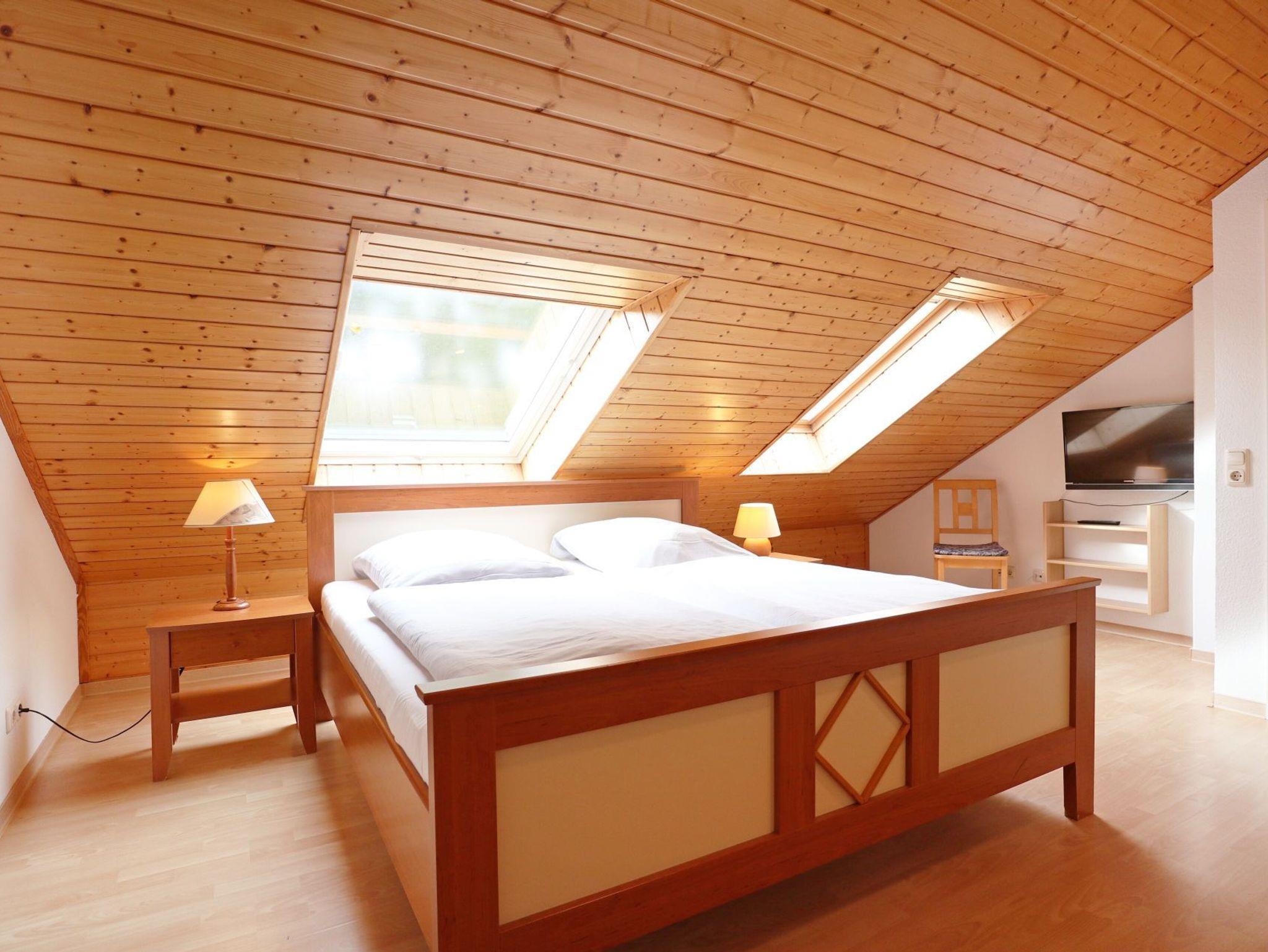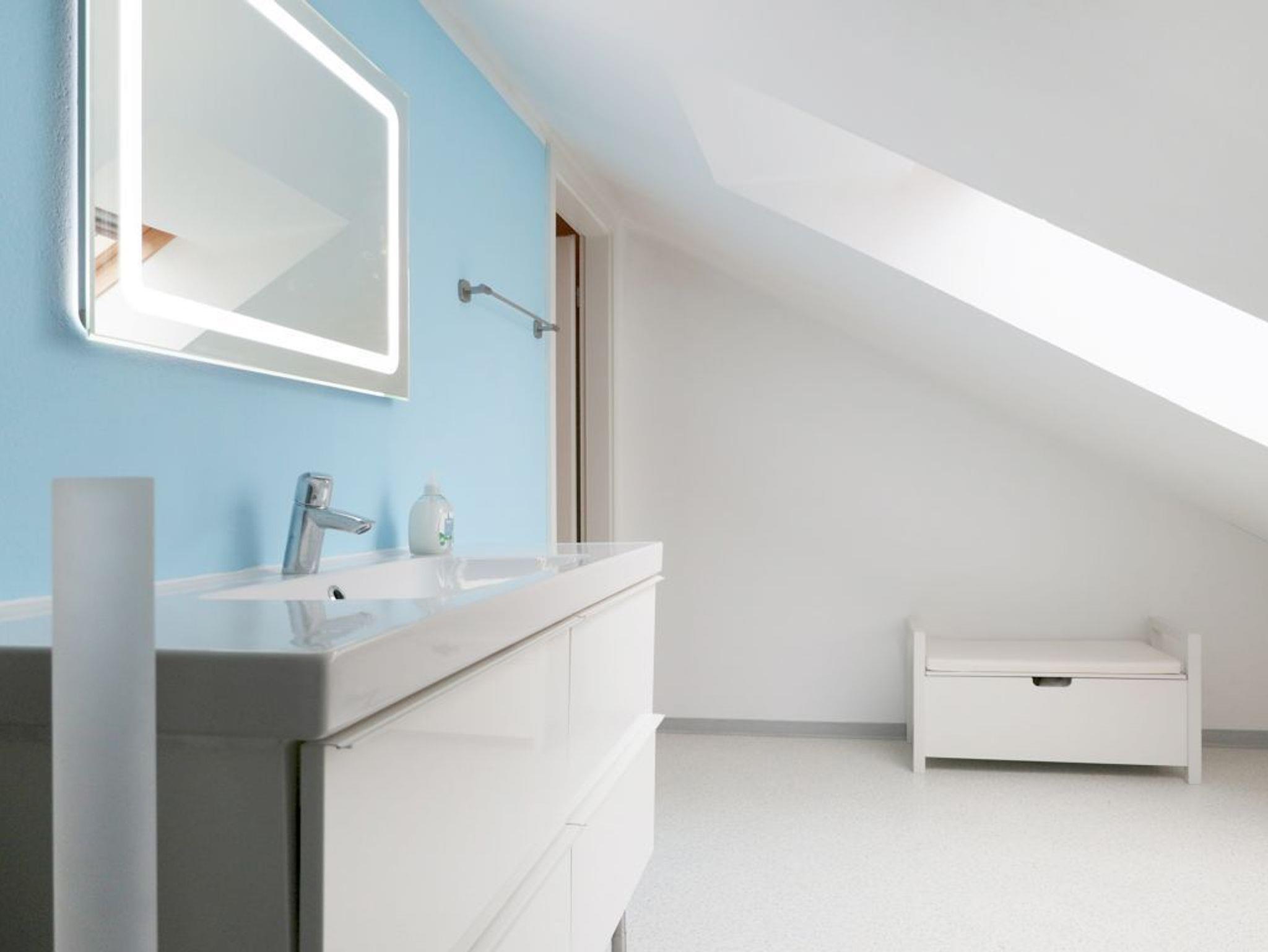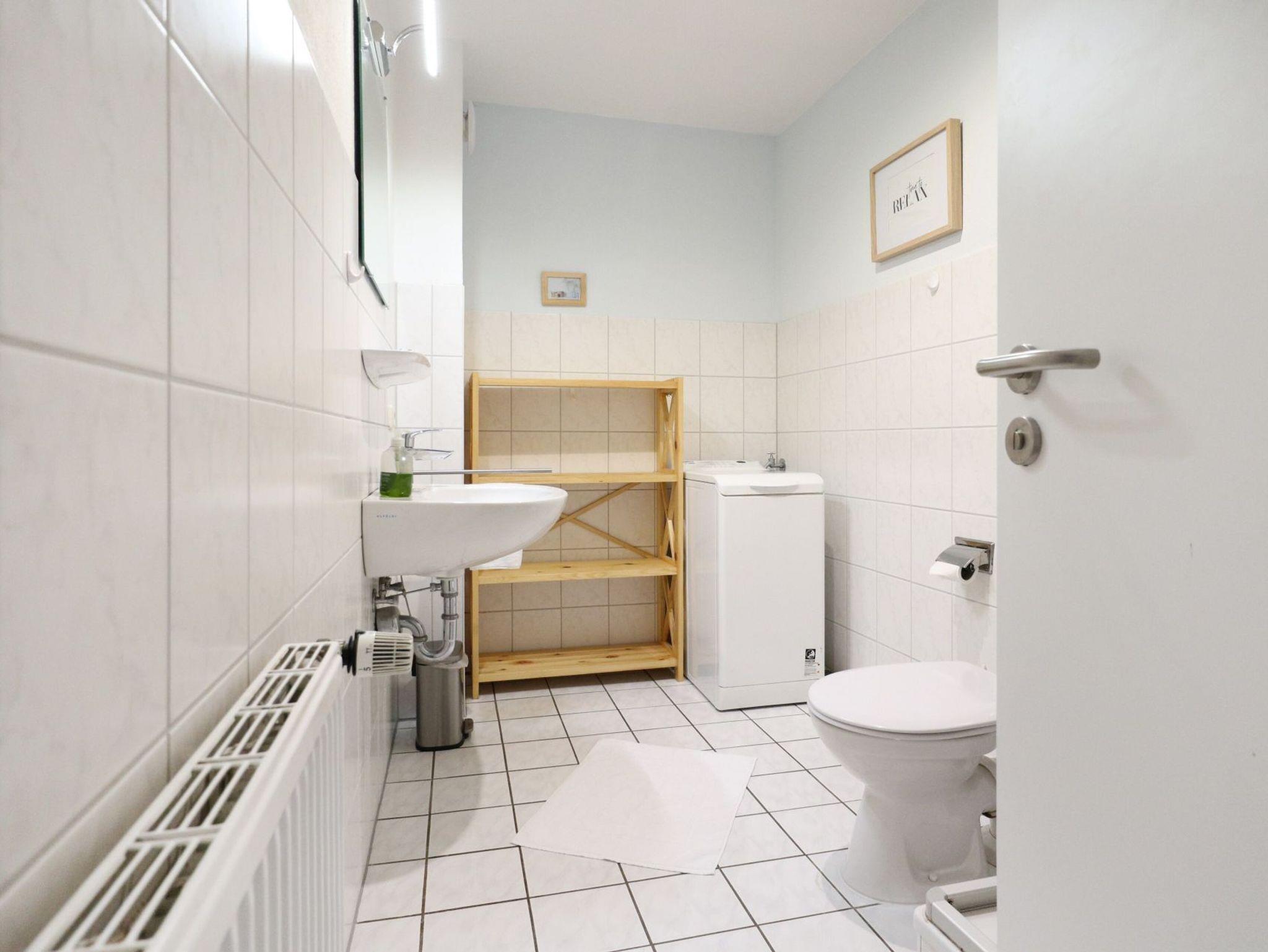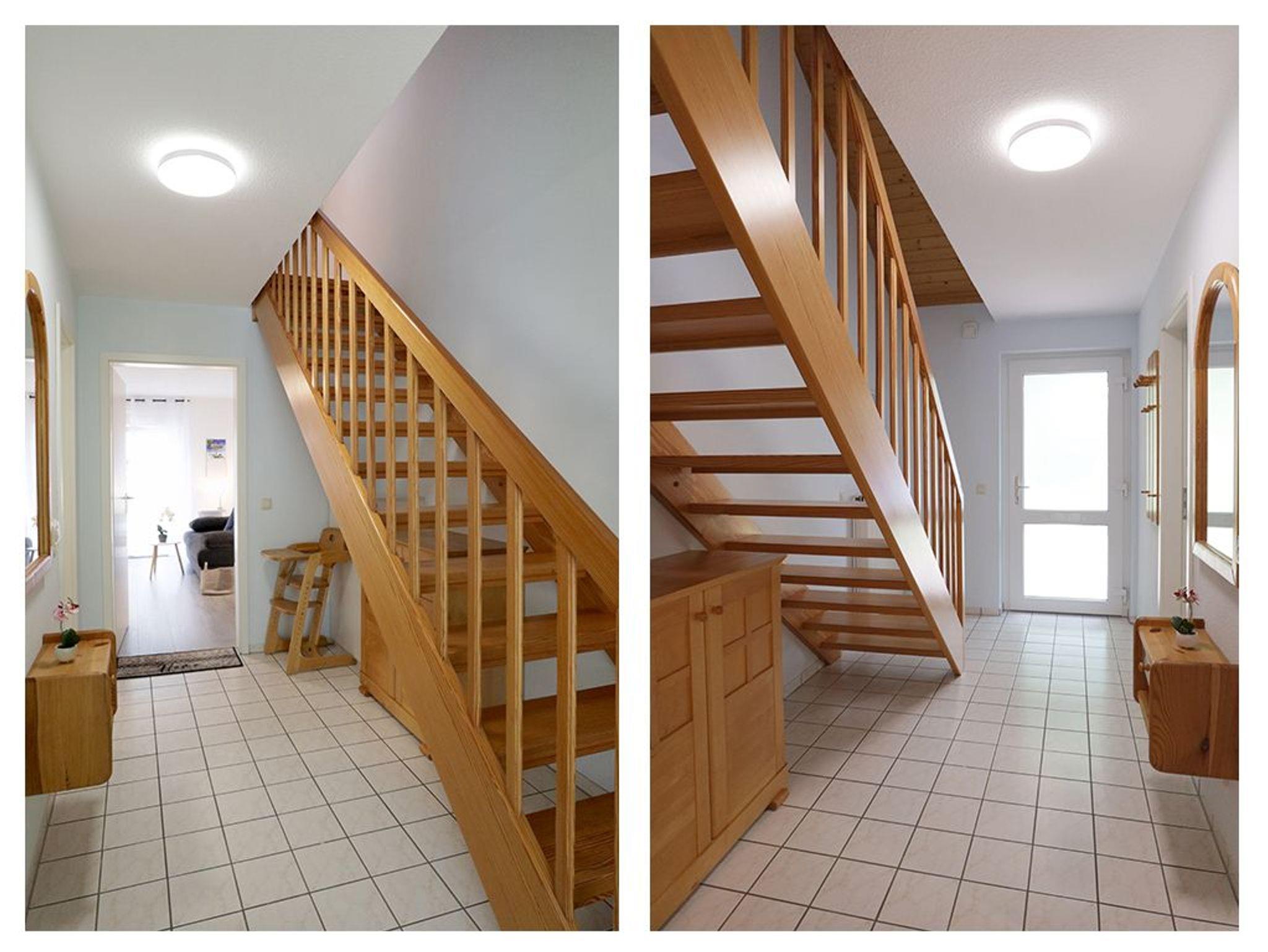 Zudem ist im Wohnbereich eine voll ausgestattete Wohnküche vorhanden, welche mit Herd, Backofen, Mikrowelle, Kühlschrank mit Gefrierfach, Spülmaschine sowie Kaffeemaschine, Wasserkocher und Toaster ausgestattet ist. Zudem befinden sich auf dieser Wohnebene ein separates Schlafzimmer mit zwei Einzelbetten, Kleiderschrank sowie ein Badezimmer mit Dusche, Waschbecken, WC. Ein Gäste-WC mit Waschtisch befindet sich im Obergeschoss. Gerne könne Sie die vorhandene Waschmaschine kostenfrei nutzen. Über eine Treppe gelangen Sie in den oberen Bereich des Hauses, wo sich das zweite Schlafzimmer mit Doppelbett und Kleiderschrank befindet.