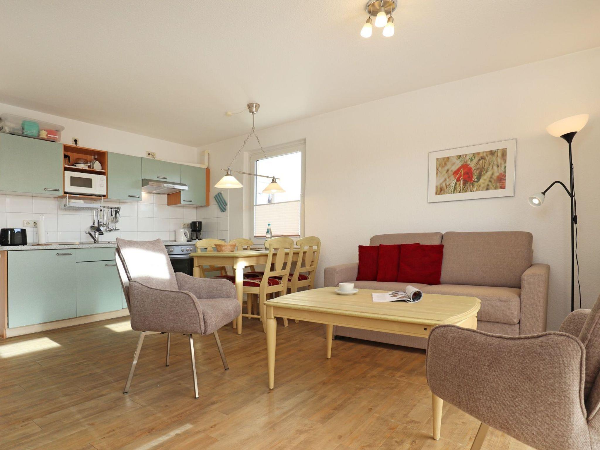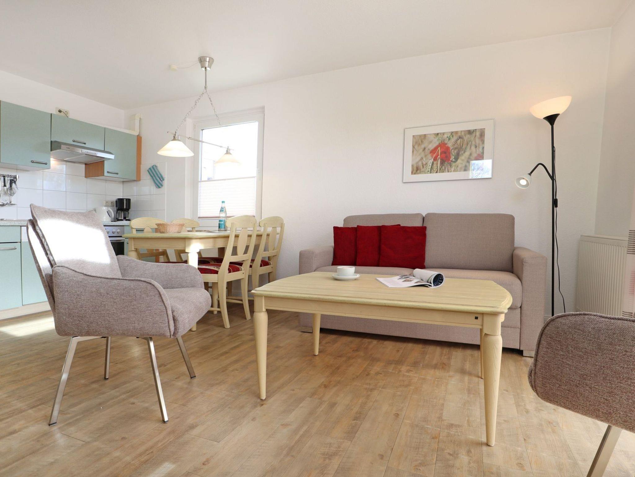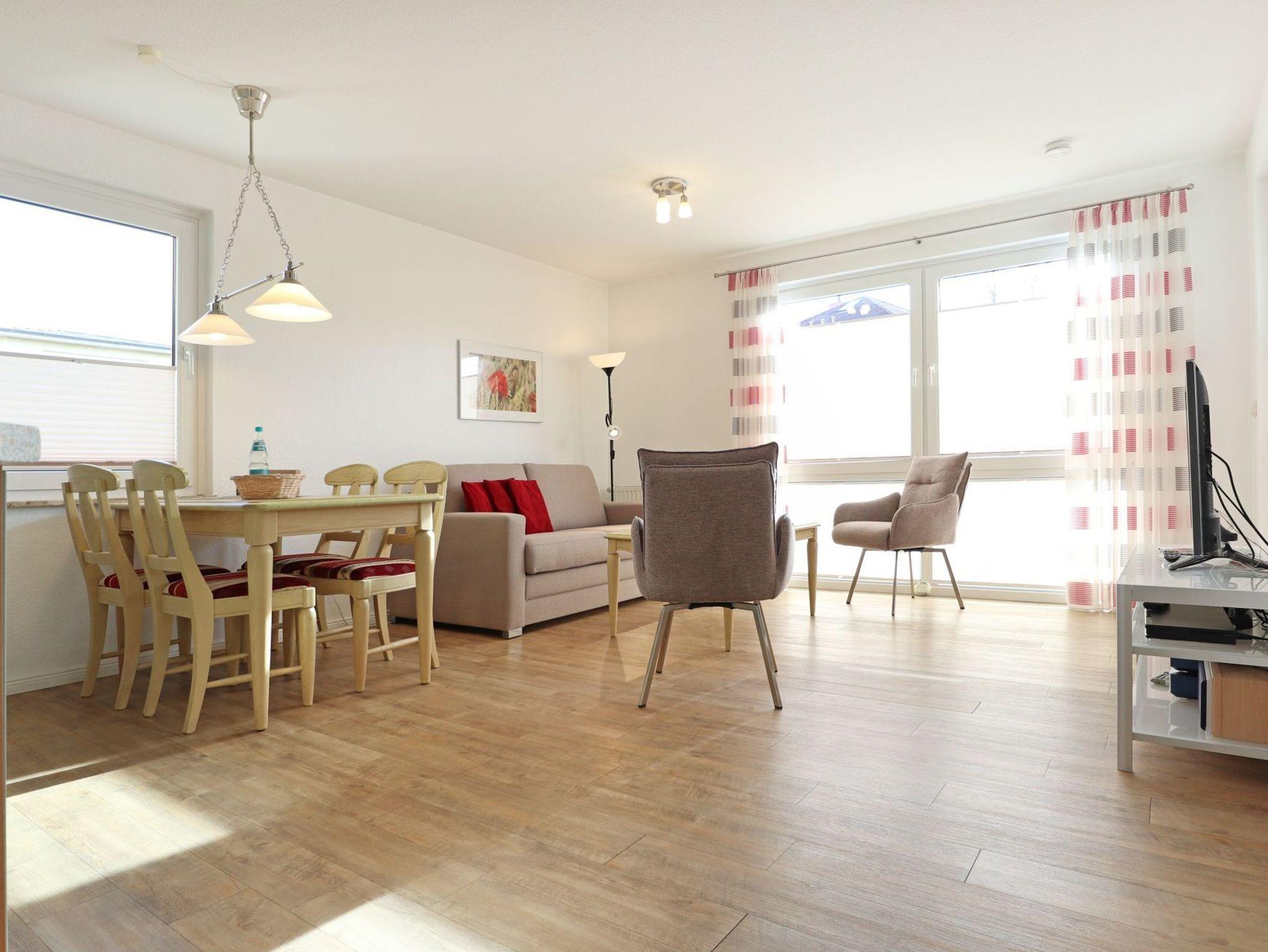 Das gut möblierte 3-Zimmer Apartment ?Godewind 19? mit Balkon in Süd-/Ost Richtung, befindet sich in der 1.Etage und empfängt Sie mit einer Wohnfläche von 52qm. Das mit bis zu 4 Personen belegbare, familienfreundliche Ferienobjekt bietet kostenfreies WLAN sowie die kostenfreie Nutzung eines Bollerwagens für unsere kleinsten Urlauber. Der großzügige Wohn-/Essbereich ist ausgestattet mit einem Sofa, zwei Sesseln, Flachbild- Fernsehgerät, DVD-Player, Musikanlage. Ihre Mahlzeiten können Sie an einem großen Esstisch einnehmen. In den Wohnbereich ist eine offene und gut ausgestattete Küchenzeile integriert, die über Ceranfeld-Herd, Backofen, Dunstabzug, Geschirrspüler, Mikrowelle, Kaffeemaschine, Toaster, Wasserkocher u.v.m. verfügt. Die Ferienwohnung hat zwei separate Schlafzimmer davon 1x Doppelbett, Kleiderschrank, Fernseher und 1x mit Etagenbett, Kleiderschrank. In dem hell gefliesten Duschbad befindet sich zudem ein Fön. Neben dem Wohnhaus ist ein Unterstellschuppen für mitgebrachte Fahrräder, wo auch ein Bollerwagen untergebracht ist. Ihren PKW parken Sie ebenfalls kostenfrei vor dem Haus. Das Apartment ist eine Nichtraucherwohnung, in der Haustiere nicht gestattet sind. Nur 180 Meter benötigen Sie zum Ostseestrand. Einkaufsmöglichkeiten sind in naher Umgebung. Auf Wunsch Brötchenlieferservice bis an die Haustür.
