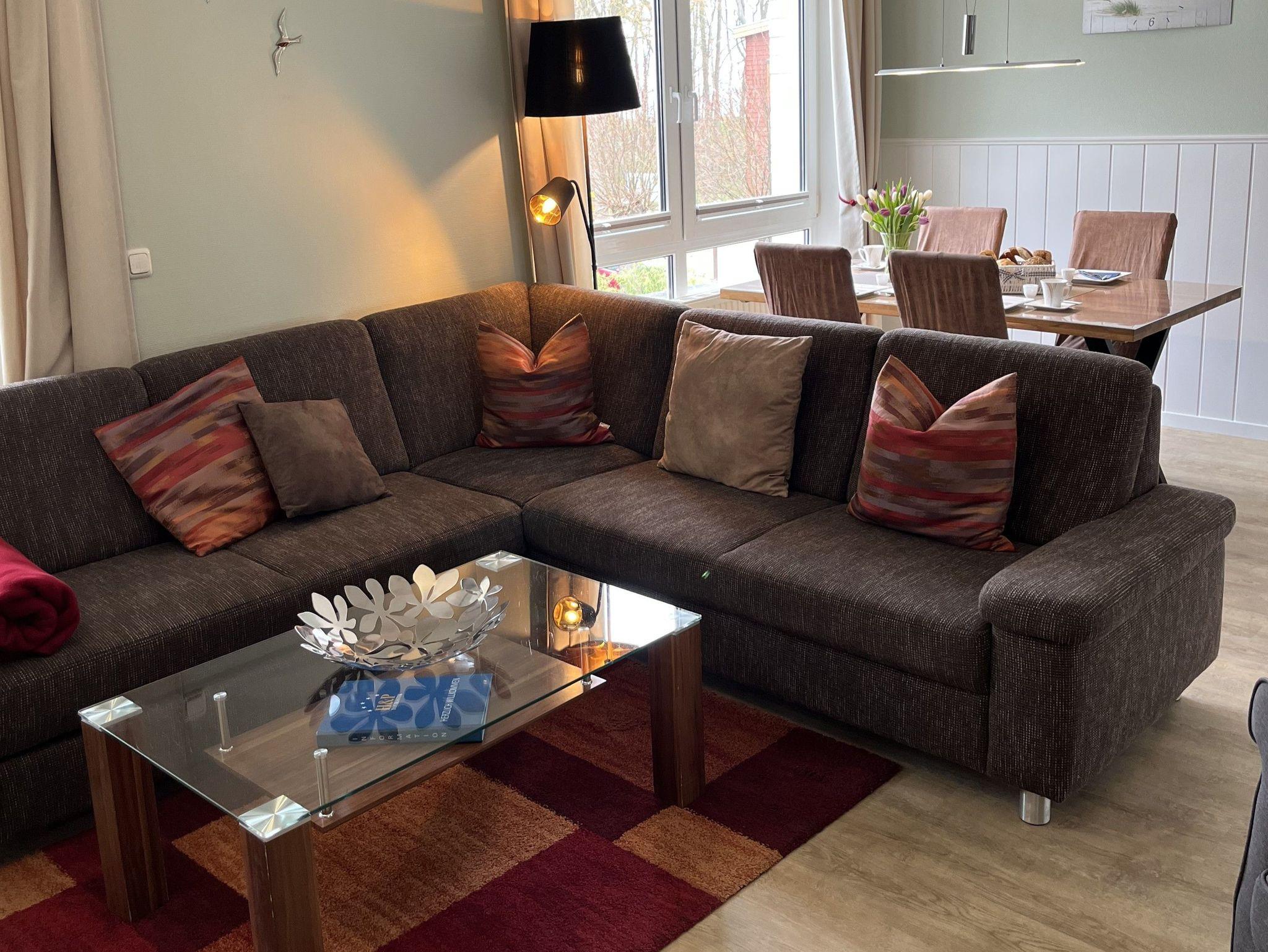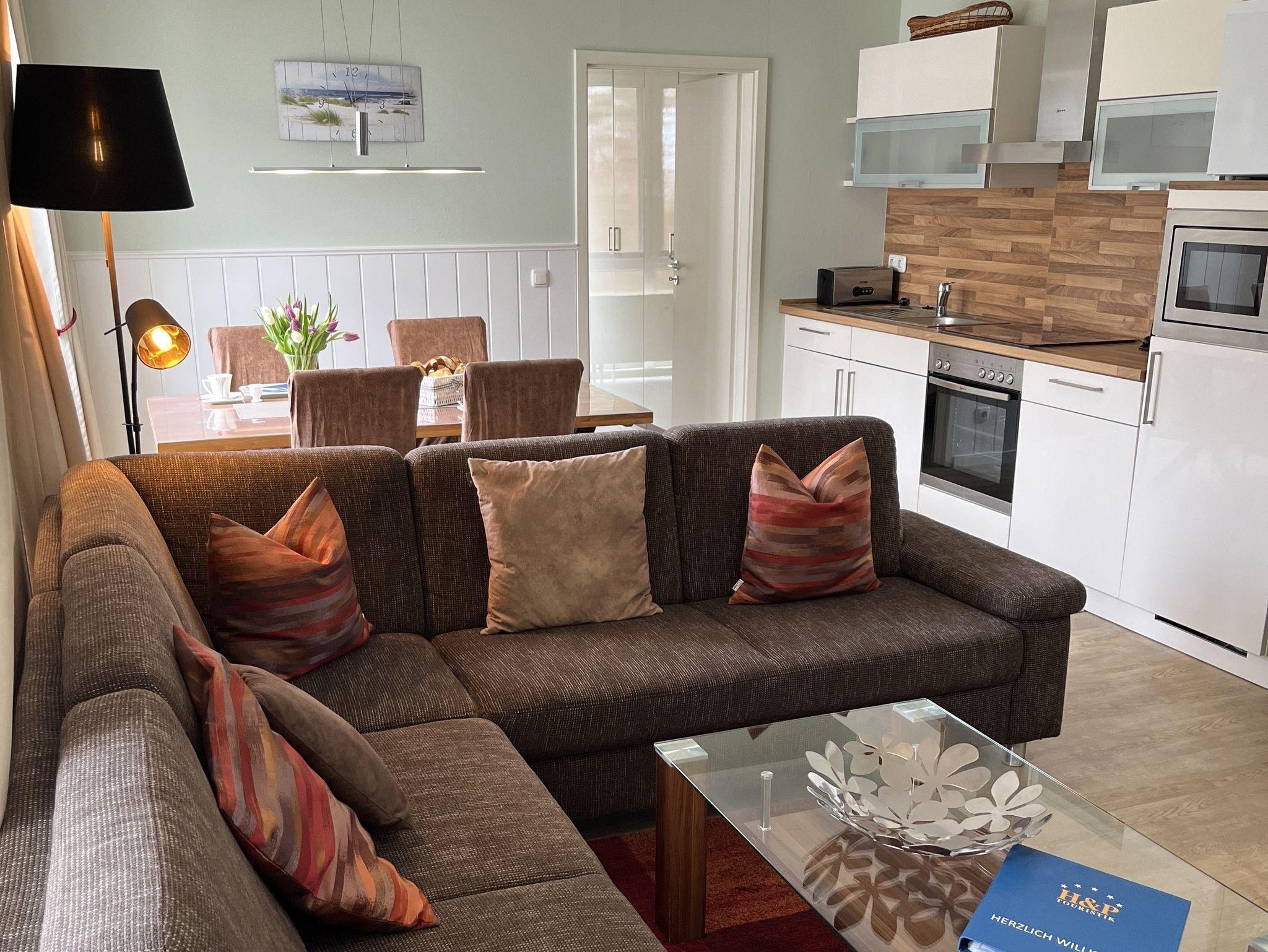 Im Wohn-/Essbereich finden Sie eine moderne Schrankwand mit LCD-TV, DVD Player und Spielekonsole. Die gemütliche Eckcouch lädt nicht nur zum Sitzen und Verweilen, sondern bei Bedarf auch zum Schlafen ein. Die hochwertige Nolte Einbauküche mit Geschirrspüler, Mikrowelle, Cerankochfeld und Backofen sowie ein geschmackvoller Esstisch runden das Gesamtbild ab.