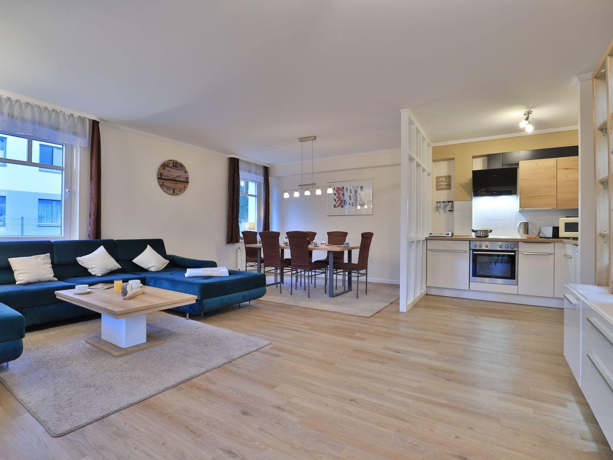 Die 2-Zimmer-Wohnung im Erdgeschoss bietet eine geschützte Terrasse mit Blick auf das begrünte Innengelände und eine großzügige Wohnfläche von 64 Quadratmetern, die Platz für bis zu 4 Personen bietet. Der elegante Wohn- und Essbereich verfügt über ein Sofa, das sich in ein Schlafsofa verwandeln lässt, sowie einen Esstisch und einen Fernseher. WLAN ist kostenfrei verfügbar. Die separate, voll ausgestattete Küche ermöglicht es Ihnen, Ihre Mahlzeiten selbst zuzubereiten und bietet einen Ceranherd mit Backofen, eine Mikrowelle, einen Kühlschrank, einen Geschirrspüler sowie eine Kaffeemaschine, einen Toaster und einen Wasserkocher. Im Sommer können Sie die saisonal möblierte Terrasse genießen. Das Schlafzimmer ist mit einem Doppelbett und einem Kleiderschrank ausgestattet. Für Familien stehen ein Kinderhochstuhl und ein Kinderreisebett zur Verfügung, wobei eigenes Bettzeug für Kleinkinder mitgebracht werden muss. Die Wohnung verfügt zudem über ein Duschbad mit WC, Fön ist vorhanden. Bügeleisen, Bügelbrett befinden sich in der Wohnung. Eine Waschmaschine kann im Haus genutzt werden, und Ihr Fahrzeug parken Sie auf einem reservierten Stellplatz in der Tiefgarage. Bitte beachten Sie, dass Haustiere nicht erlaubt sind und es sich um eine Nichtraucherwohnung handelt. Die zentrale Lage, nur 70 Meter vom feinsandigen Strand entfernt, macht die Wohnung ideal für einen entspannenden Urlaub in Boltenhagen.