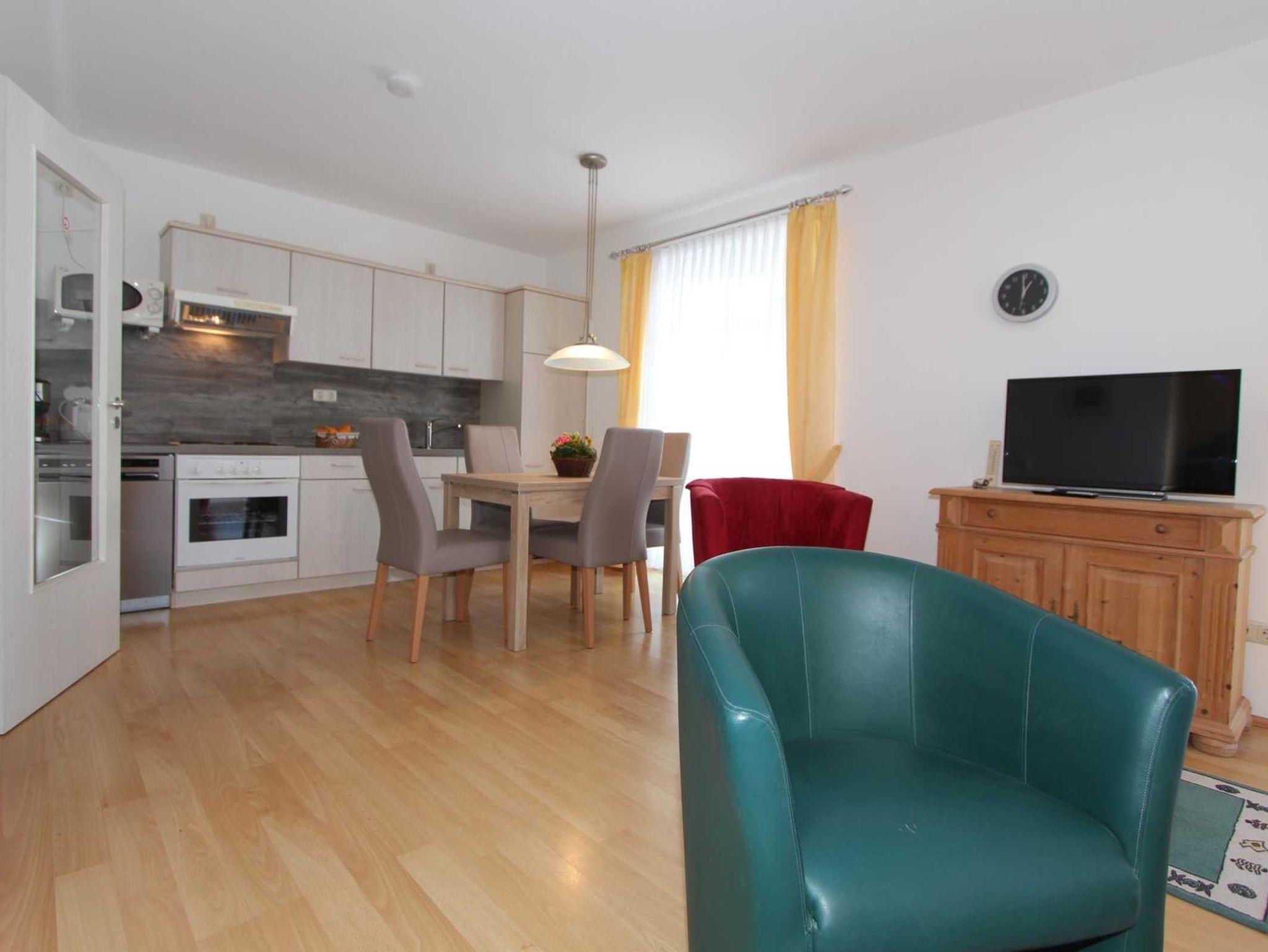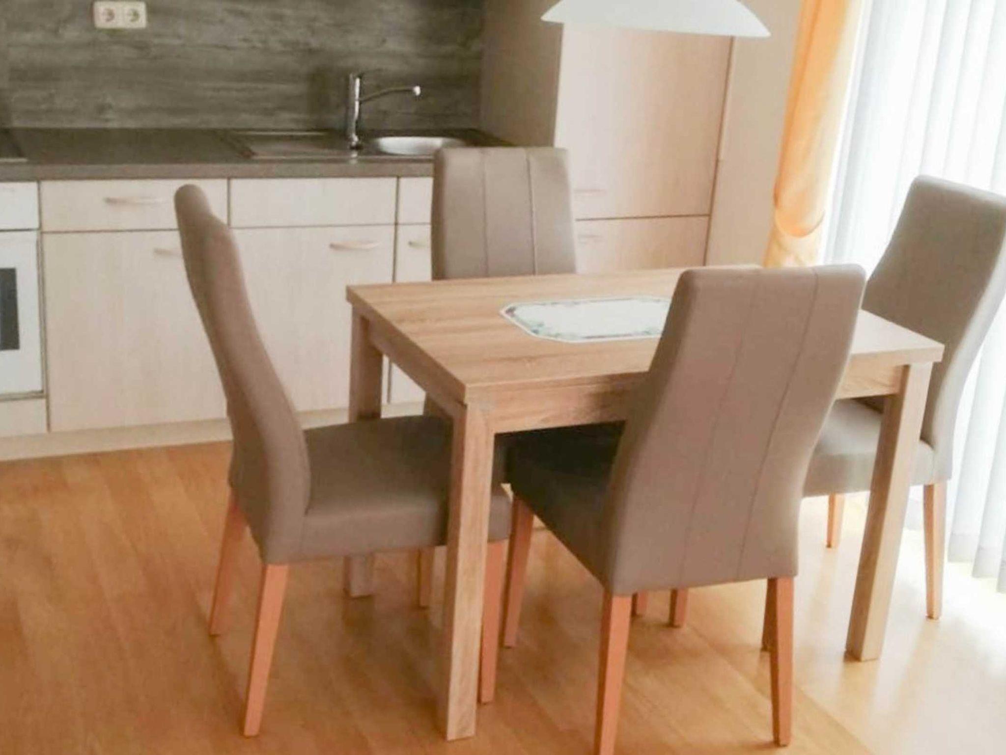 Der gemütliche Wohnraum ist ausgestattet mit einer bequemen Sitzgarnitur, einem Esstisch für vier Personen sowie einer Küchenzeile mit Mikrowelle, Backofen und Geschirrspülmaschine. Auf dem großen, doppelseitigen Balkon können Sie den Tag gemütlich bei einem Glas Wein ausklingen lassen. Ein Tisch mit vier Stühlen ist hier vorhanden.