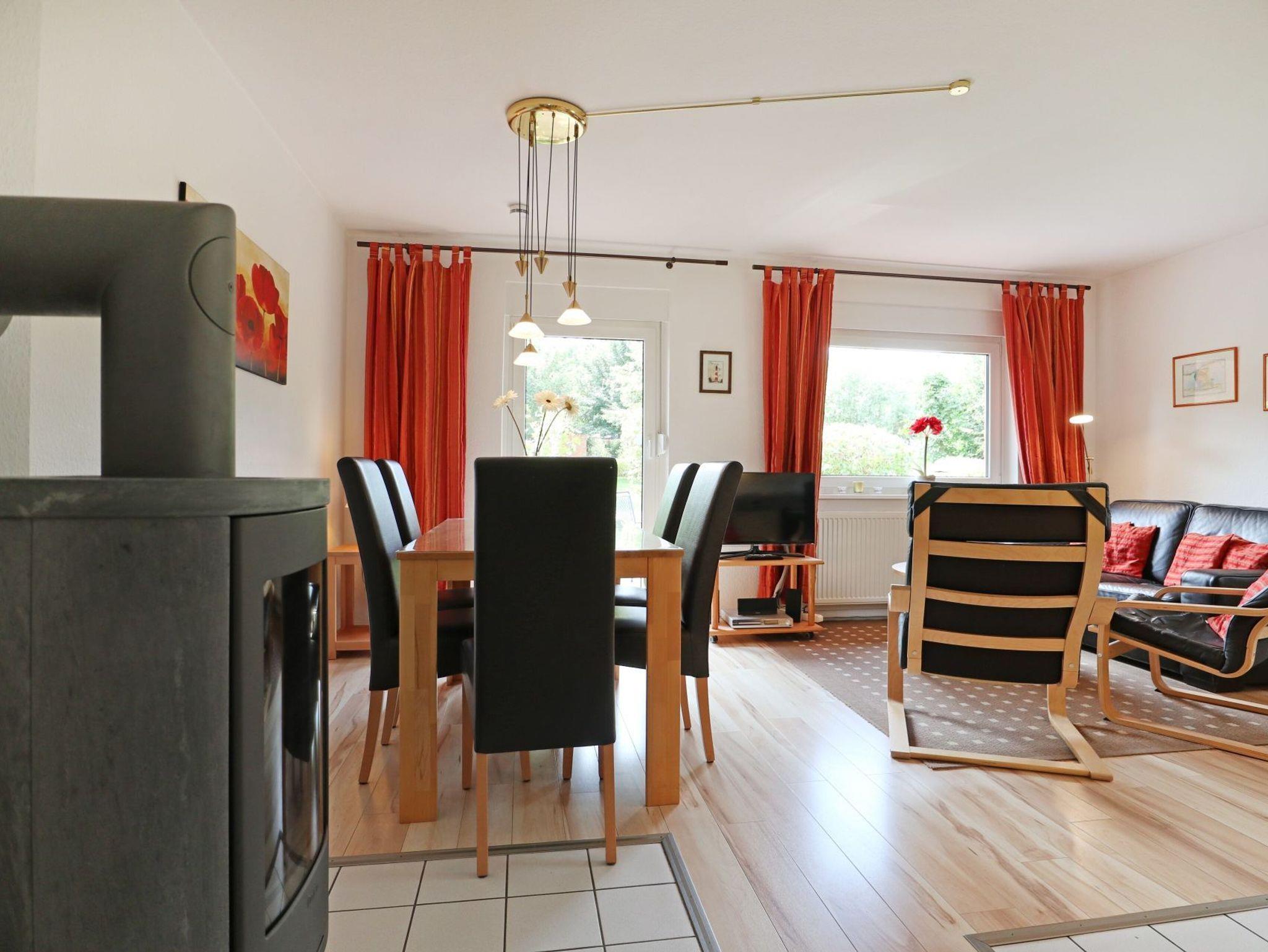 Es begrüßt Sie mit einer Wohnfläche von 62qm das behaglich eingerichtete 3-Zimmer-Ferienhaus im Urlauberdorf 52b. Eine Belegung ist mit bis zu fünf Personen möglich. In dem gemütlich eingerichteten Wohn-/Essbereich mit Sitzgarnitur, Esstisch, Kaminofen sowie Fernseher und Musikanlage ist auch eine offene Küchenzeile integriert. Hier befinden sich Herd, Backofen, Mikrowelle, Kühlschrank, Toaster, Wasserkocher, Kaffeemaschine usw. Somit bietet das schöne Ferienhaus auch ideale Bedingungen für Selbstversorger. Den Internetzugang über WLAN können Sie gebührenfrei nutzen. Zudem ermöglicht Ihnen im Erdgeschoss ein separates Schlafzimmer mit Doppelbett und Kleiderschrank entspannte Nächte. Auch ein Tageslicht Duschbad mit Waschmaschinen Nutzung befindet sich im Erdgeschoss des Hauses. Über eine Treppe gelangen Sie in das Obergeschoss, wo sich ein weiteres Schlafzimmer mit zwei Einzelbetten, Kleiderschrank, Fernseher und einer weiteren Schlafmöglichkeit befinden.