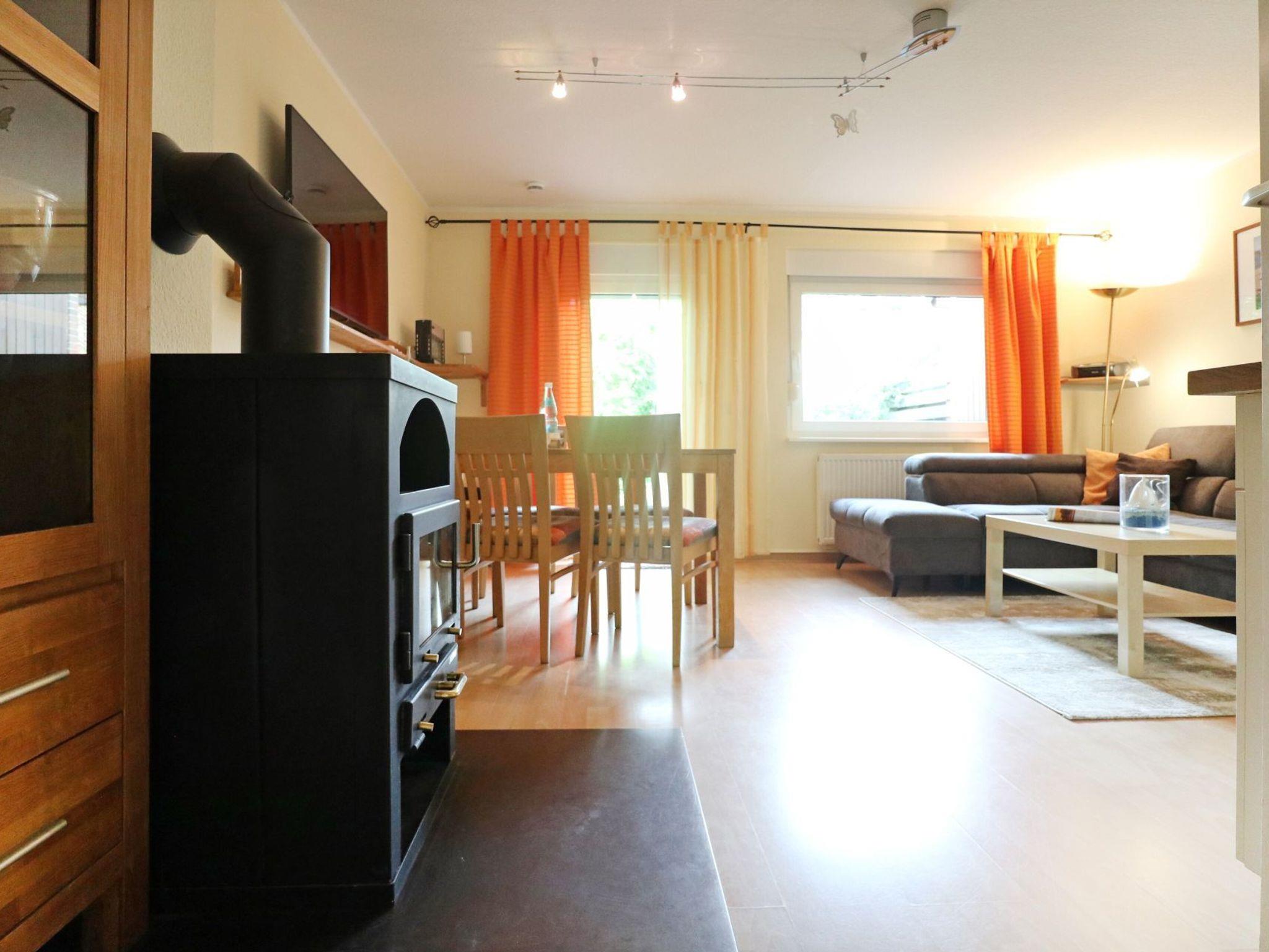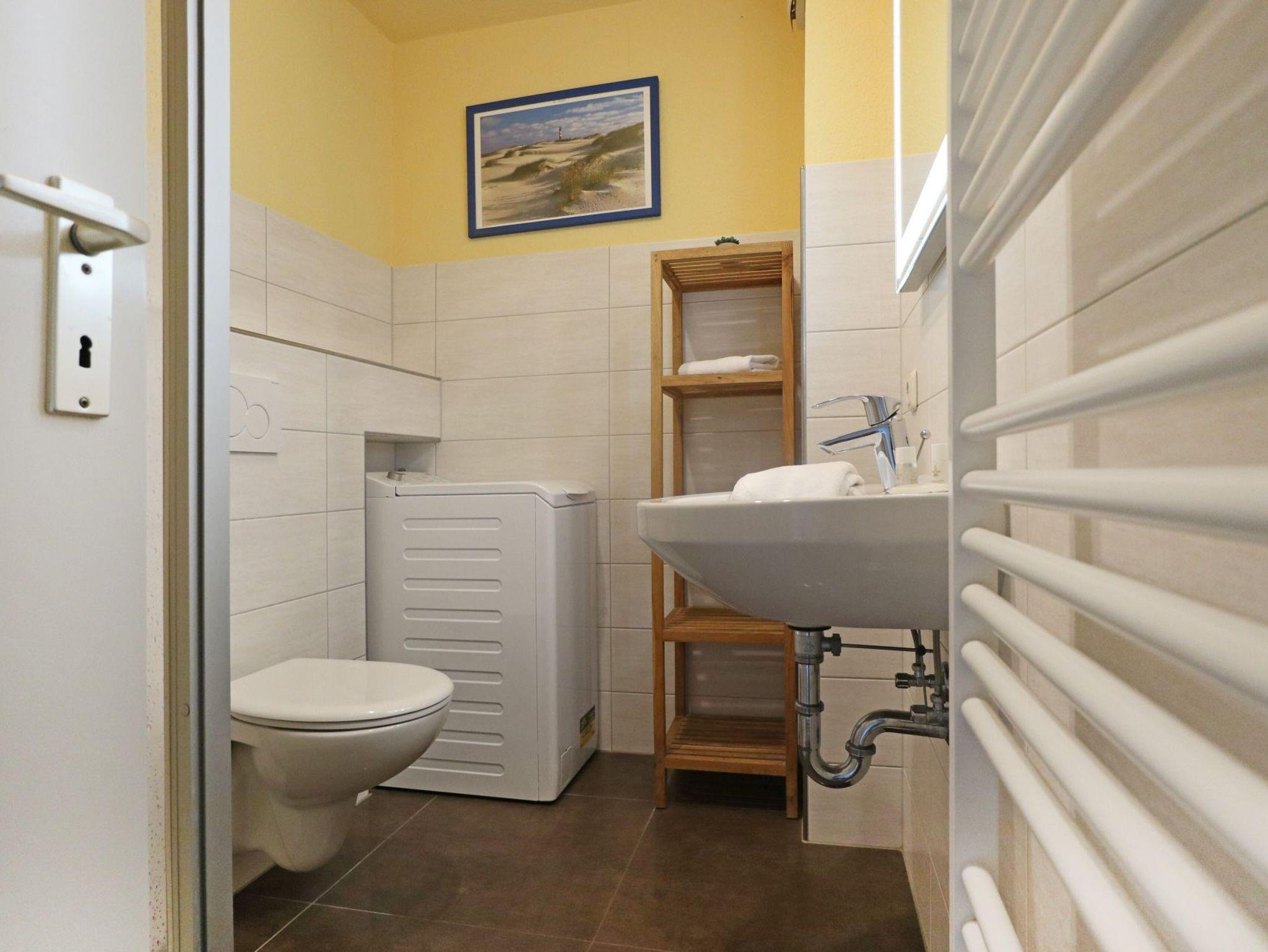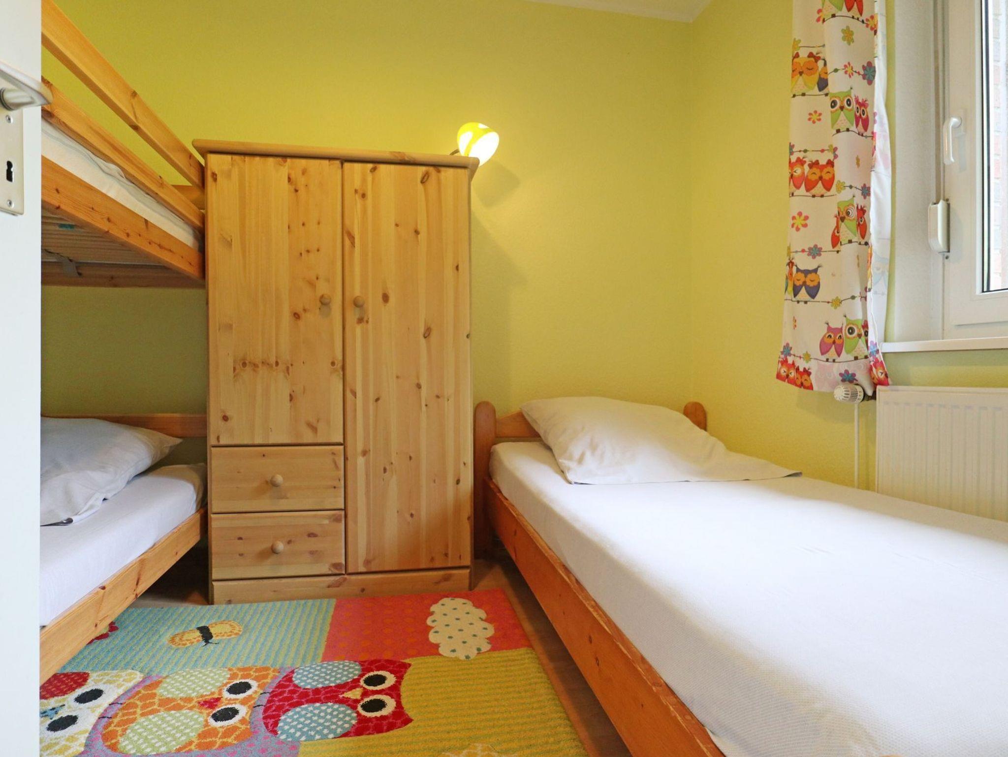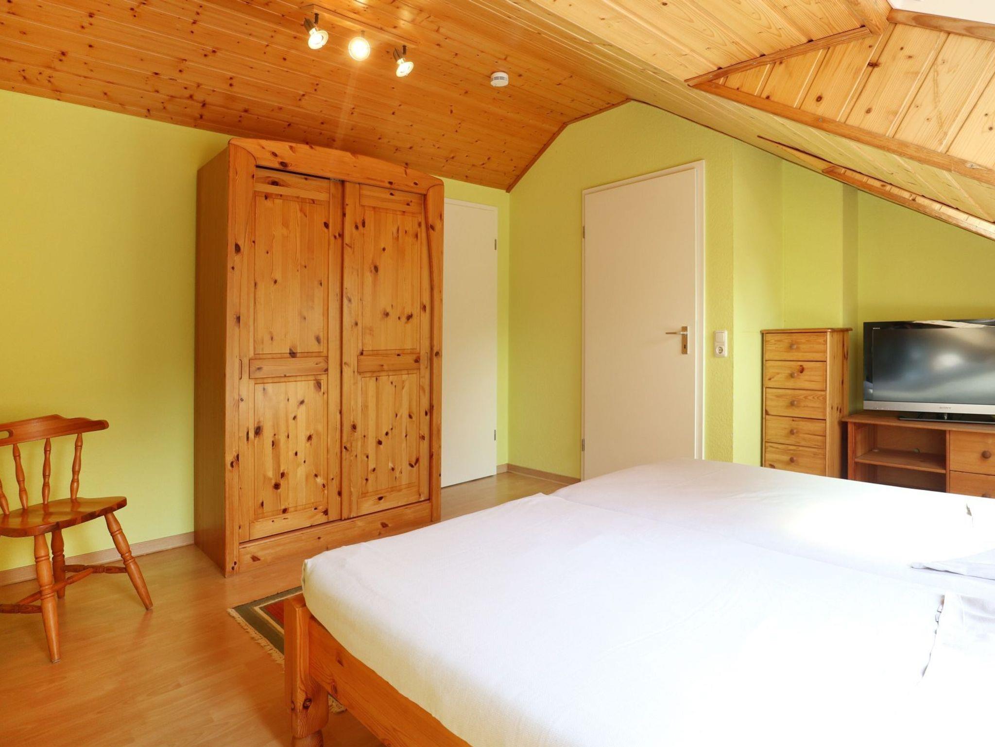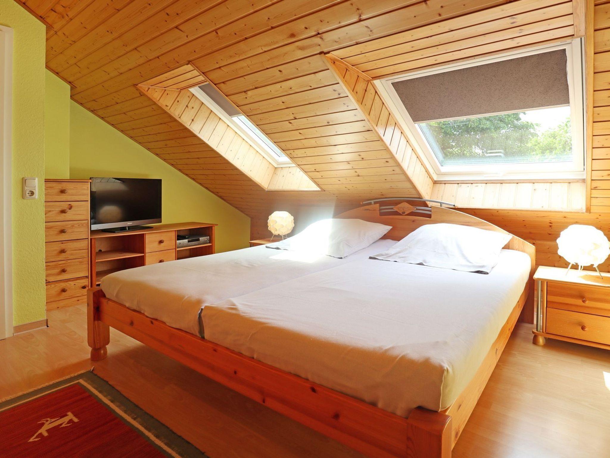 Auch ein Duschbad mit Waschmaschine ist auf dieser Etage. Über eine Treppe gelangen Sie in das Obergeschoss des Hauses, wo Sie ein weiteres Schlafzimmer mit Doppelbett, Kleiderschrank sowie einen zweiten Fernseher vorfinden. Hervorzuheben ist, dass sich im Obergeschoss auch ein Gäste-WC befindet. Die familienfreundliche Ausstattung umfasst einen Bollerwagen sowie einen Kinderhochstuhl. Das Untergeschoss lässt sich über Rollläden verdunkeln. Das obere Wohngeschoss wird über Rollos abgedunkelt. Ihr Fahrzeug können Sie auf einem reservierte Außenstellplatz am Haus parken. Bitte beachten Sie, dass in dem Nichtraucherhaus keine Haustiere gestattet sind. Sie wohnen von Natur umgeben in einem verkehrsberuhigten Urlaubergebiet.