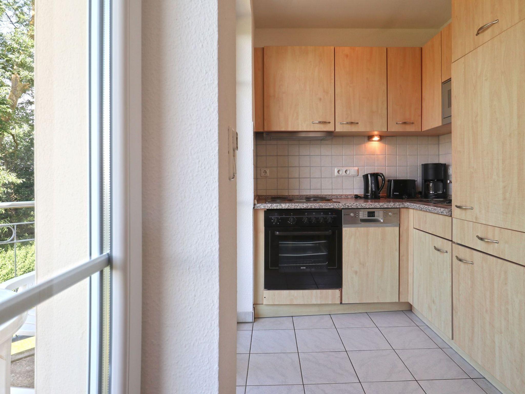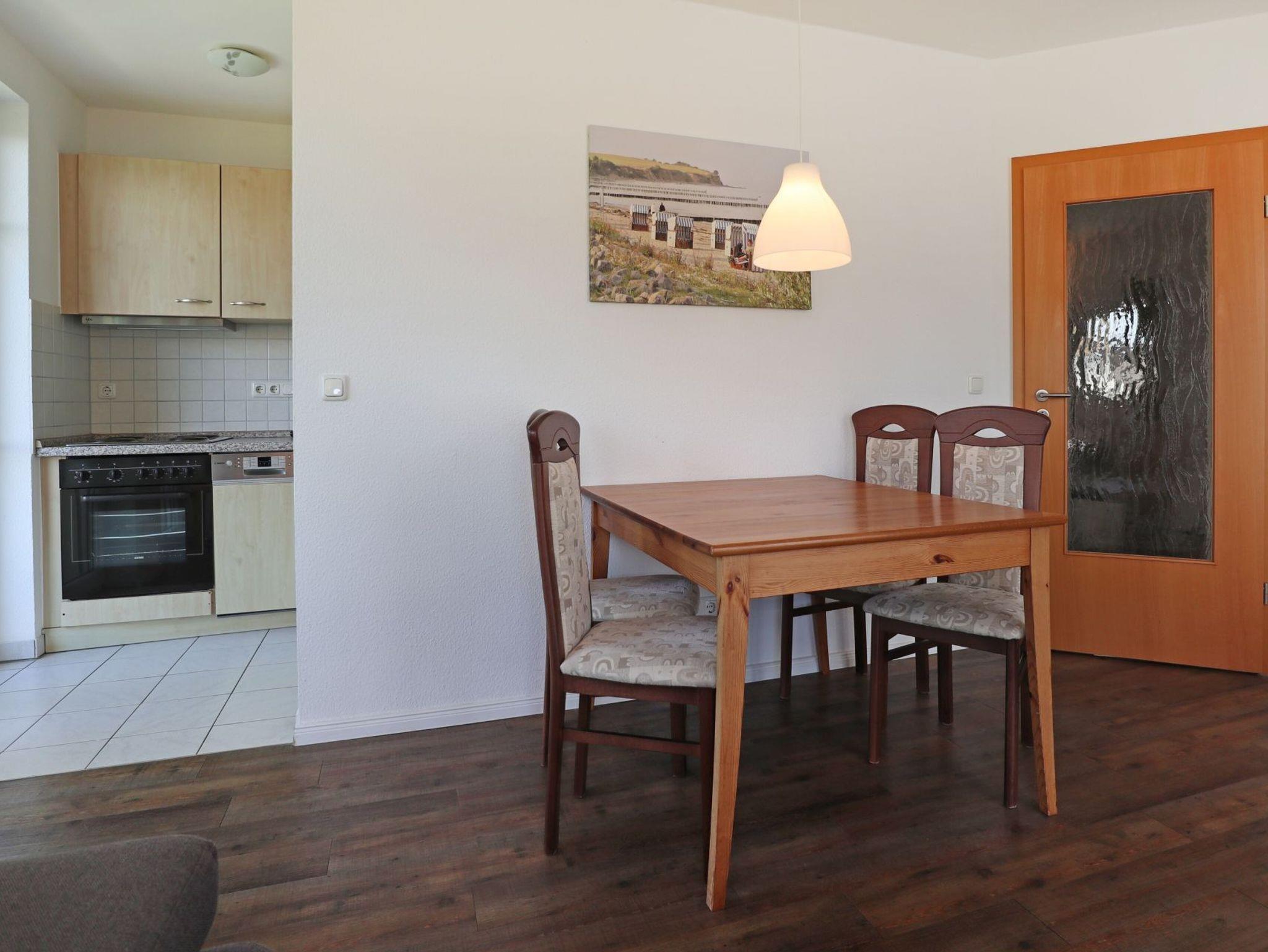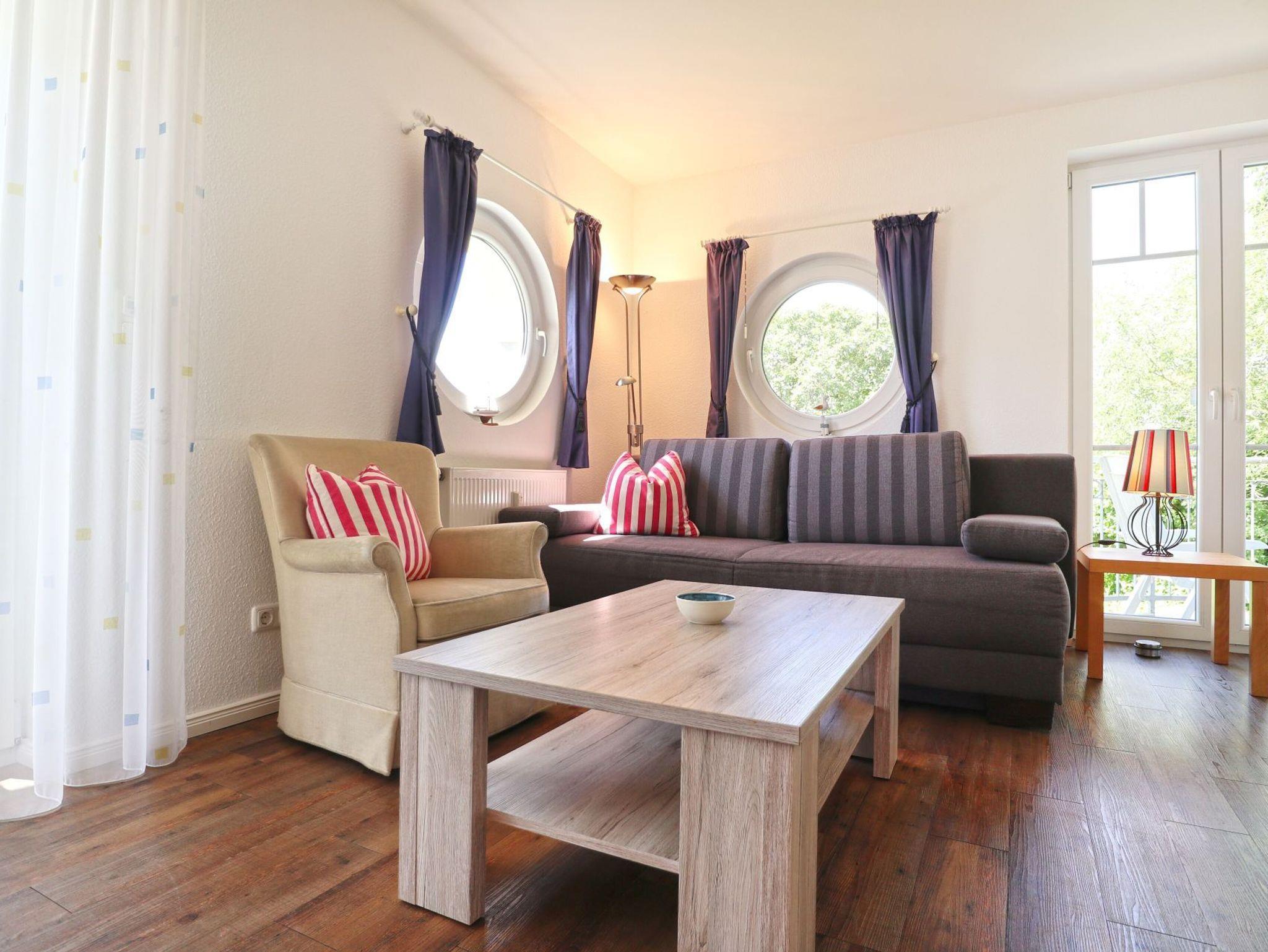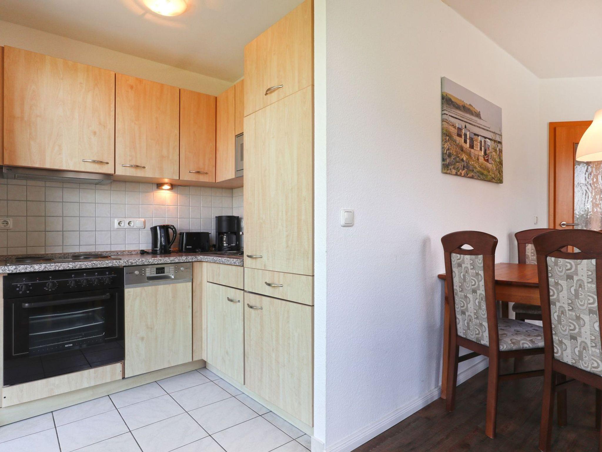Die komfortabel möblierte 2-Zimmer Ferienwohnung verfügt über eine Wohnfläche von 48qm und ist bestens geeignet für einen Aufenthalt mit bis zu 3 Personen. Das Appartement befindet sich im 1. Obergeschoss des ruhigen Mehrfamilienhauses und ist mit dem Fahrstuhl bequem erreichbar. Insbesondere ist hervorzuheben, dass die geschmackvolle Wohnung ihre Gäste mit 2 Balkonen verwöhnt. Im gemütlich eingerichteten Wohn-/Essbereich befinden sich eine ausziehbare Schlafcouch, ein großzügiger Esstisch sowie ein Fernsehgerät, DVD-Player und eine Musikanlage. Eine offene Küche ist integriert und gut ausgestattet mit Herd, Backofen, Mikrowelle, Kühlschrank mit Gefrierfach sowie Wasserkocher, Geschirrspüler, Toaster und Kaffeemaschine. Entspannte Nächte verbringen Sie in einem separaten Schlafzimmer mit Doppelbett und Kleiderschrank. Zugehörig ist ein innenliegendes Badezimmer mit Duschkabine, Waschtisch und WC. Die gesamte Wohneinheit kann über Rollläden verdunkelt werden. Ihren PKW parken Sie in der hauseigenen Tiefgarage auf dem für Sie reservierten Stellplatz. Für mitgebrachte Fahrräder bietet ein Fahrradabstellraum in begrenzter Anzahl Unterstellmöglichkeiten. In der Nichtraucherwohnung sind Hunde willkommen. Den etwas steinigen Sandstrand nah zur Steilküste erreichen Sie in ca. 250 Meter. Strandkorbvermietung ist saisonabhängig gegeben. Zum Ortszentrum gelangen Sie in ca. 15 Gehminuten.