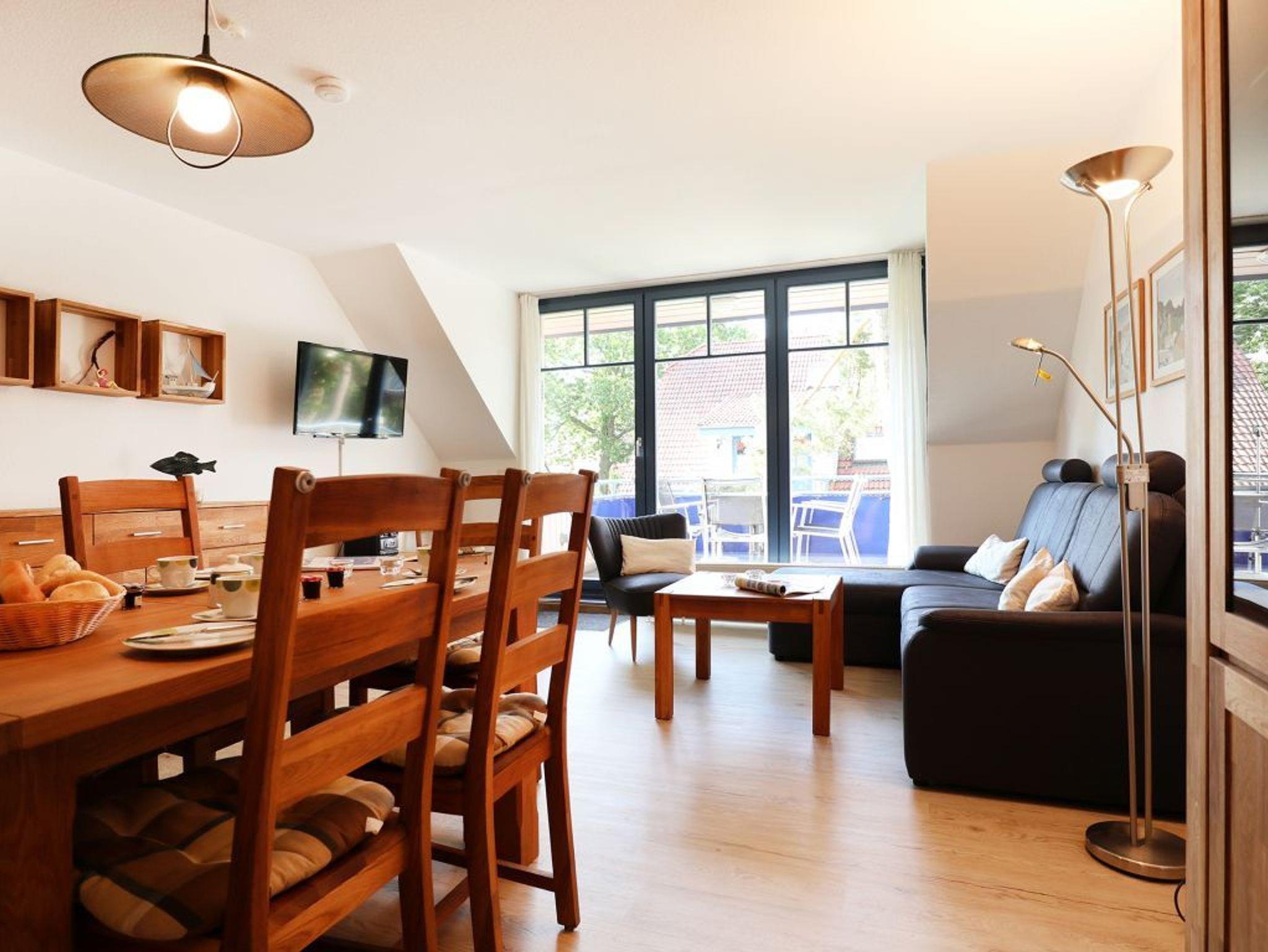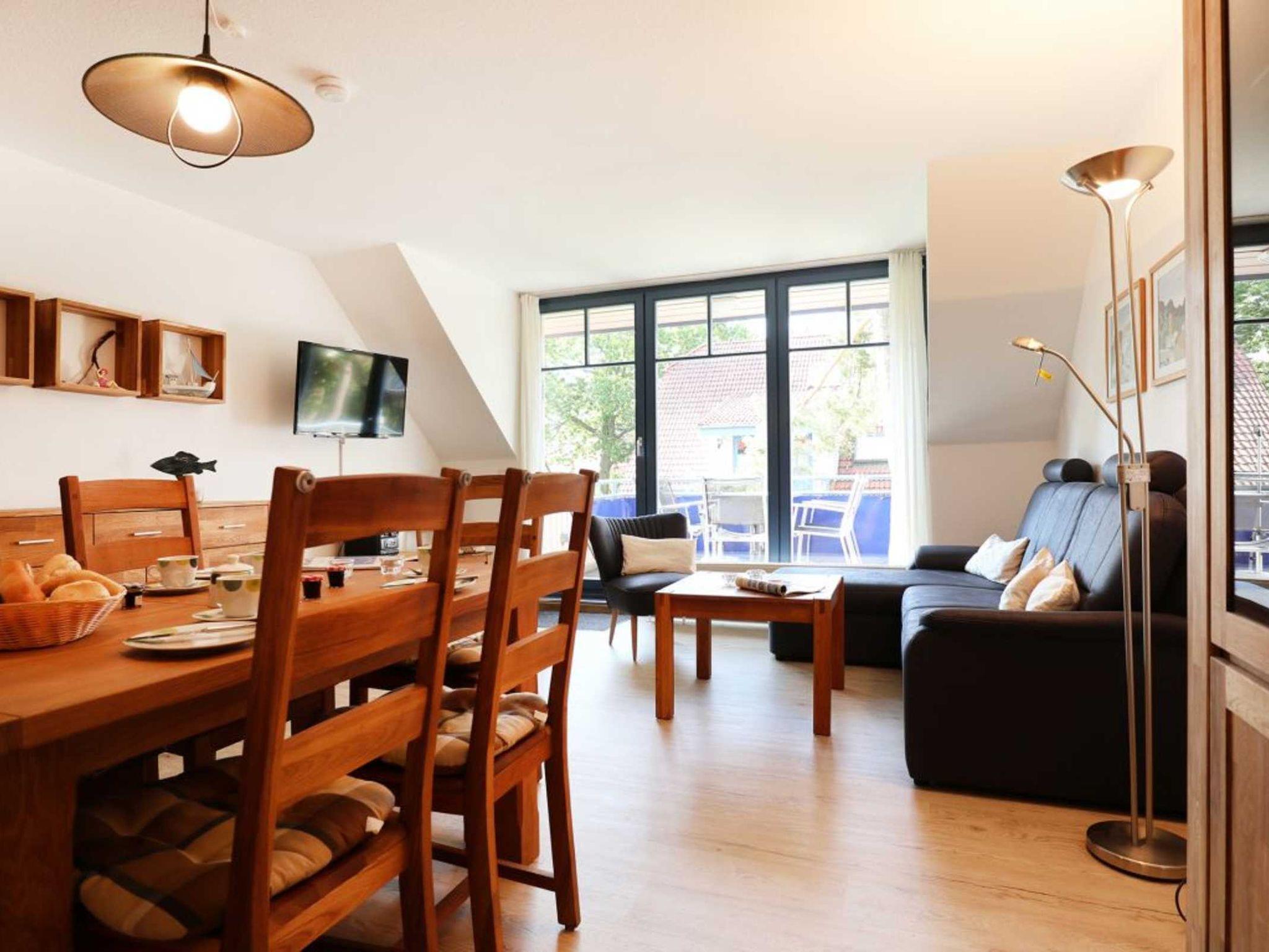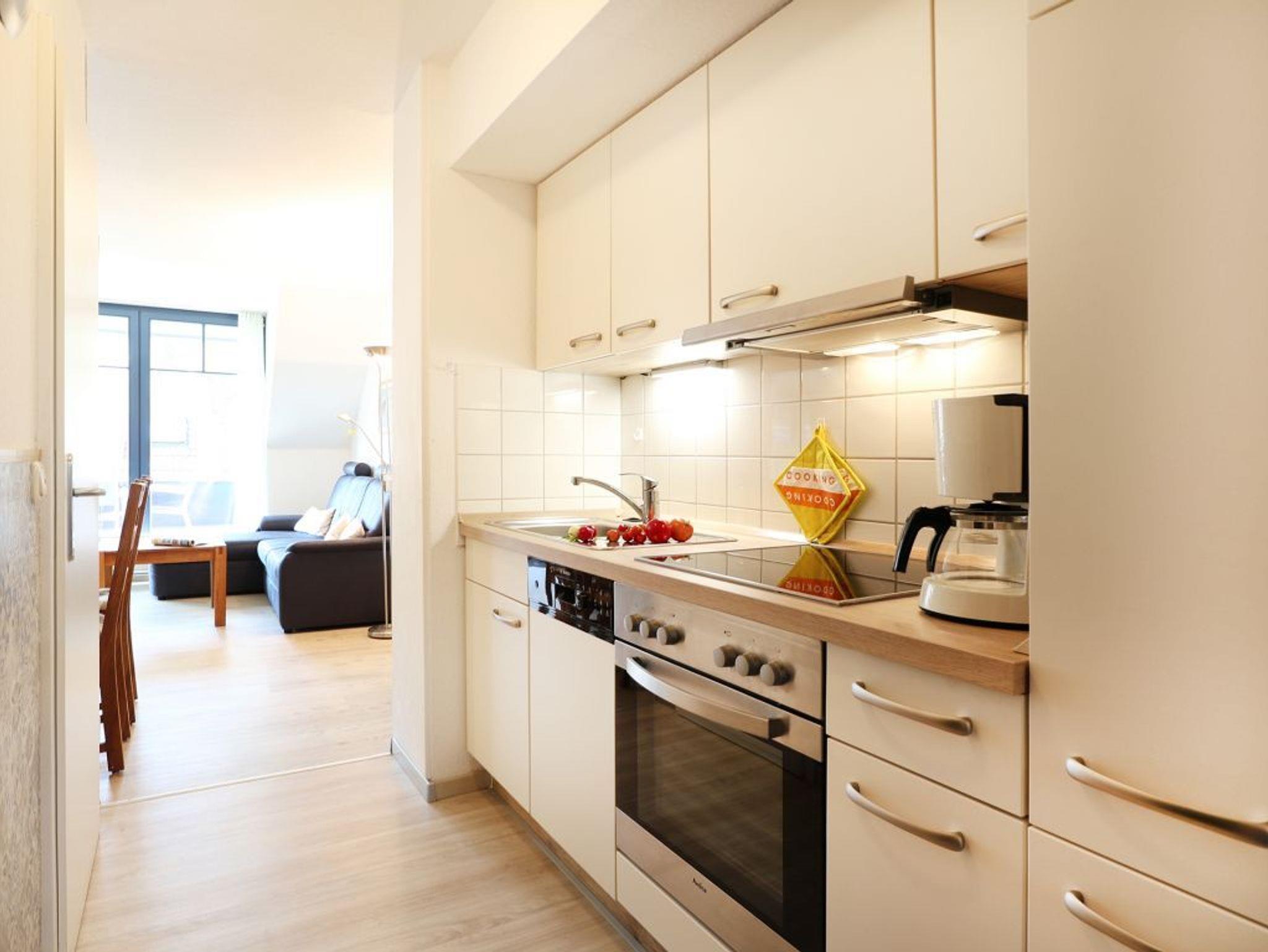 Die 4- Zimmer Maisonetten Ferienwohnung Papillon 12-7 ist insgesamt sehr komfortabel ausgestattet. Auf einer Wohnfläche von 67qm können Sie mit bis zu 6 Personen bequem wohnen. Der großzügige Wohn-/Essbereich ist mit einem Sofa sowie weiteren Sitzmöglichkeiten und einem großen Esstisch möbliert. Ein Fernsehgerät, Musikanlage und kostenfreie WLAN- Nutzung bieten Abwechslung. Vom Wohnbereich gelangt man auf den saisonal möblierten Süd- Ost Balkon. In der Wohnküche stehen Ceranherd, Backofen, Geschirrspüler sowie Kühlschrank mit integr. Gefrierfach, Kaffeemaschine, Toaster und Wasserkocher bereit. Ihre Mahlzeiten können Sie am Esstisch zu sich nehmen. Zudem befindet sich auf dieser Wohnebene ein separates Schlafzimmer mit zwei Einzelbetten, und Kleiderschrank.