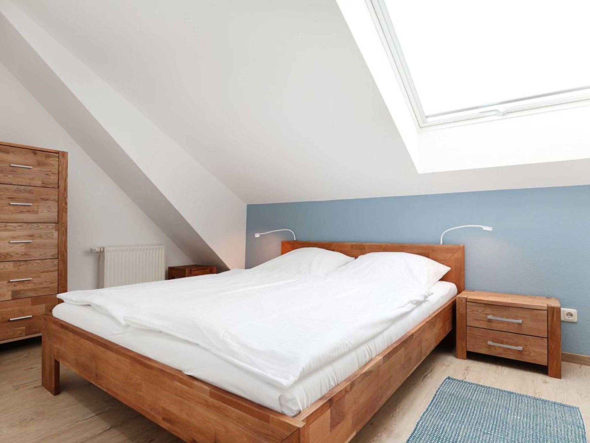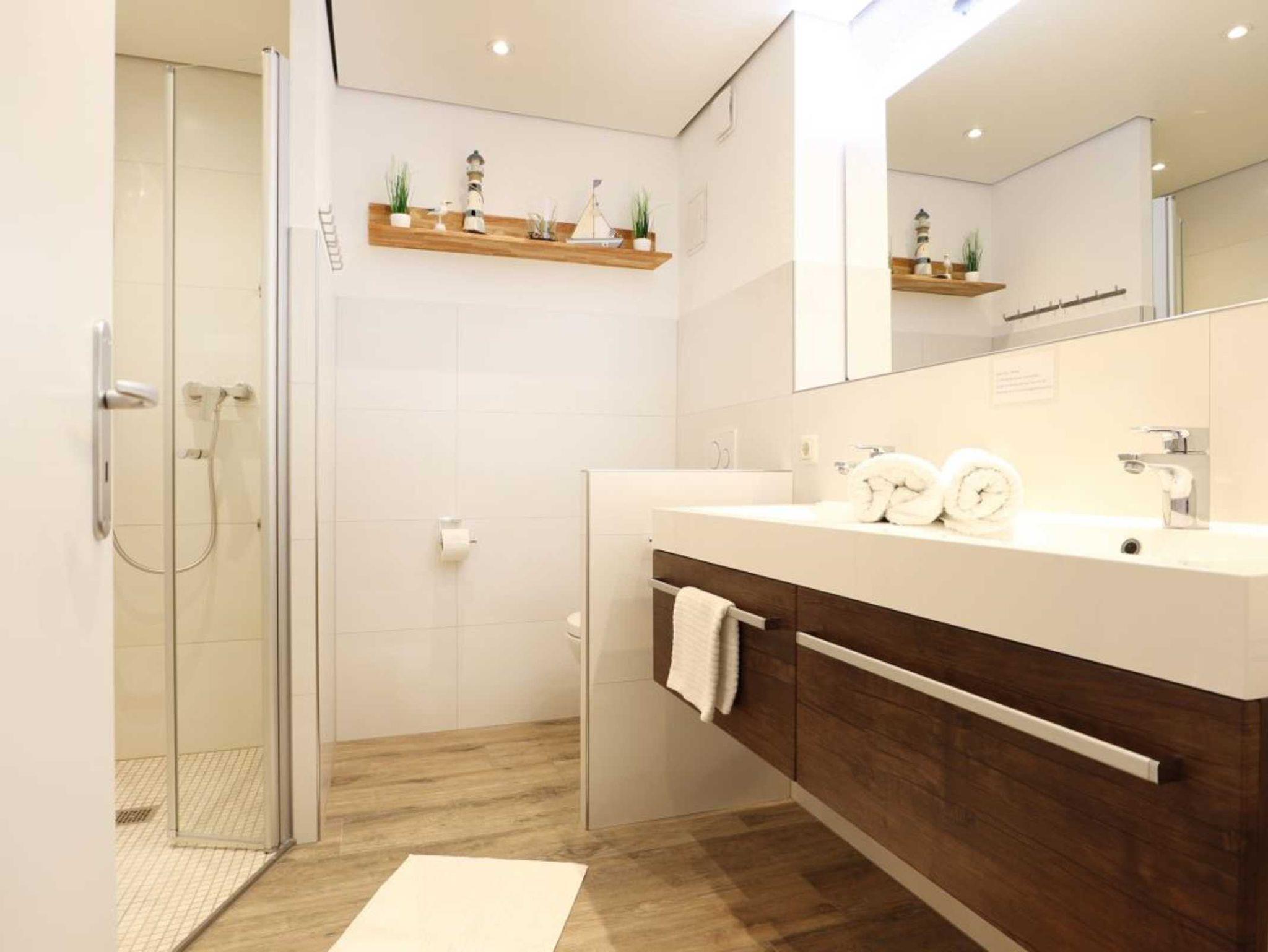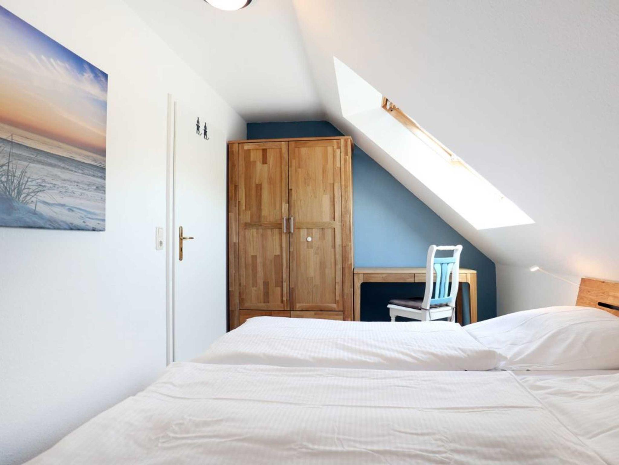 Das modernisierte Duschbad ist mit zwei Waschtischen und WC ausgestattet. Zusätzlich ist ein Gäste-WC in der Wohnung vorhanden. Über eine Treppe im Wohnbereich gelangen Sie in die obere Ebene mit zwei weiteren Schlafzimmern, welche jeweils mit einem Doppelbett, Kleiderschrank möbliert sind. Gegen Gebühr können Sie im Untergeschoß des Hauses Waschmaschine und Wäschetrockner nutzen. Ein Kinderhochstuhl befindet sich in der Wohnung. Ihren PKW parken Sie kostenfrei auf dem wohnungseigenen Außenstellplatz.
