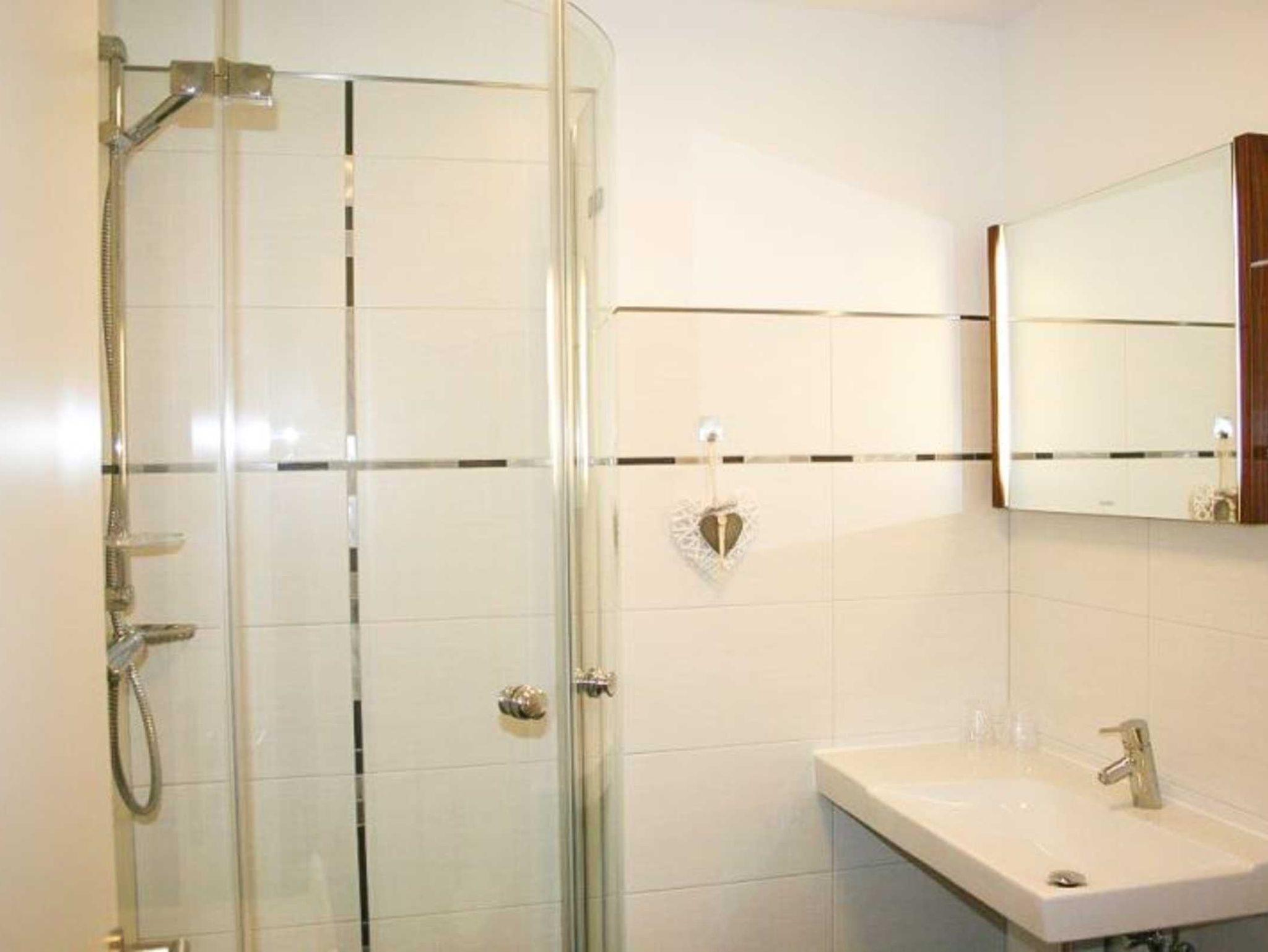 Auch das Badezimmer entspricht, mit einer fast ebenerdig begehbaren Dusche und einem Handtuchwärmer, gehobenen Ansprüchen.