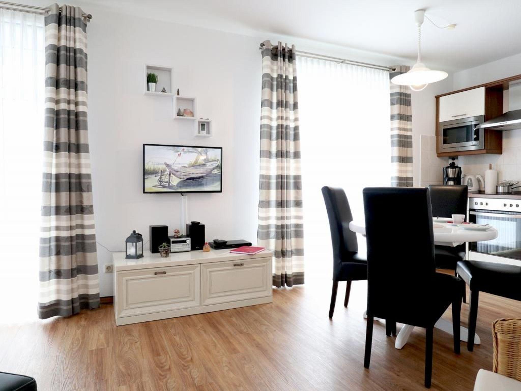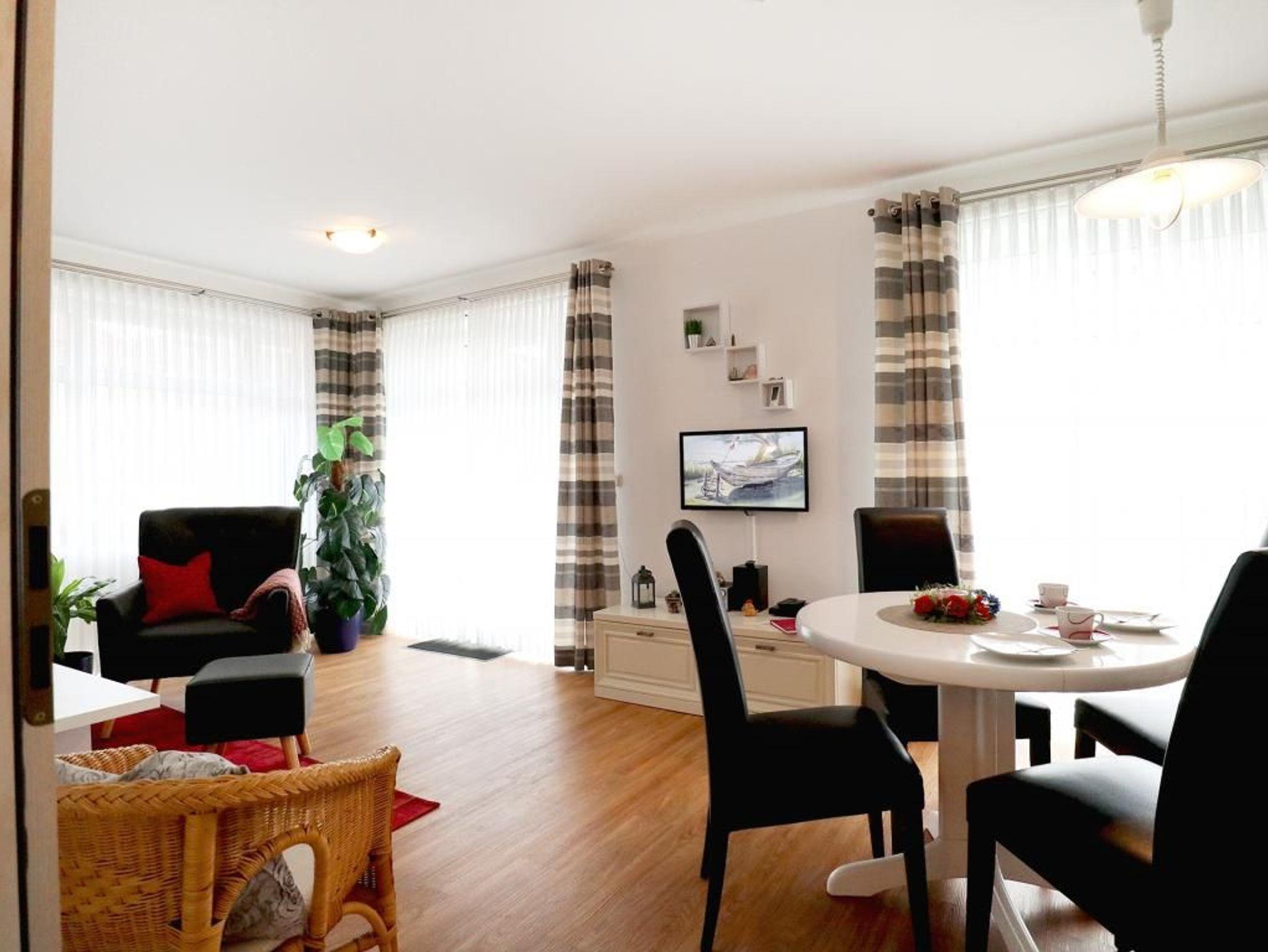 Das sehr geschmackvoll eingerichtete 2- Zimmer Ferienappartement Haffblick 18 befindet sich im Parterre des Hauses und bietet Ihnen eine Terrasse mit Strandkorb und seitlichem Wiesenblick. Die Wohnfläche beträgt 50qm und ist gut geeignet für einen entspannten Aufenthalt mit bis zu 4 Personen. Im gemütliche Wohn-Essbereich erwartet Sie eine ausziehbare Sofagarnitur, welche Ihnen zwei zusätzliche Schlafmöglichkeiten bieten kann. Für gemeinsame Mahlzeiten nutzen Sie einen großzügigen Esstisch. Zudem ist moderne Unterhaltungselektronik mit SKY Empfang Flachbildfernseher, DVD-Player, Musikanlage und WLAN kostenfrei vorhanden. Des Weiteren ist eine voll ausgestattete offenen Wohnküche integriert mit Ceranherd, Backofen, Mikrowelle, Kühlschrank mit Gefrierfach sowie Wasserkocher, Kaffeemaschine und Toaster. Ihre Nächte verbringen Sie in einem separaten Schlafzimmer mit Boxspringbett und Kleiderschrank. Zugehörig ist ein innenliegendes modernes Badezimmer mit Dusche, Waschtisch und WC. Für Ihr Fahrzeug steht ein reservierter PKW-Außenstellplatz kostenfrei bereit. Haustiere sind gegen Gebühr herzlich willkommen. Rauchen ist nicht gestattet. Den feinsandigen Strand, wie auch herrliche Spazierwege entlang der Haffwiesen erreichen Sie in wenigen Gehminuten. Auf Wunsch können Sie gerne Wäschepakete mit Bettwäsche und Handtücher gegen Gebühr zu buchen. Der Sauna- Sportbereich ermöglicht allen Gästen Erholung teilweise gegen Gebühr. Waschmaschine und Wäschetrockner sind gegen Gebühr gemeinschaftlich zu nutzen. Mitgebrachte Fahrräder können in einem Fahrradabstellschuppen untergebracht werden.