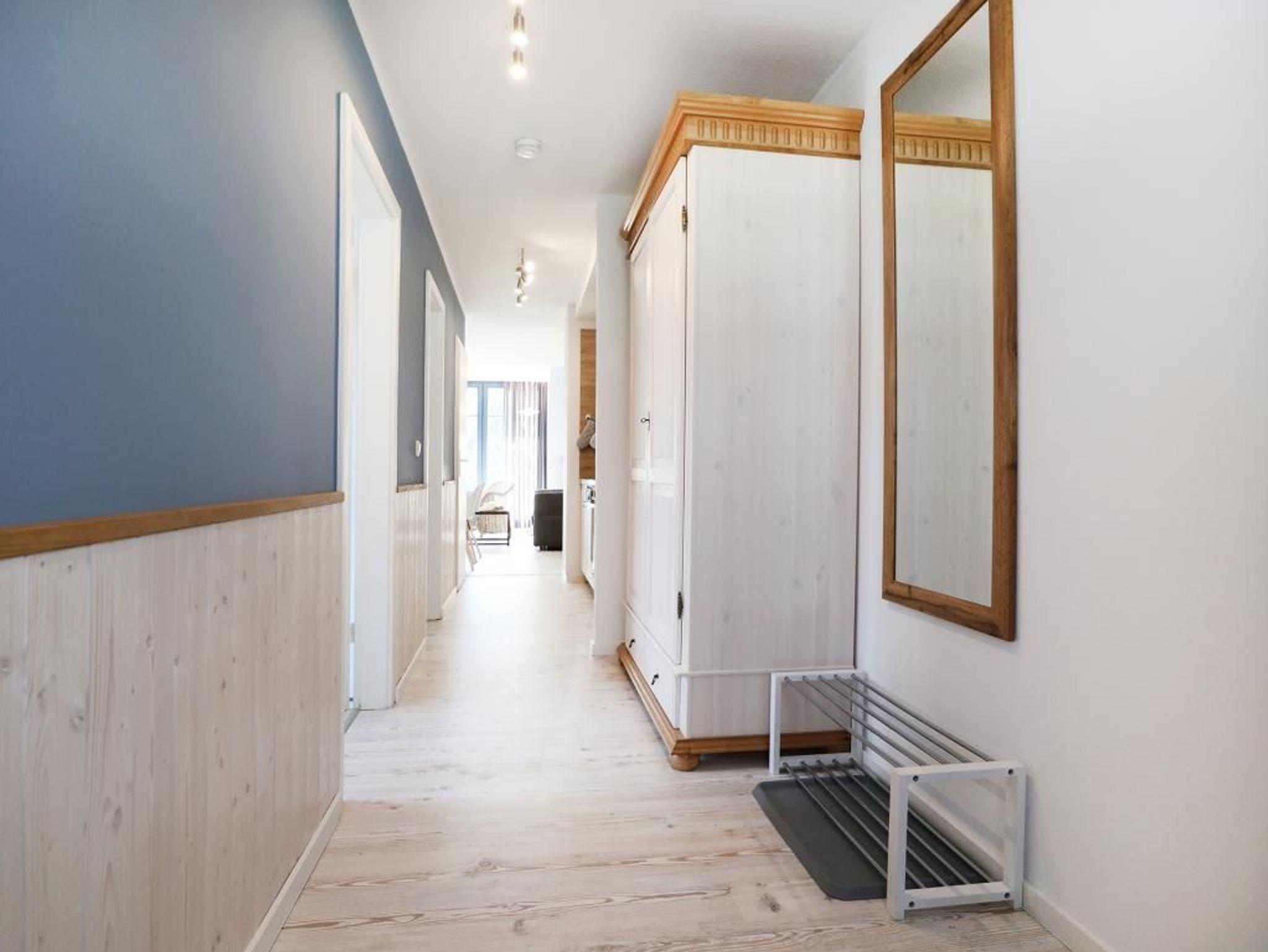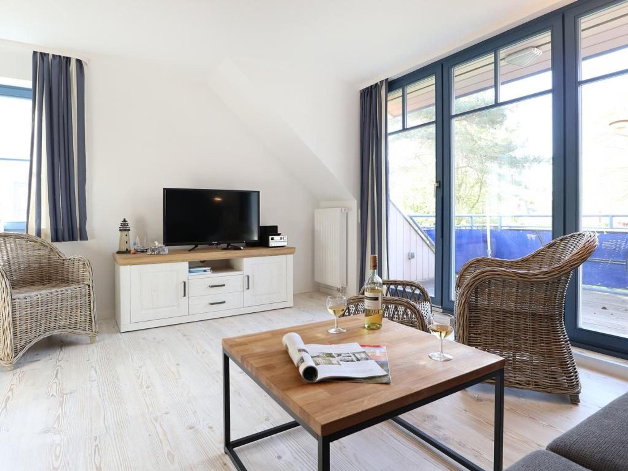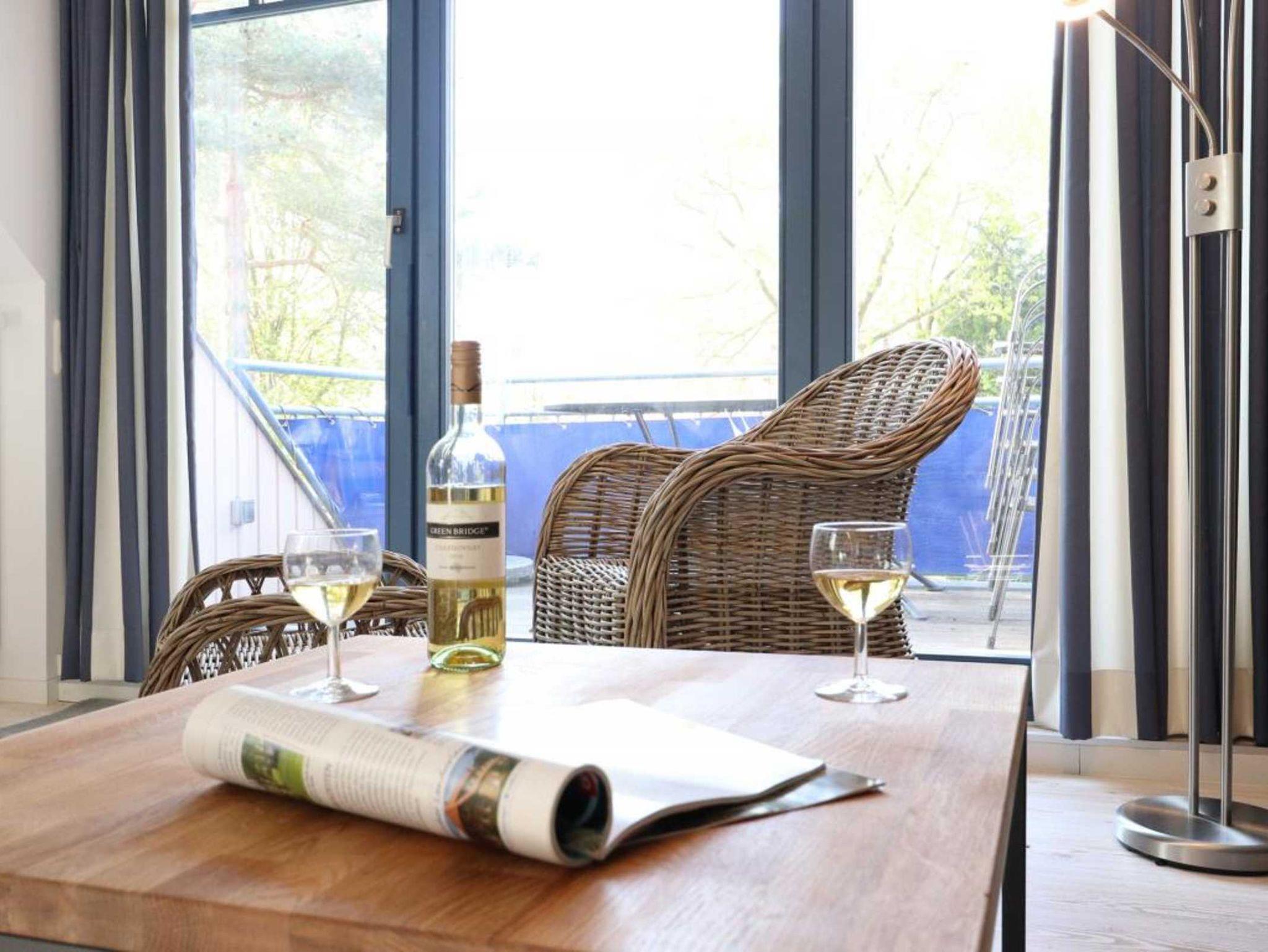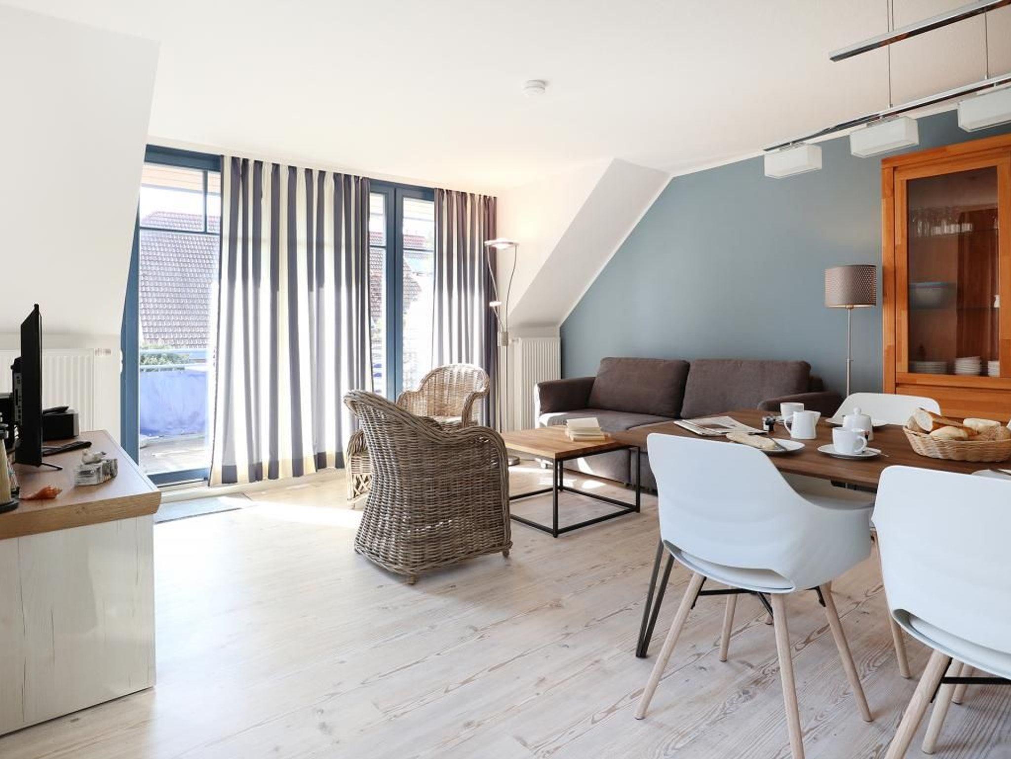 Die 4- Zimmer Maisonetten Ferienwohnung Papillon 12-5 ist ein komfortabel eingerichtetes Appartement mit einer Wohnfläche von 65qm. Eine Belegung kann mit bis zu 8 Personen erfolgen. Wir empfehlen eine max. Belegung mit bis zu 6 Gästen. Der großzügige Wohn-/Essbereich ist mit einem Sofa, ausziehbar als Schlafsofa mit zwei weiteren Schlafgelegenheiten sowie weiteren Sitzmöglichkeiten und einem großen Esstisch möbliert. Ein Fernsehgerät, DVD-Player, Musikanlage und kostenfreie WLAN- Nutzung bieten Abwechslung. Vom Wohnbereich gelangt man auf den saisonal möblierten Süd-Balkon. In der Wohnküche stehen Ceranherd, Backofen, Mikrowelle, Geschirrspüler sowie Kühlschrank mit integr. Gefrierfach, Kaffeemaschine, Toaster und Wasserkocher bereit. Ihre Mahlzeiten können Sie am Esstisch zu sich nehmen. Zudem befindet sich auf dieser Wohnebene ein separates Schlafzimmer mit zwei Einzelbetten, und Kleiderschrank. Das Duschbad ist mit zwei Waschtischen und WC ausgestattet. Über eine Treppe im Wohnbereich gelangen Sie in die obere Ebene mit zwei weiteren Schlafzimmern, welche jeweils mit einem Doppelbett, Kleiderschrank möbliert sind. Gegen Gebühr können Sie im Untergeschoß des Hauses Waschmaschine und Wäschetrockner nutzen. Ein Kinderhochstuhl befindet sich in der Wohnung. Ihren PKW parken Sie kostenfrei auf dem wohnungseigenen Außenstellplatz. Bitte beachten Sie, dass es sich um eine Nichtraucherwohnung handelt. Haustiere sind herzlich willkommen. Zur Ostsee gelangen Sie in nur ca. 250 Meter.