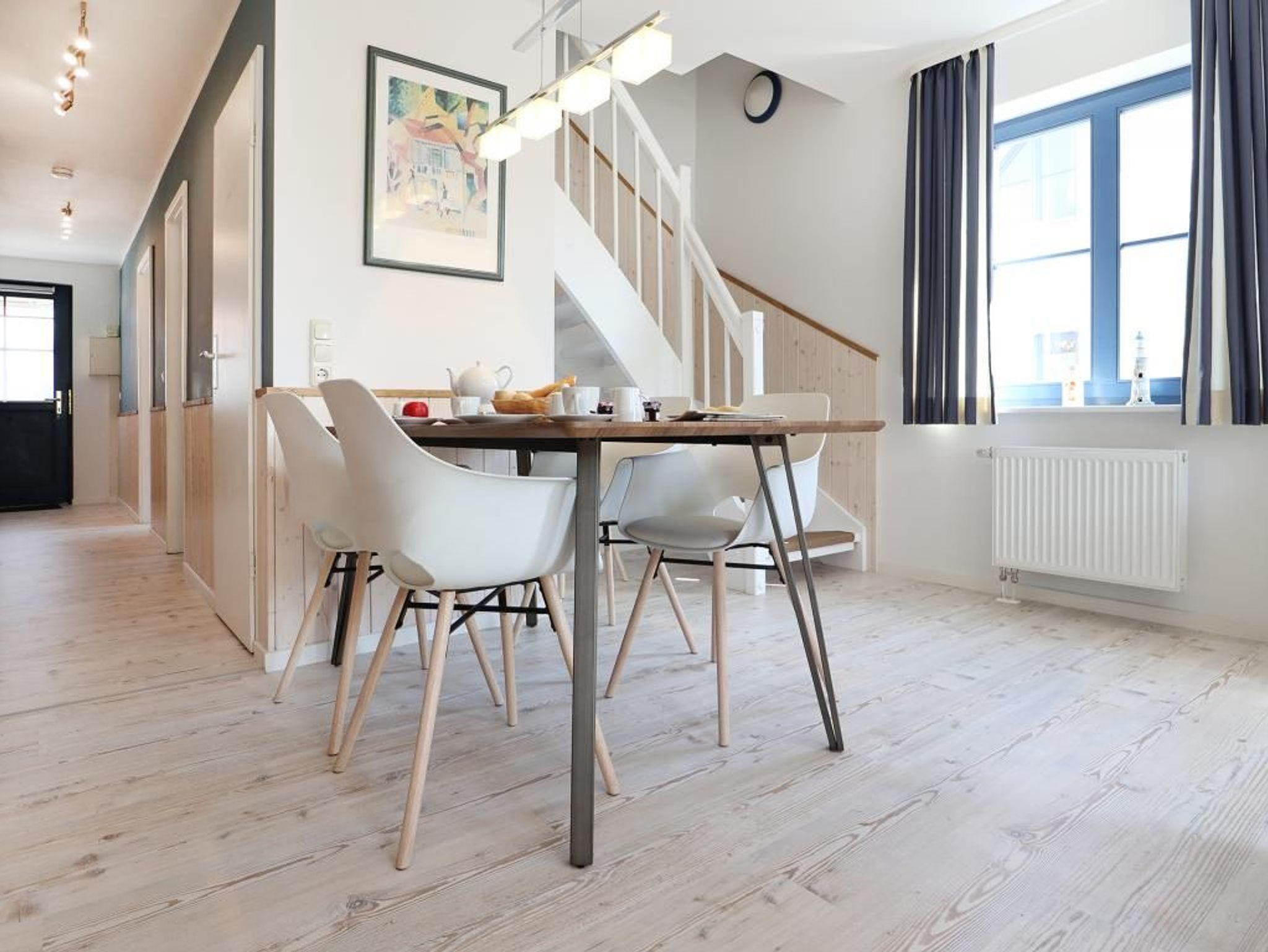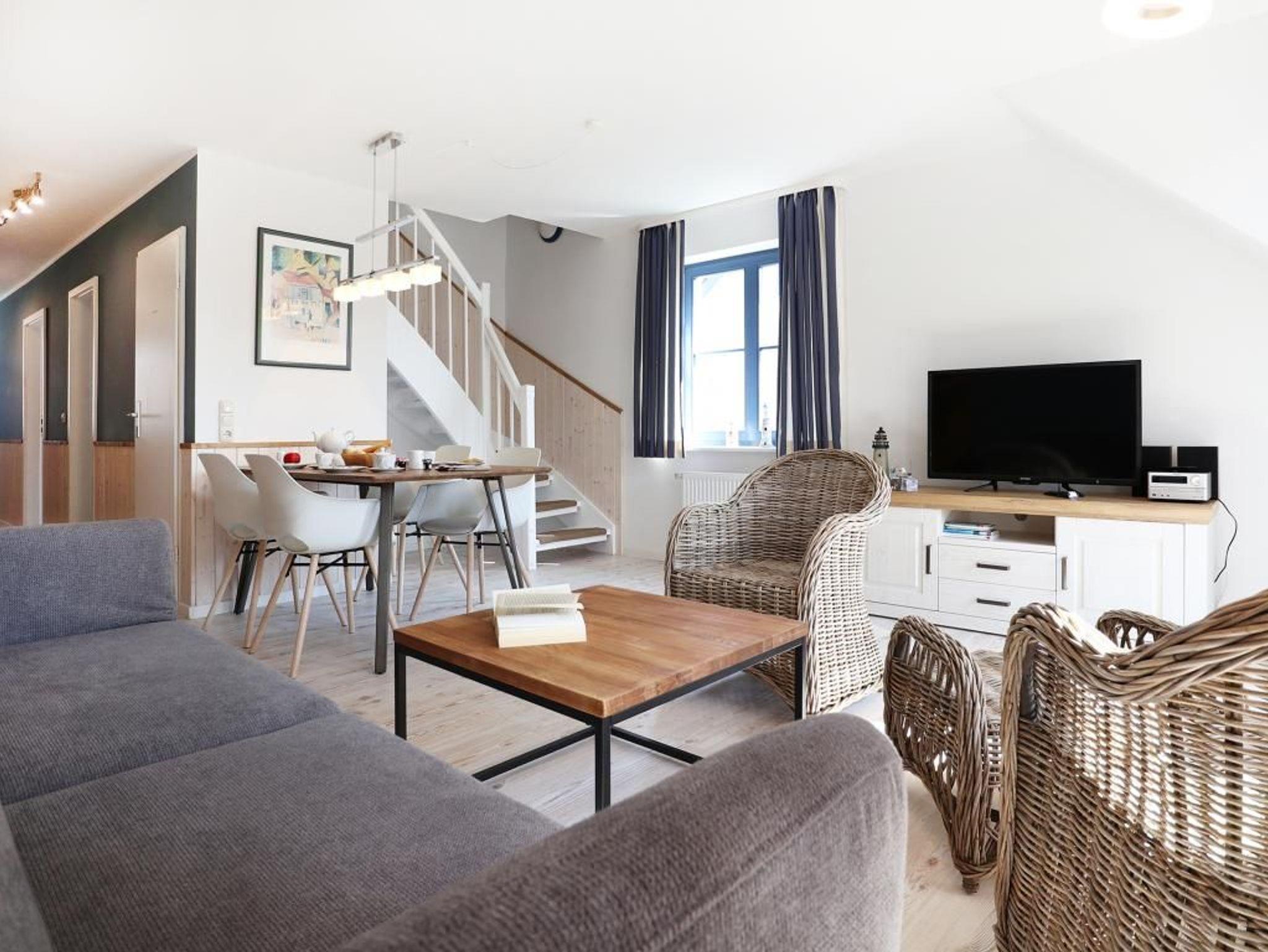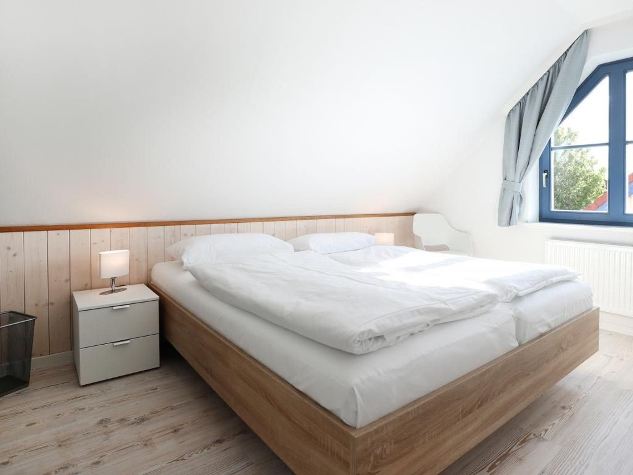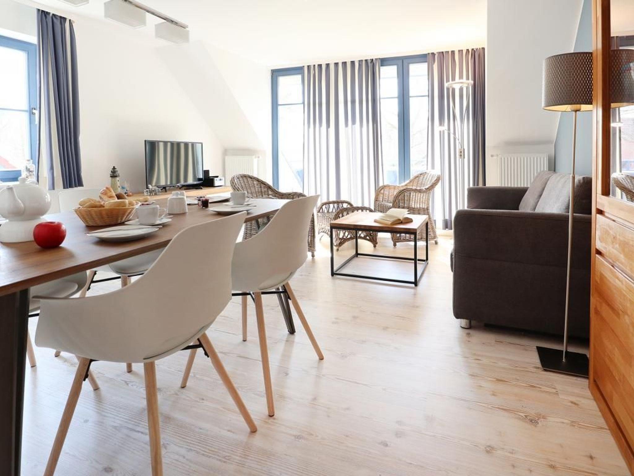 Die 4- Zimmer Maisonetten Ferienwohnung Papillon 12-5 ist ein komfortabel eingerichtetes Appartement mit einer Wohnfläche von 65qm. Eine Belegung kann mit bis zu 8 Personen erfolgen. Wir empfehlen eine max. Belegung mit bis zu 6 Gästen. Der großzügige Wohn-/Essbereich ist mit einem Sofa, ausziehbar als Schlafsofa mit zwei weiteren Schlafgelegenheiten sowie weiteren Sitzmöglichkeiten und einem großen Esstisch möbliert. Ein Fernsehgerät, DVD-Player, Musikanlage und kostenfreie WLAN- Nutzung bieten Abwechslung. Vom Wohnbereich gelangt man auf den saisonal möblierten Süd-Balkon. In der Wohnküche stehen Ceranherd, Backofen, Mikrowelle, Geschirrspüler sowie Kühlschrank mit integr. Gefrierfach, Kaffeemaschine, Toaster und Wasserkocher bereit. Ihre Mahlzeiten können Sie am Esstisch zu sich nehmen. Zudem befindet sich auf dieser Wohnebene ein separates Schlafzimmer mit zwei Einzelbetten, und Kleiderschrank. Das Duschbad ist mit zwei Waschtischen und WC ausgestattet. Über eine Treppe im Wohnbereich gelangen Sie in die obere Ebene mit zwei weiteren Schlafzimmern, welche jeweils mit einem Doppelbett, Kleiderschrank möbliert sind. Gegen Gebühr können Sie im Untergeschoß des Hauses Waschmaschine und Wäschetrockner nutzen. Ein Kinderhochstuhl befindet sich in der Wohnung. Ihren PKW parken Sie kostenfrei auf dem wohnungseigenen Außenstellplatz. Bitte beachten Sie, dass es sich um eine Nichtraucherwohnung handelt. Haustiere sind herzlich willkommen. Zur Ostsee gelangen Sie in nur ca. 250 Meter.