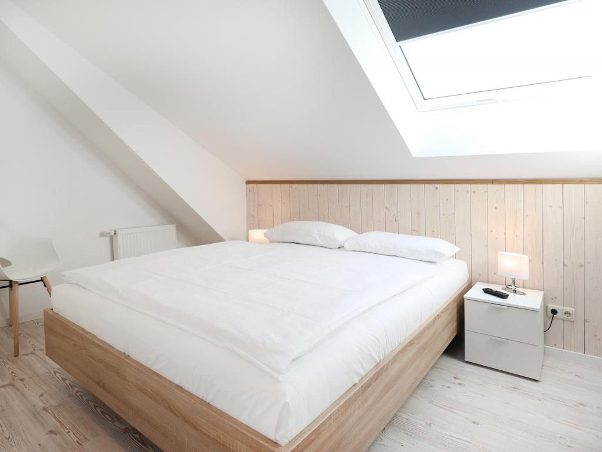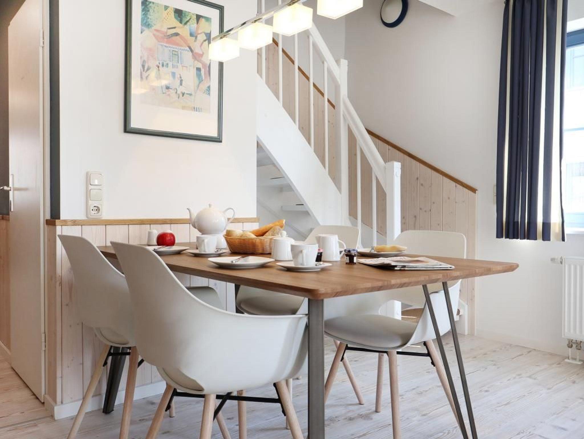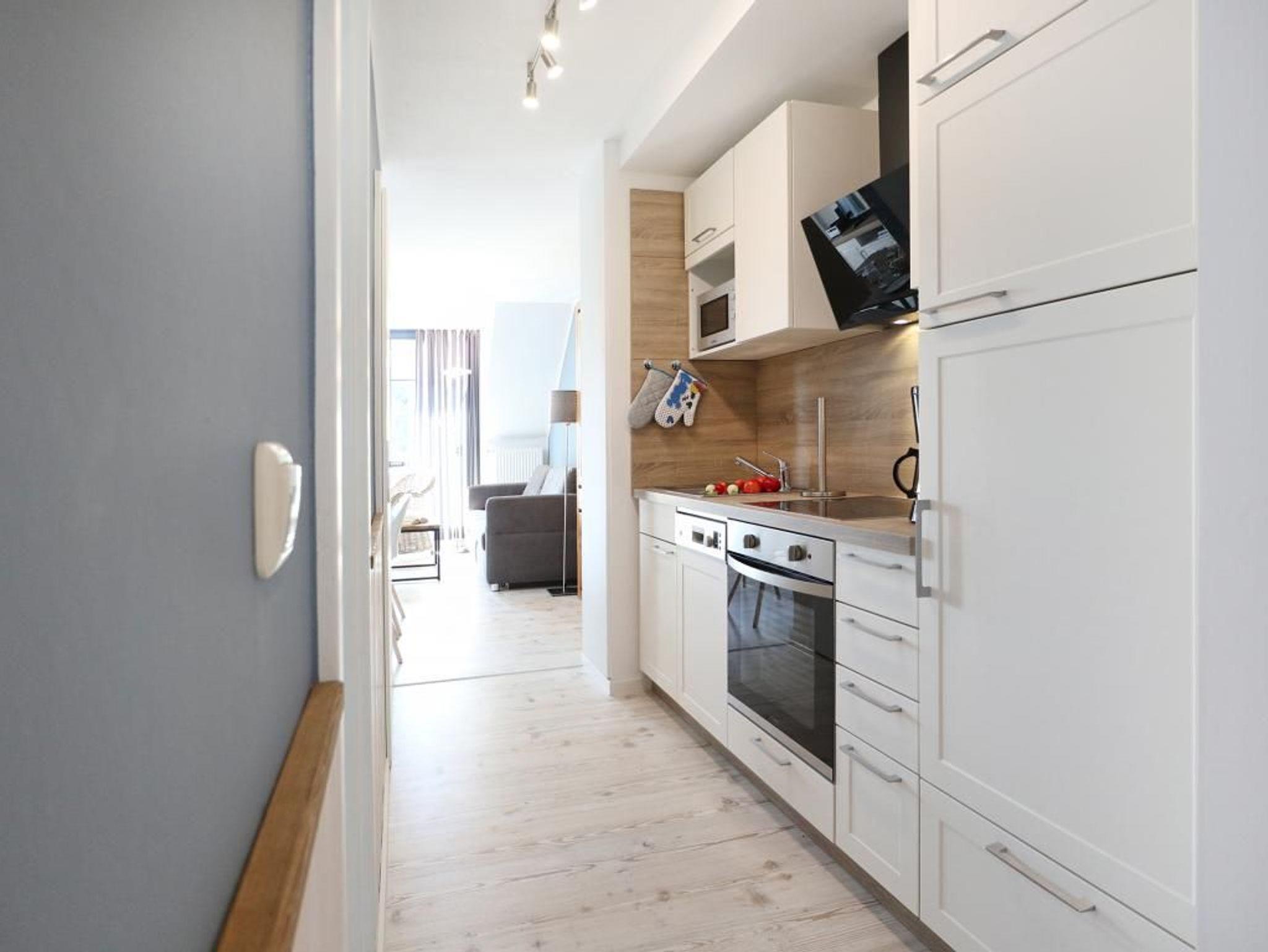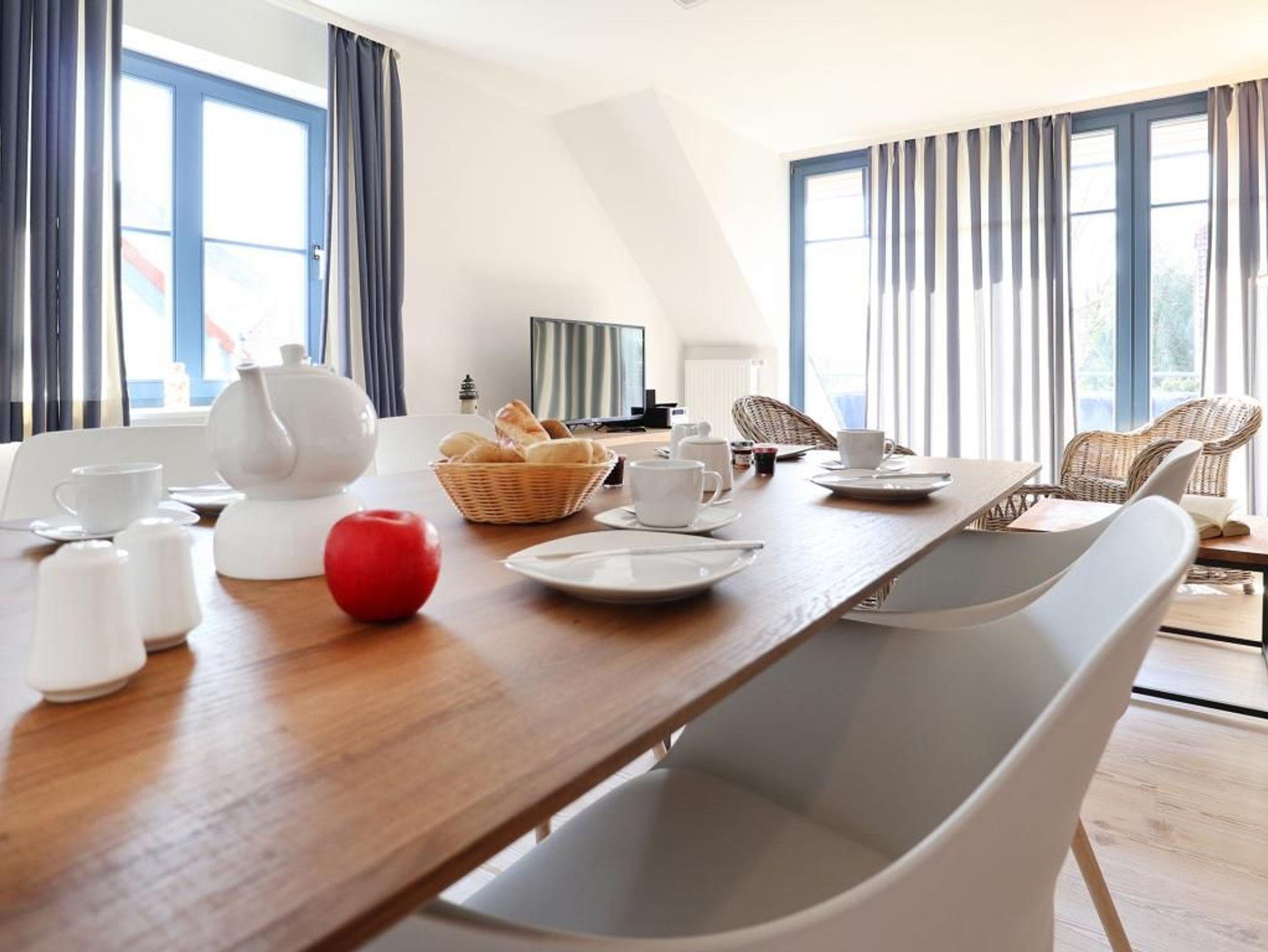 Die 4- Zimmer Maisonetten Ferienwohnung Papillon 12-5 ist ein komfortabel eingerichtetes Appartement mit einer Wohnfläche von 65qm. Eine Belegung kann mit bis zu 8 Personen erfolgen. Wir empfehlen eine max. Belegung mit bis zu 6 Gästen. Der großzügige Wohn-/Essbereich ist mit einem Sofa, ausziehbar als Schlafsofa mit zwei weiteren Schlafgelegenheiten sowie weiteren Sitzmöglichkeiten und einem großen Esstisch möbliert. Ein Fernsehgerät, DVD-Player, Musikanlage und kostenfreie WLAN- Nutzung bieten Abwechslung. Vom Wohnbereich gelangt man auf den saisonal möblierten Süd-Balkon. In der Wohnküche stehen Ceranherd, Backofen, Mikrowelle, Geschirrspüler sowie Kühlschrank mit integr. Gefrierfach, Kaffeemaschine, Toaster und Wasserkocher bereit. Ihre Mahlzeiten können Sie am Esstisch zu sich nehmen. Zudem befindet sich auf dieser Wohnebene ein separates Schlafzimmer mit zwei Einzelbetten, und Kleiderschrank. Das Duschbad ist mit zwei Waschtischen und WC ausgestattet. Über eine Treppe im Wohnbereich gelangen Sie in die obere Ebene mit zwei weiteren Schlafzimmern, welche jeweils mit einem Doppelbett, Kleiderschrank möbliert sind. Gegen Gebühr können Sie im Untergeschoß des Hauses Waschmaschine und Wäschetrockner nutzen. Ein Kinderhochstuhl befindet sich in der Wohnung. Ihren PKW parken Sie kostenfrei auf dem wohnungseigenen Außenstellplatz. Bitte beachten Sie, dass es sich um eine Nichtraucherwohnung handelt. Haustiere sind herzlich willkommen. Zur Ostsee gelangen Sie in nur ca. 250 Meter.