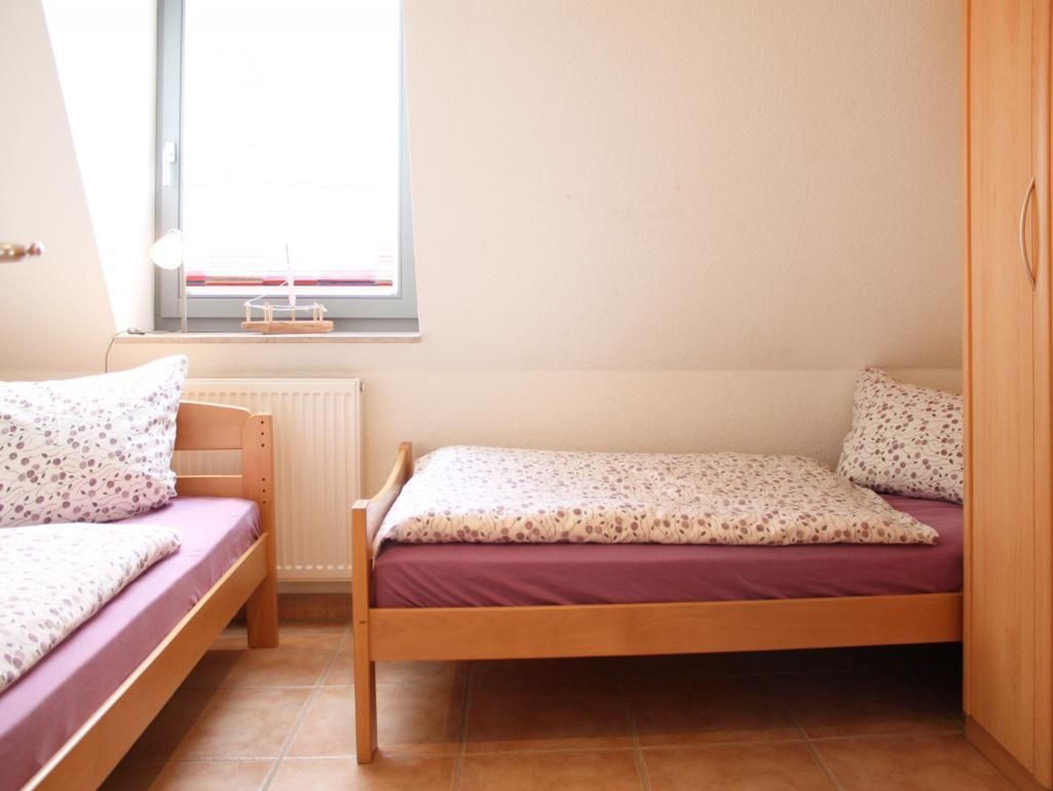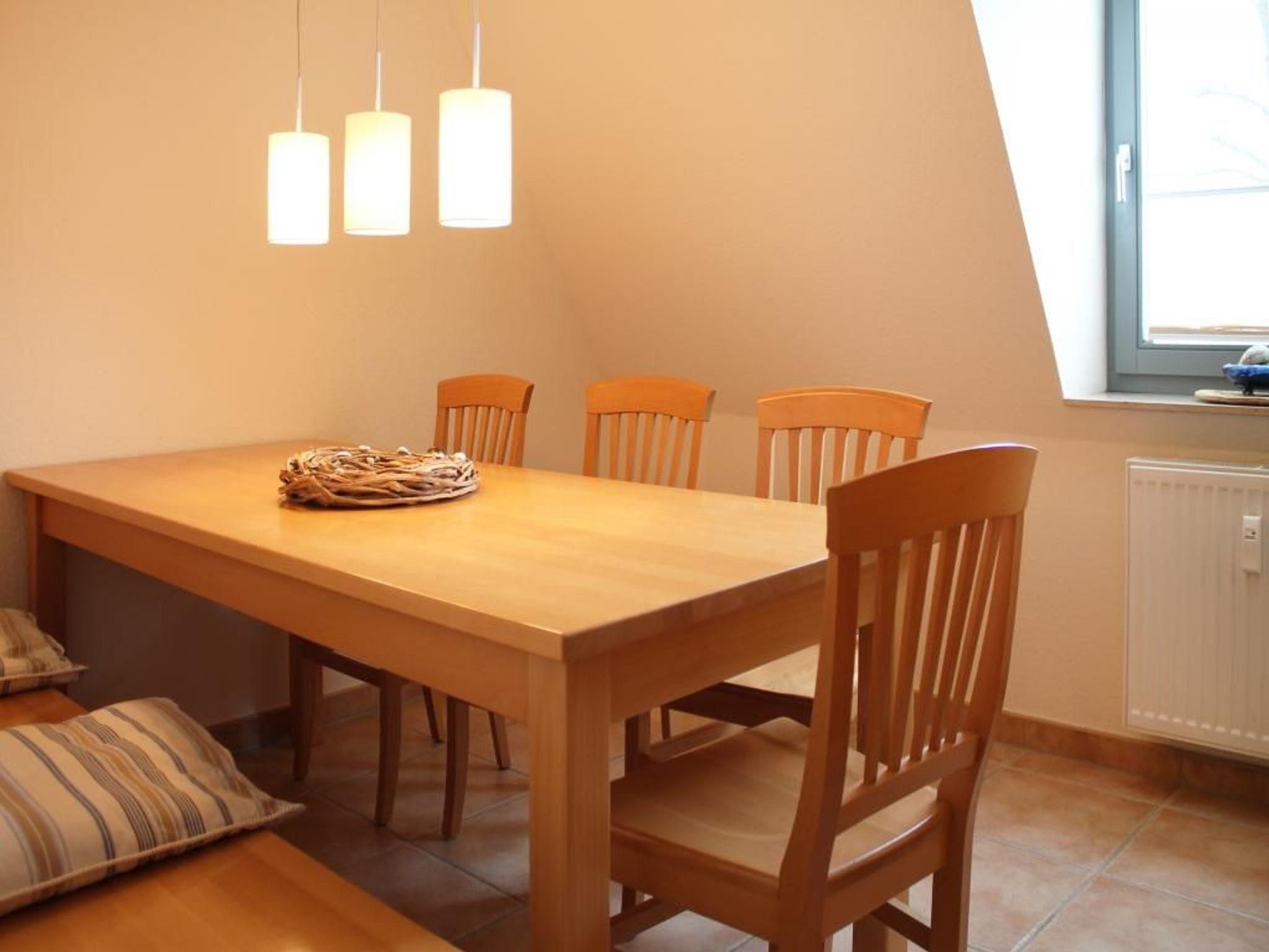 Die komfortabel ausgestattete 5-Zimmer Maisonettenwohnung mit Balkon, befindet sich im 2. Obergeschoss. Die Wohnung besitzt eine Wohnfläche von 65qm und kann mit max. 6 Personen gebucht werden. Wir empfehlen eine Belegung mit max. 5 Personen. Im geräumigen Wohnbereich erwartet Sie eine Sofagarnitur mit Beistelltisch sowie Fernseher und Musikanlage. Die Ferienwohnung bietet Ihnen ein gemütliches, separates Esszimmer. Bitte beachten Sie, dass in diesem Appartement kein WLAN zur Verfügung steht.