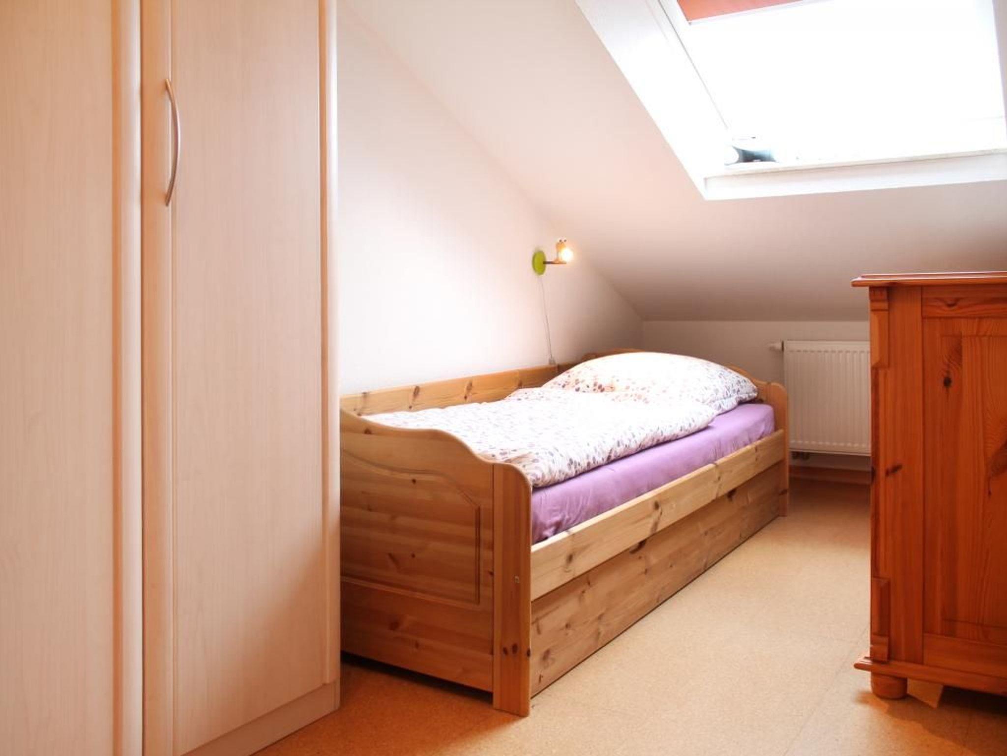Zudem befindet sich auf der Wohnebene ein separates Schlafzimmer mit zwei Einzelbetten und Kleiderschrank. Ebenso ist ein kleines Duschbad mit Waschtisch und WC auf dieser Ebene vorhanden.