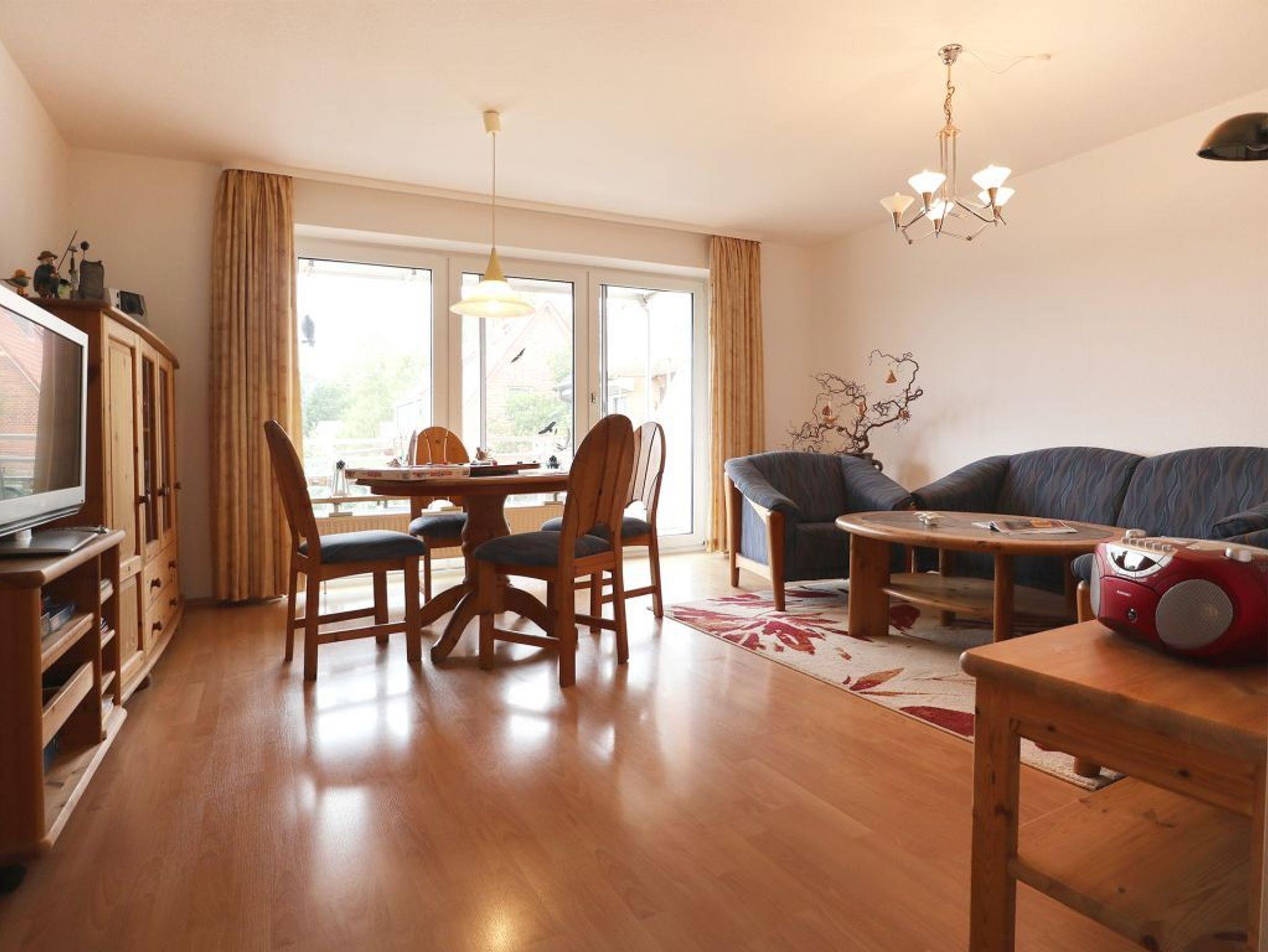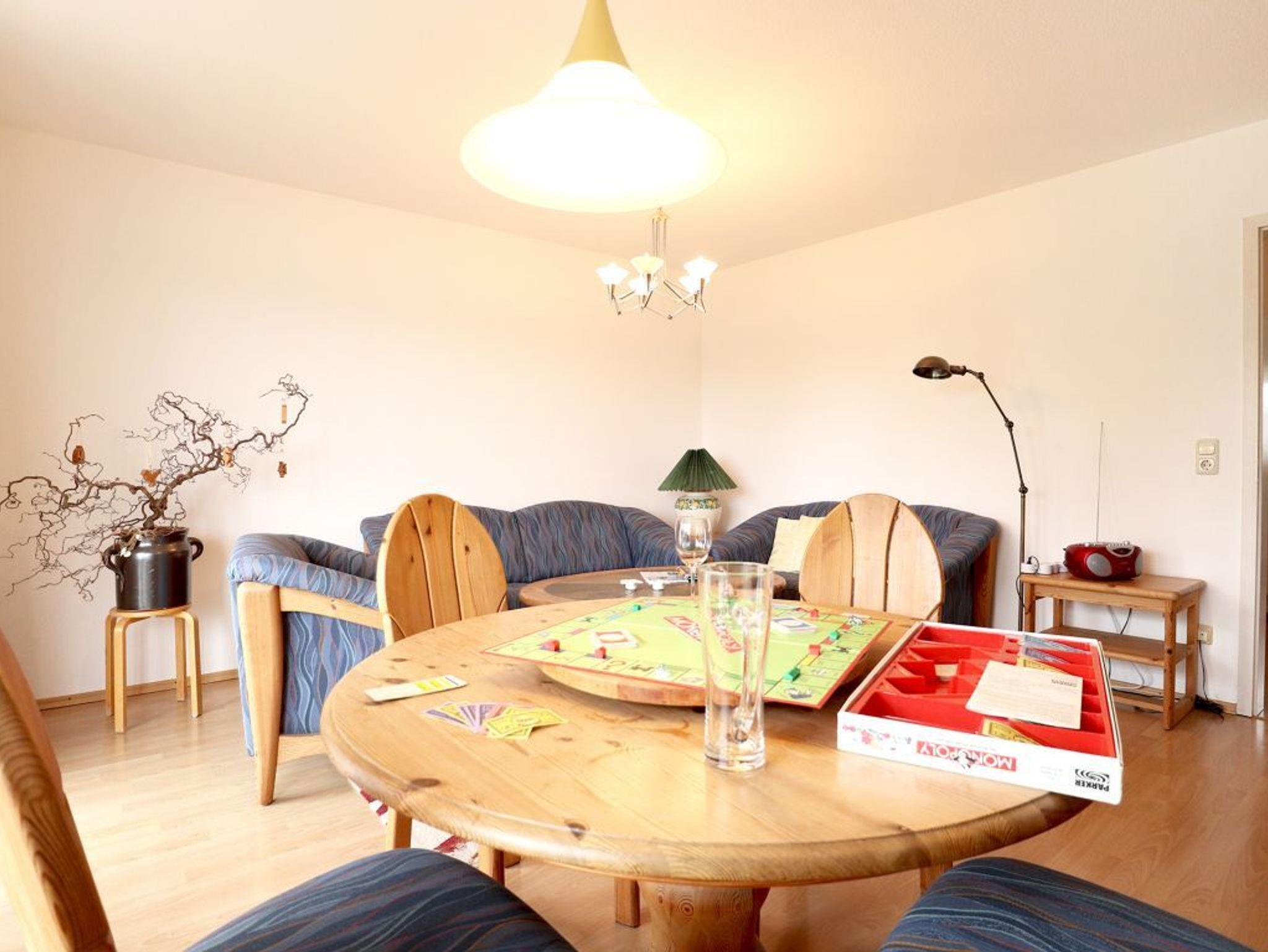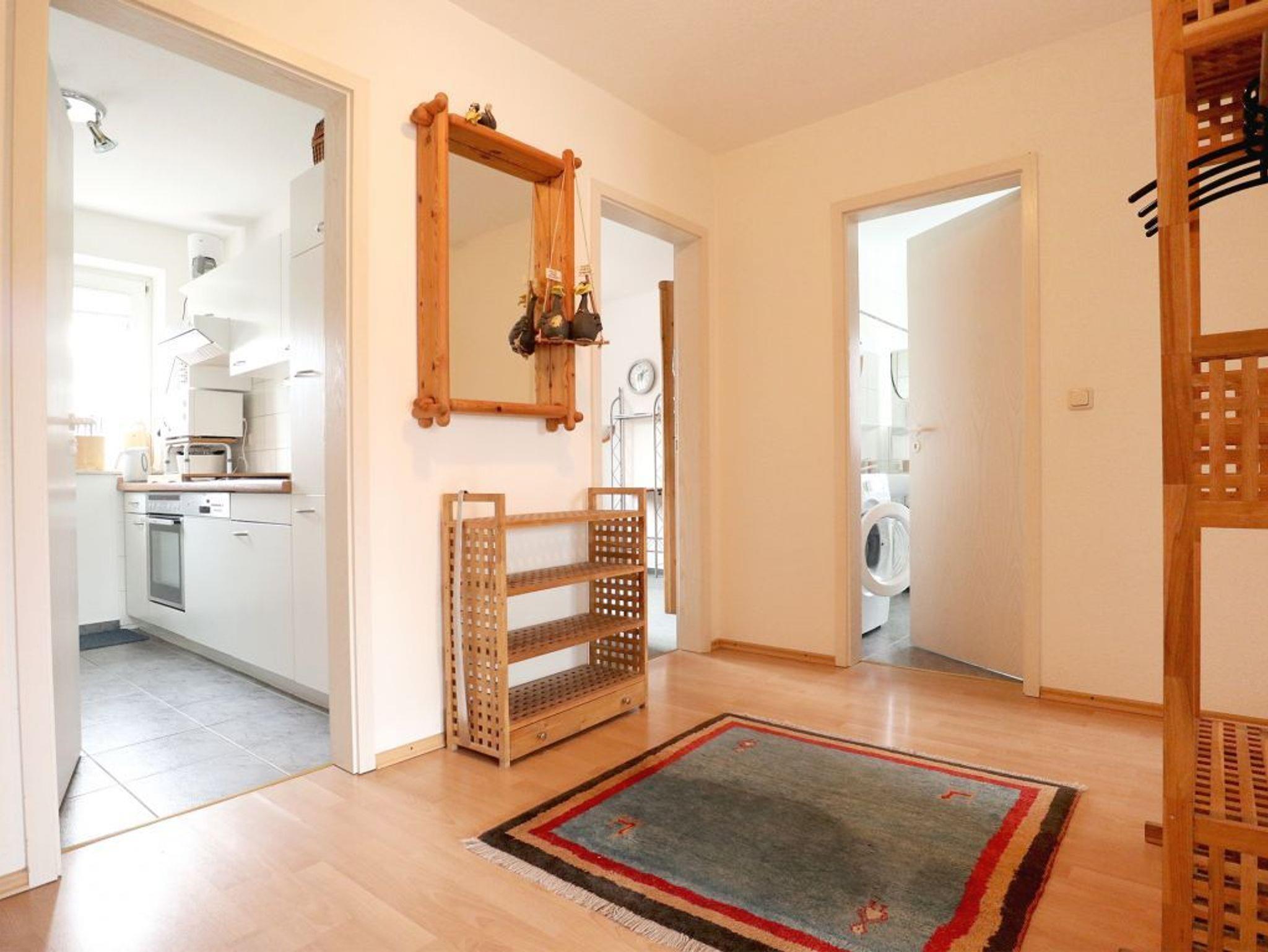 Es empfängt Sie ein komfortabel, mit Vollholzmöbeln eingerichteter Wohn-/Essbereich. Ein gemütliches Sofa, ein Esstisch, Fernseher, DVD-Player sowie Musikanlage laden zu erholsamen Stunden ein. Die separate Küche ist ideal für die Eigenversorgung: Herd, Backofen, Mikrowelle, Dunstabzug, Kühlschrank mit integr. Frostfach, Kaffeemaschine, Wasserkocher, Toaster sowie Geschirrspüler u.v.m. sind vorhanden. Ihr Frühstück können Sie direkt an einem kleinen Essplatz in der Küche genießen und Ihre Mahlzeiten nehmen Sie am großen Esstisch im Wohnbereich zu sich. Während der wärmeren Jahreszeit lädt der saisonal möblierte Balkon zum Entspannen ein, den Sie vom Wohnzimmer aus betreten.
