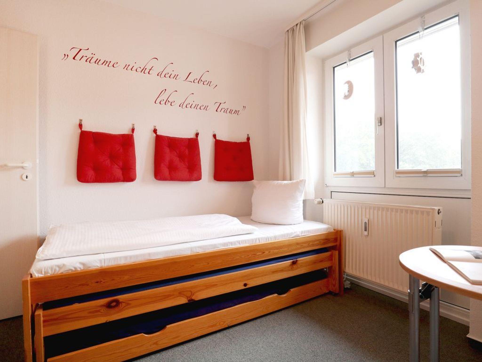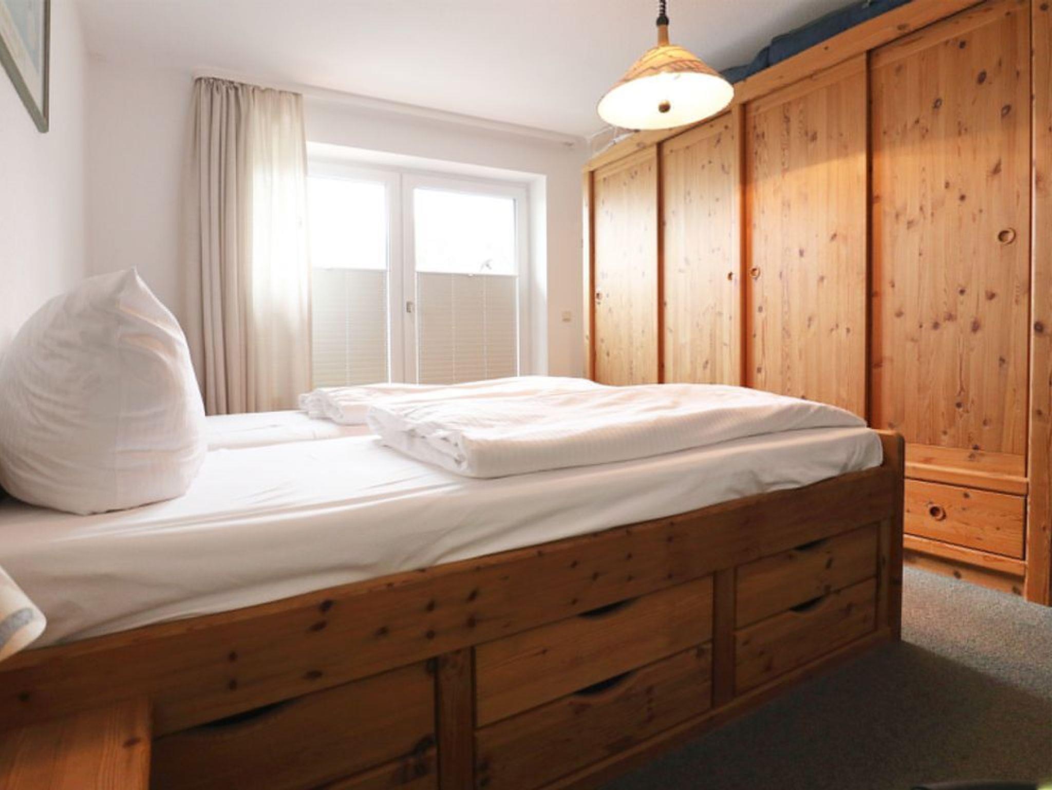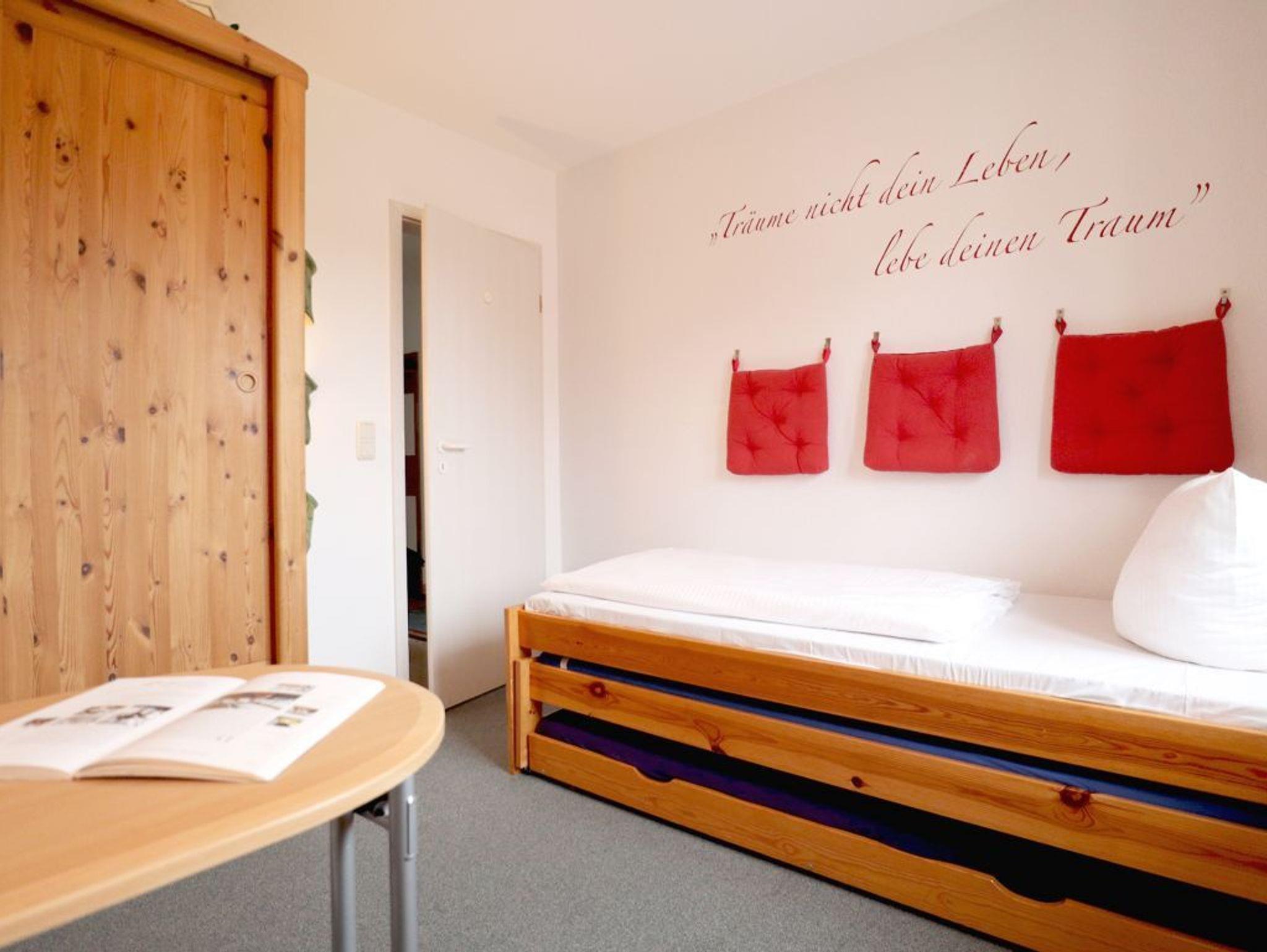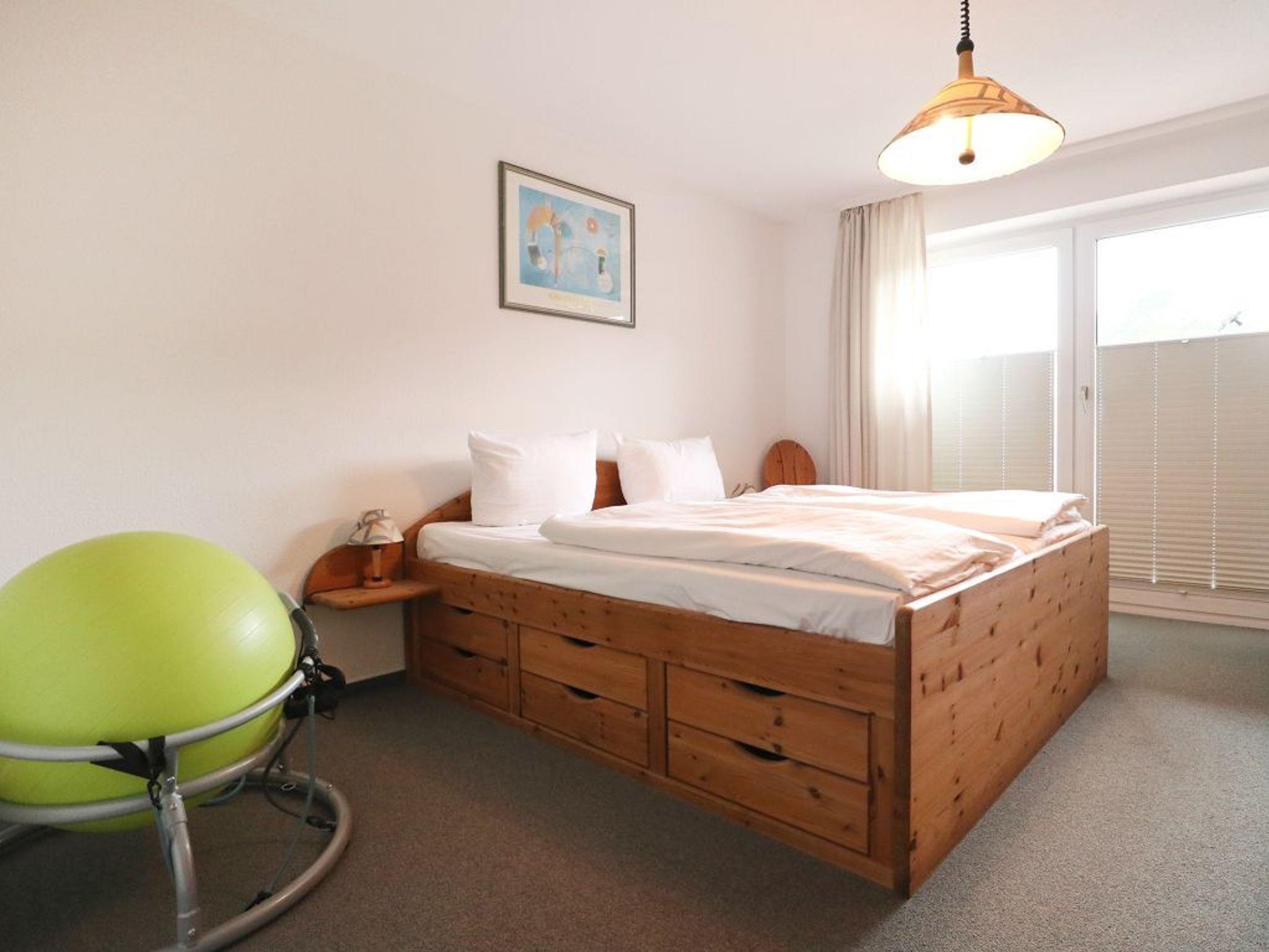 Im geräumigen Schlafzimmer erwartet Sie ein bequemes Doppelbett und für Ihre Urlaubsgarderobe nutzen Sie einen großen Kleiderschrank. Das zweite Schlafzimmer ist mit einem Einzelbett, einem Schrank und einem Tisch möbliert. Als inklusive Leistung sind die Betten bei Anreise bereits für Sie bezogen. Ebenso stehen in der Wohnung ein Bügelbrett und Bügeleisen bereit.