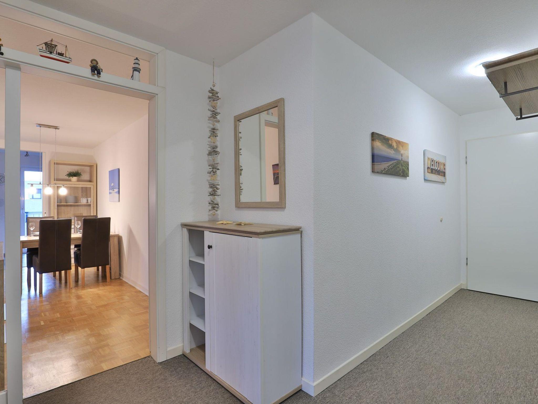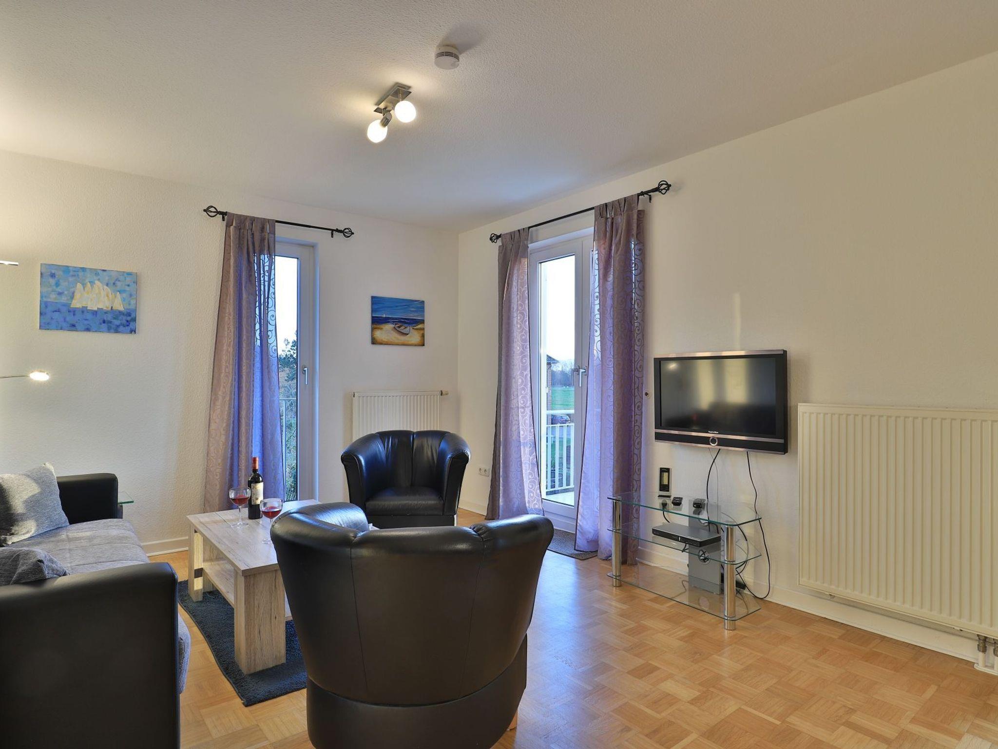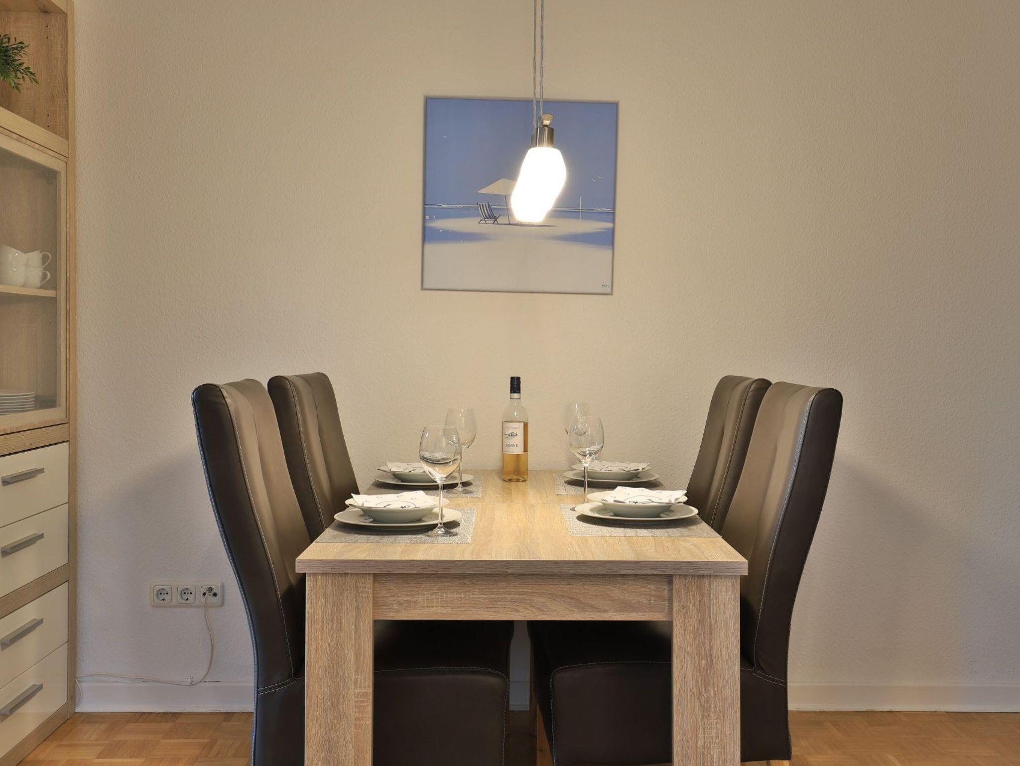 Das 3-Zimmer Appartement Seeschwalbe 8, bietet Ihnen eine Wohnfläche von ca.74qm und ist bestens geeignet für eine Belegung mit bis zu 4 Personen. Mit dem Fahrstuhl gelangen Sie bequem in das 1.Obergeschoss. Das komfortabel möblierte Wohn- und Esszimmer ist mit einer Sofagarnitur, Beistelltisch, Esstisch mit vier Sitzplätzen sowie Fernseher und Musikanlage ausgestattet. WLAN kann gebührenfrei genutzt werden. Vom Wohnbereich aus gelangen Sie auf den saisonal möblierten Balkon. Die voll ausgestattete Küche ist separat und bestens geeignet, um sich eigenständig zu versorgen. Ceranfeldherd, Backofen, Mikrowelle, Kühlschrank mit integr. Gefrierfach, Kaffeemaschine, Wasserkocher, Toaster usw. Ihre Nächte verbringen Sie in zwei separaten Schlafzimmern. Eines ist mit einem Doppelbett und Kleiderschrank möbliert. Das zweite Schlafzimmer lädt mit zwei Einzelbetten, Kleiderschrank und einem zweiten Fernseher zum Wohlfühlen ein. Die familienfreundliche Ausstattung umfasst einen Kinderhochstuhl und Kinderbett. Zugehörig ist ein modernisiertes Vollbad mit Wanne und darin integr.Duschfunkton, Waschtisch, Handtuchheizung, Föhn, WC.